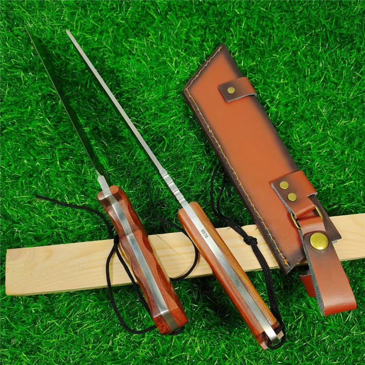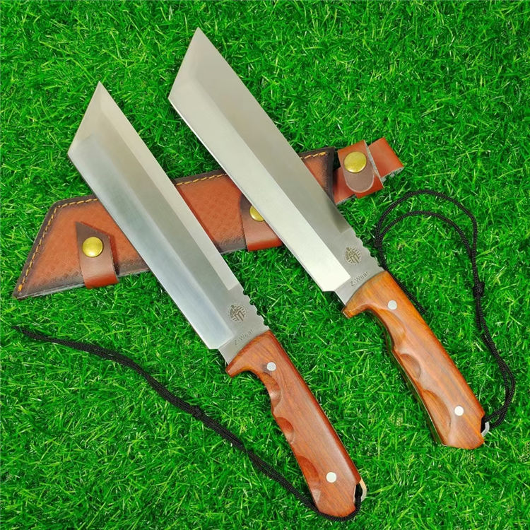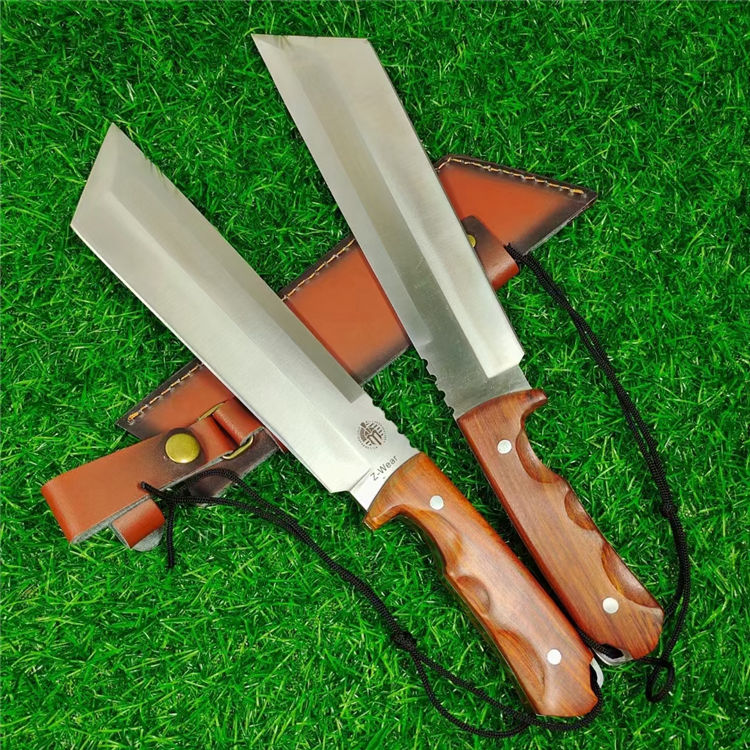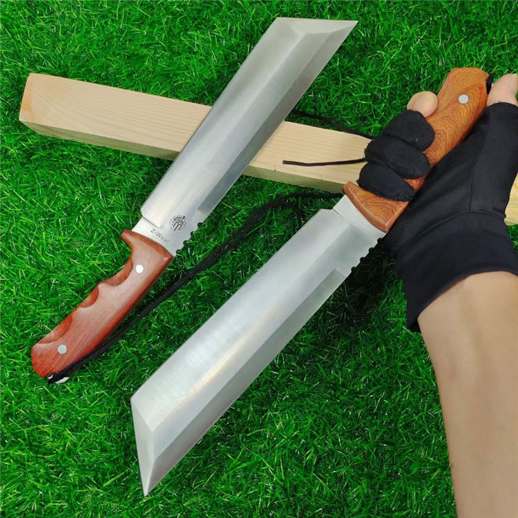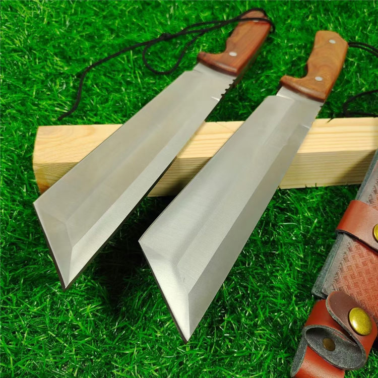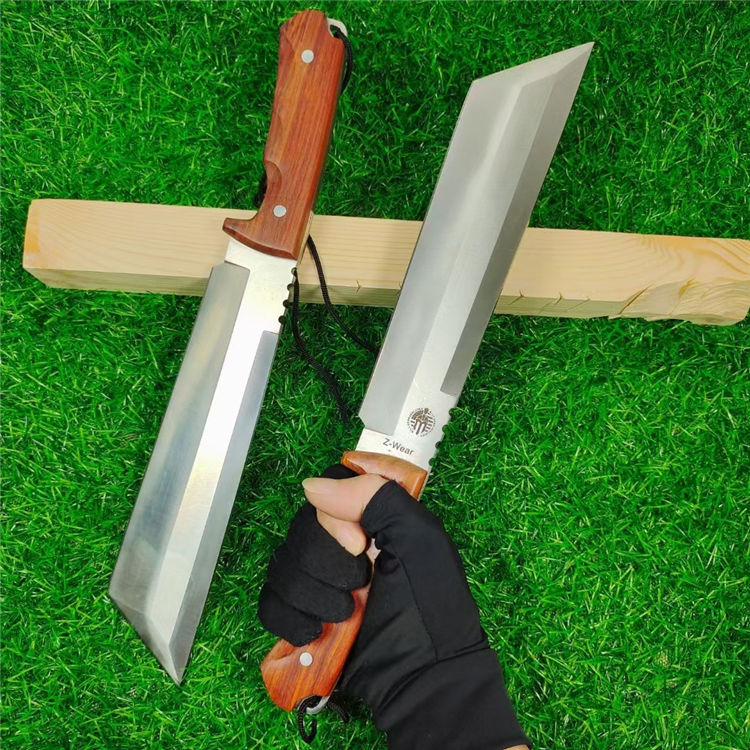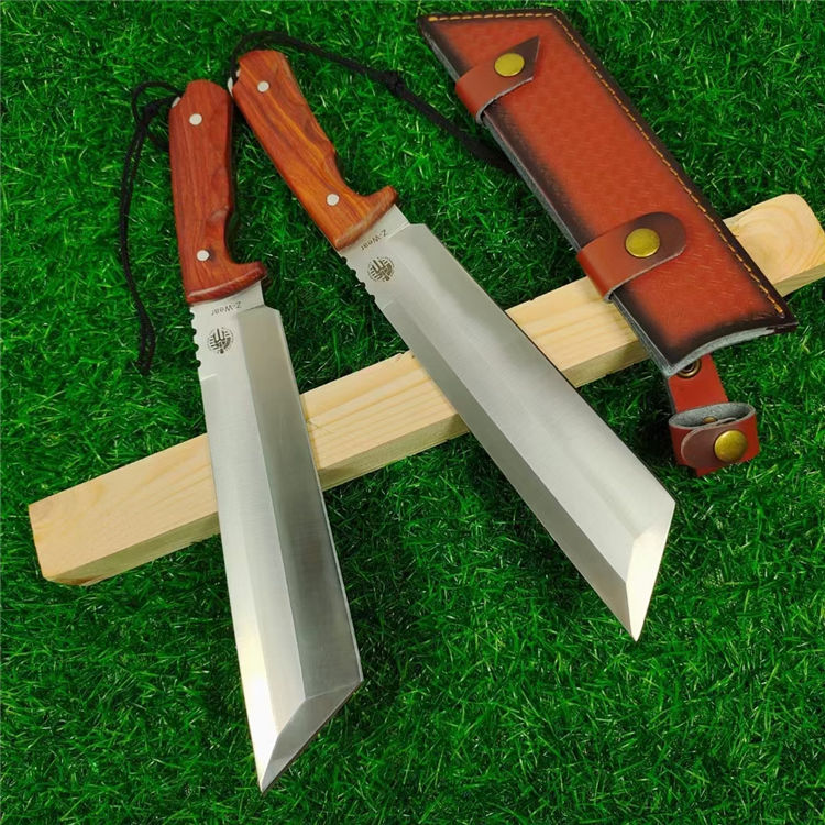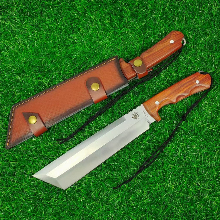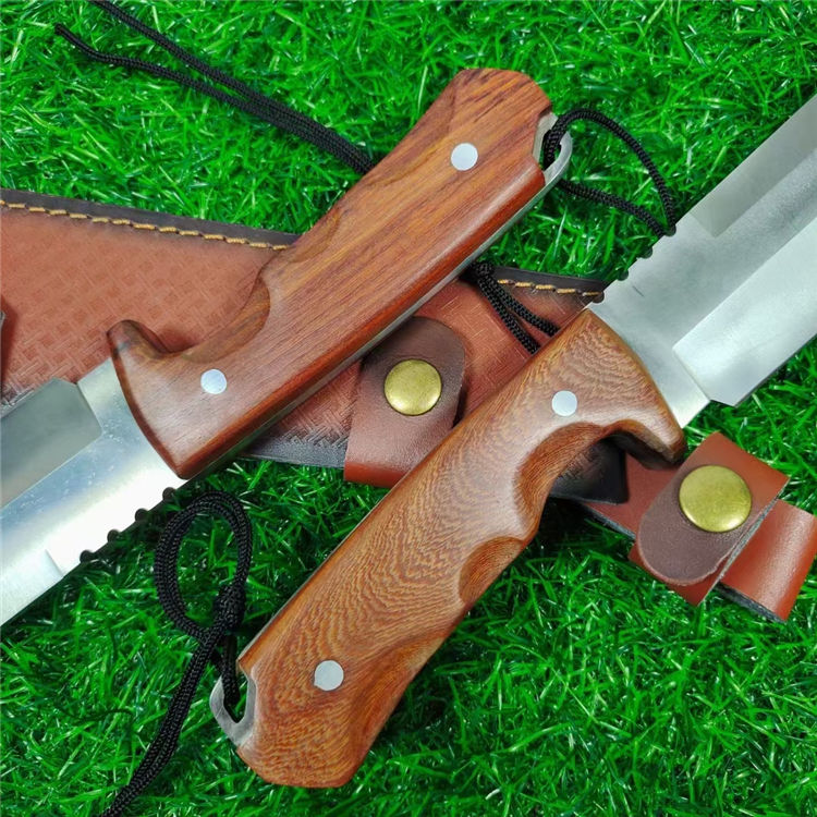 平头哥屠魔直刀 全长:36cm 刃长:23cm 柄长:13cm 厚度:6mm 宽度:5.2cm 材料:DC53钢 手柄:血檀木 硬度:60HRC 净重:572g 配件:皮套