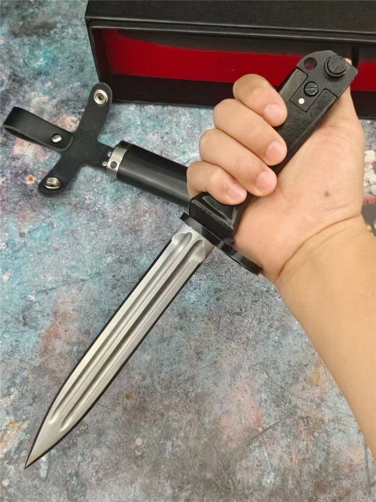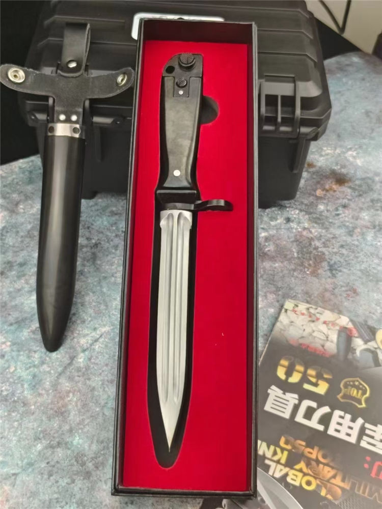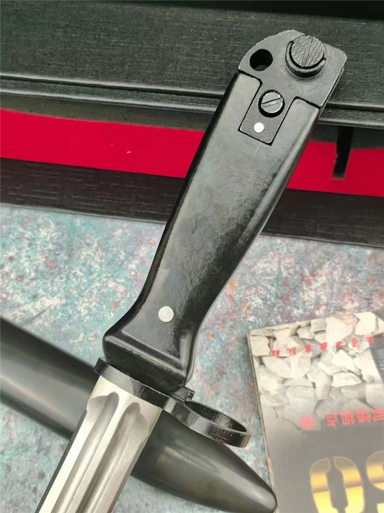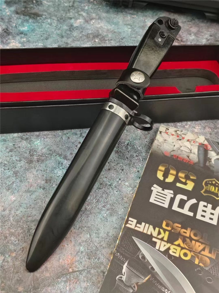 黑曜版精装八一军刺 全长:29.8cm 柄长:12.8cm 刃长:17cm 刃宽:2.3cm 刃厚:12mm 硬度:60HRC 表面:砂光 刃材:军用钵(合金钢) 鞘材:军用ABS 柄材:电木+钢 总重:320g