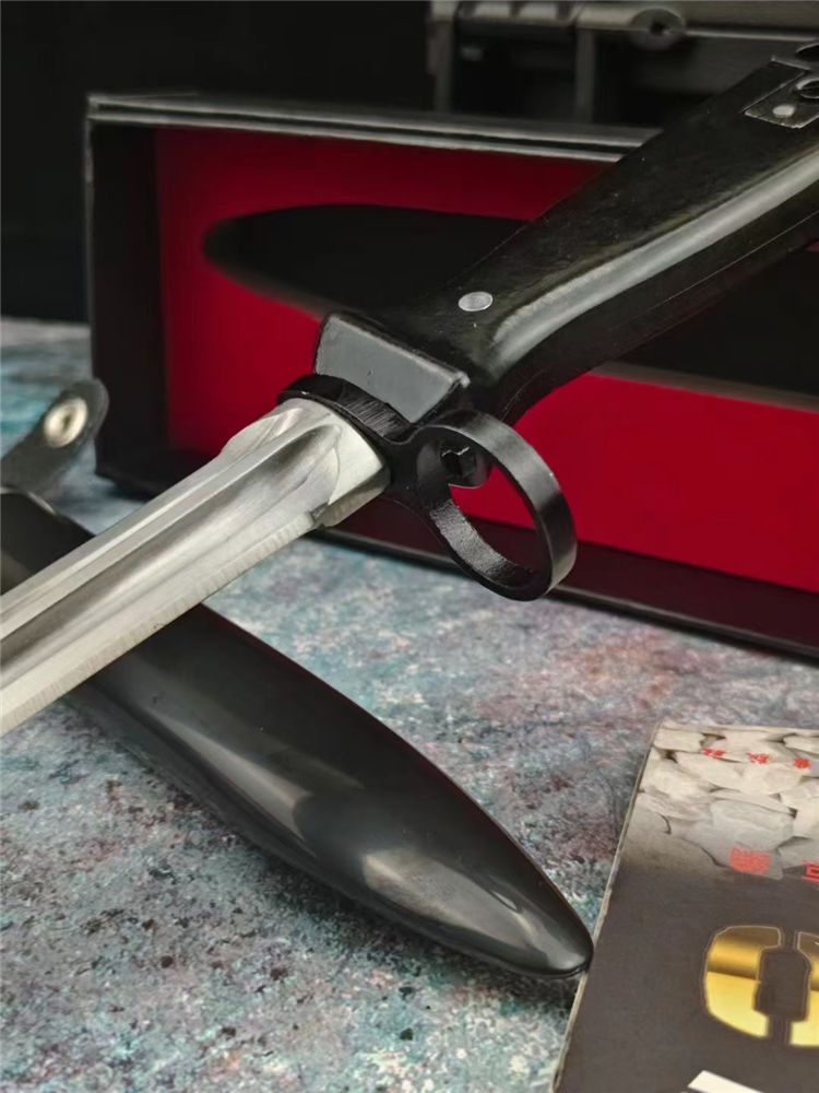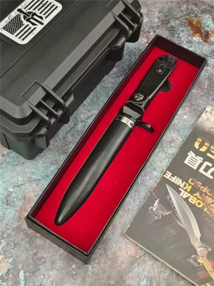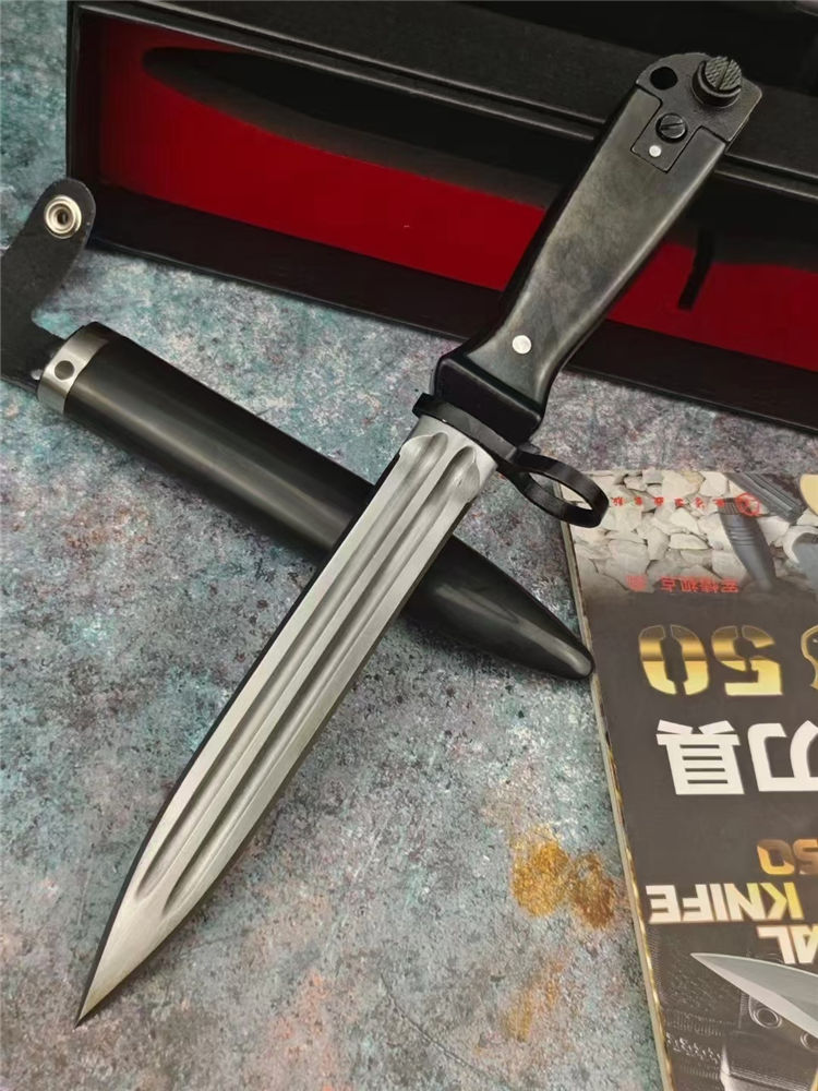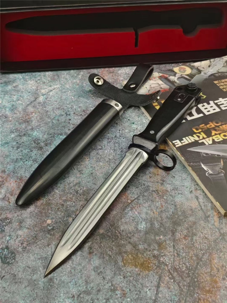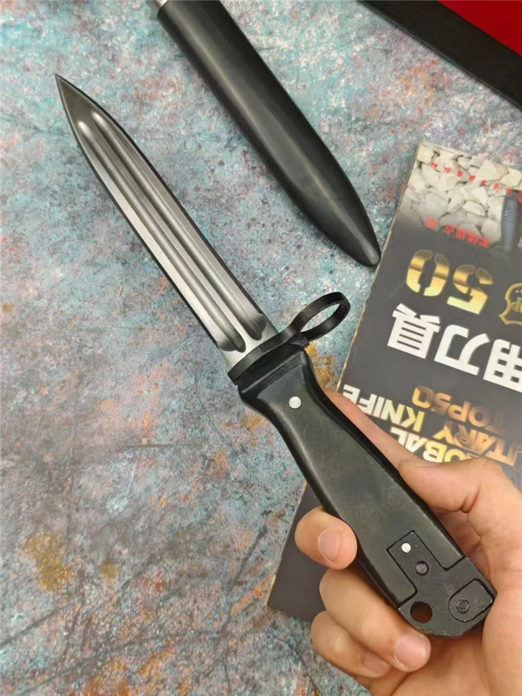 黑曜版精装八一军刺 全长:29.8cm 柄长:12.8cm 刃长:17cm 刃宽:2.3cm 刃厚:12mm 硬度:60HRC 表面:砂光 刃材:军用钵(合金钢) 鞘材:军用ABS 柄材:电木+钢 总重:320g