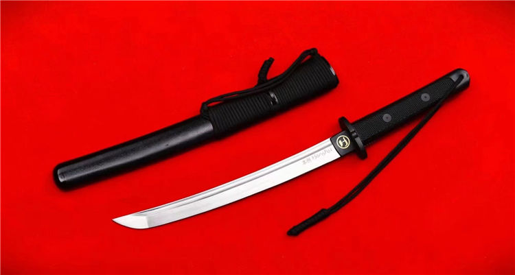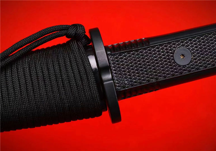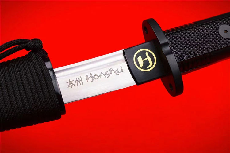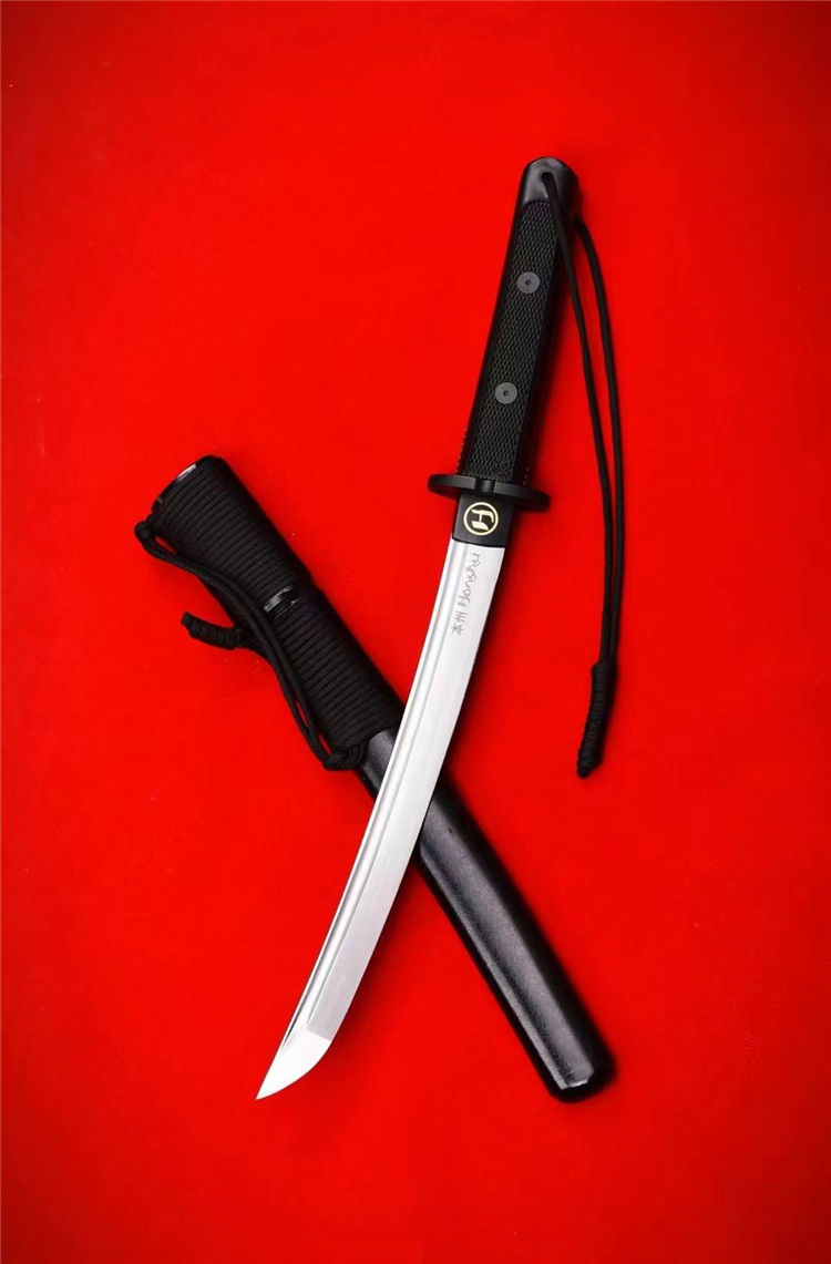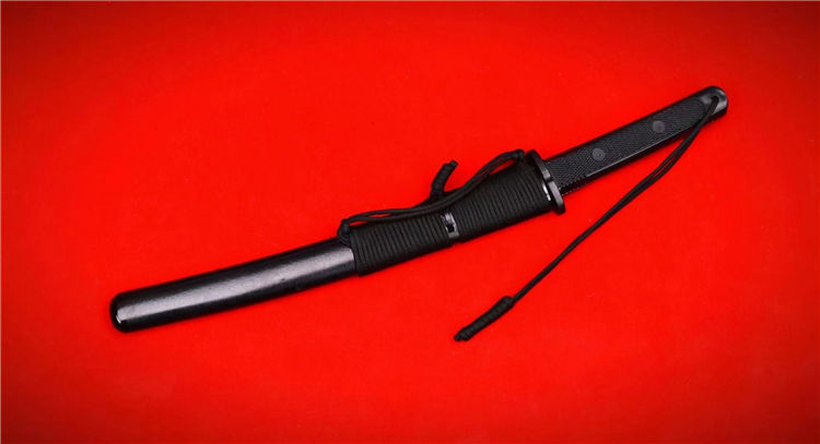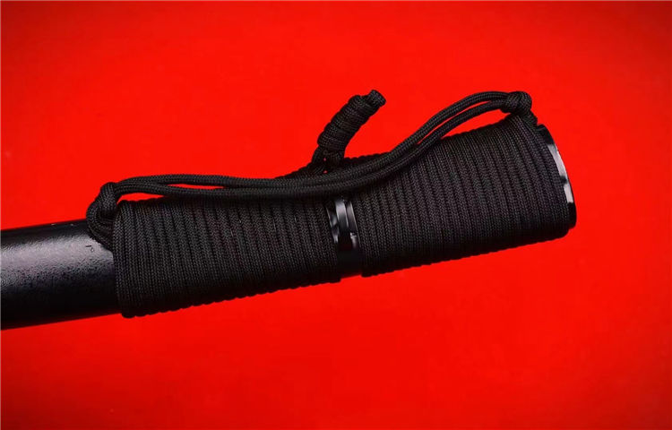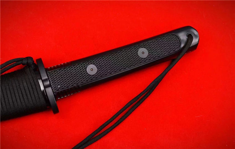 本州战术短款黑武士刀 全长:52.6cm 刃长:28.7cm 刀身:1095进口钢锻造,手工拉丝,柄为色ABS 柄绳为特种作战伞兵绳,纯铜刀盘刀夹