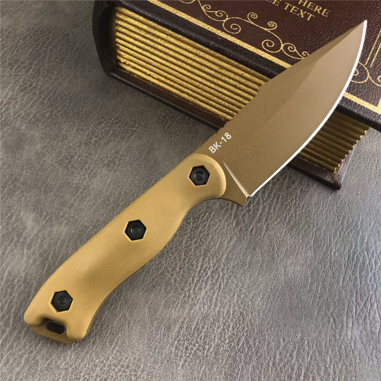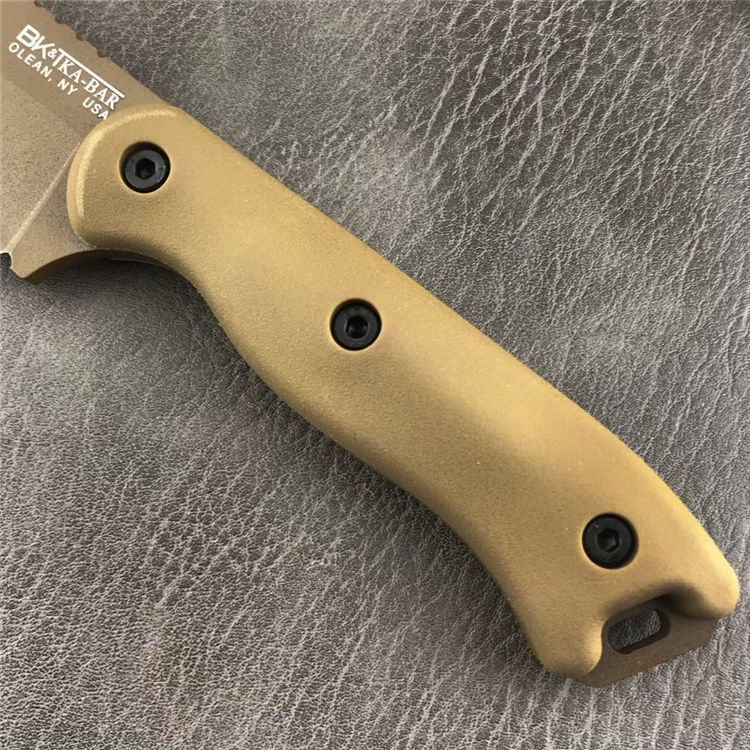 巴克BK18直刀 总长:23.6CM 刃长:11.4CM 刃宽:3.8CM 刃厚:4.6MM 柄材:尼龙玻纤 刃材:D2 柄长:12.2CM 柄宽:27.9MM 柄厚:21.8MM 重量:196G 刀鞘:Kydex鞘