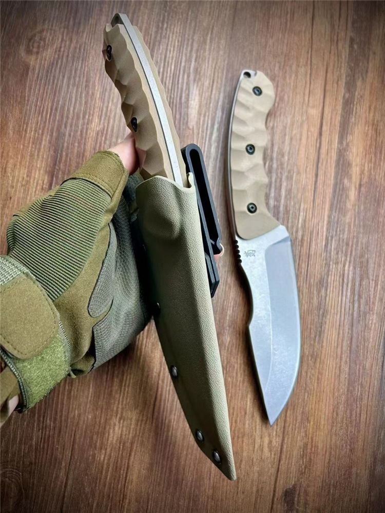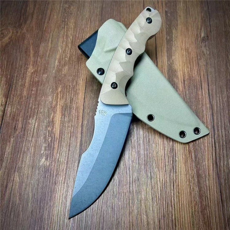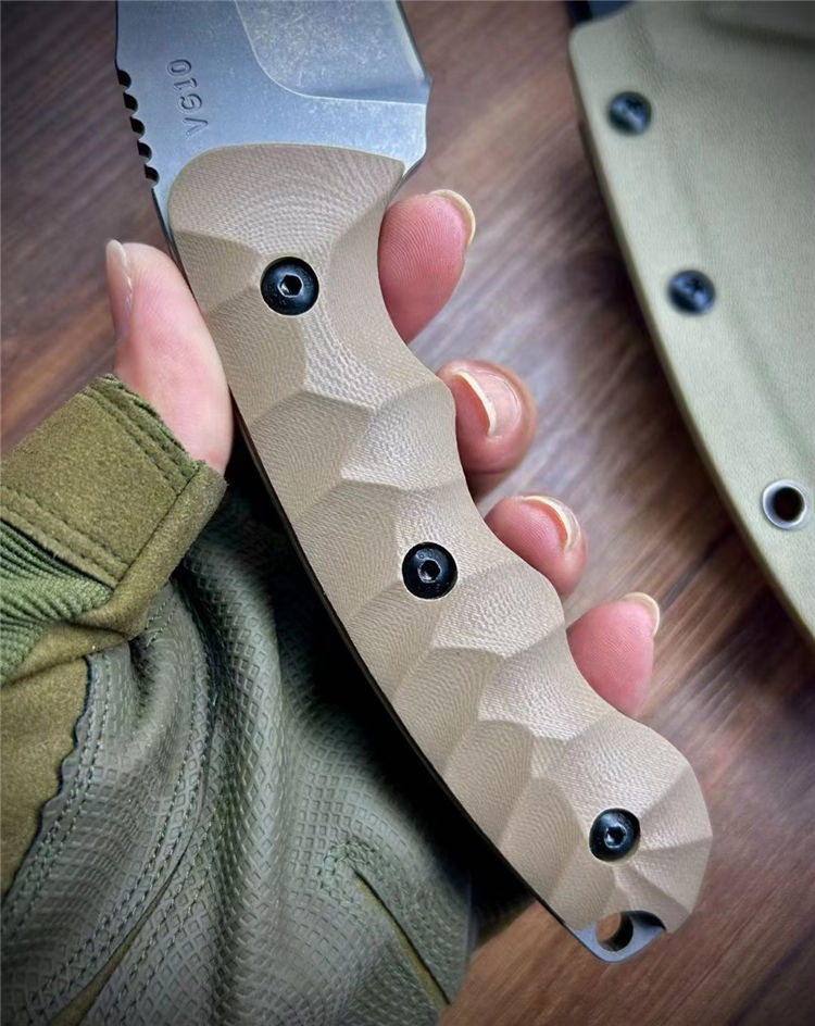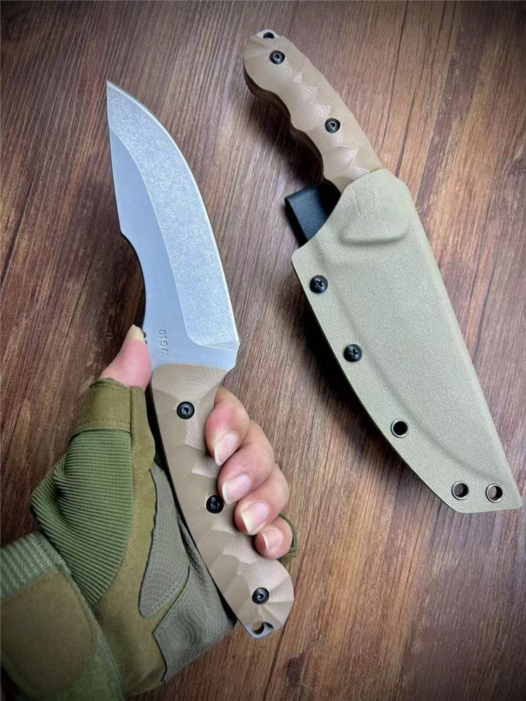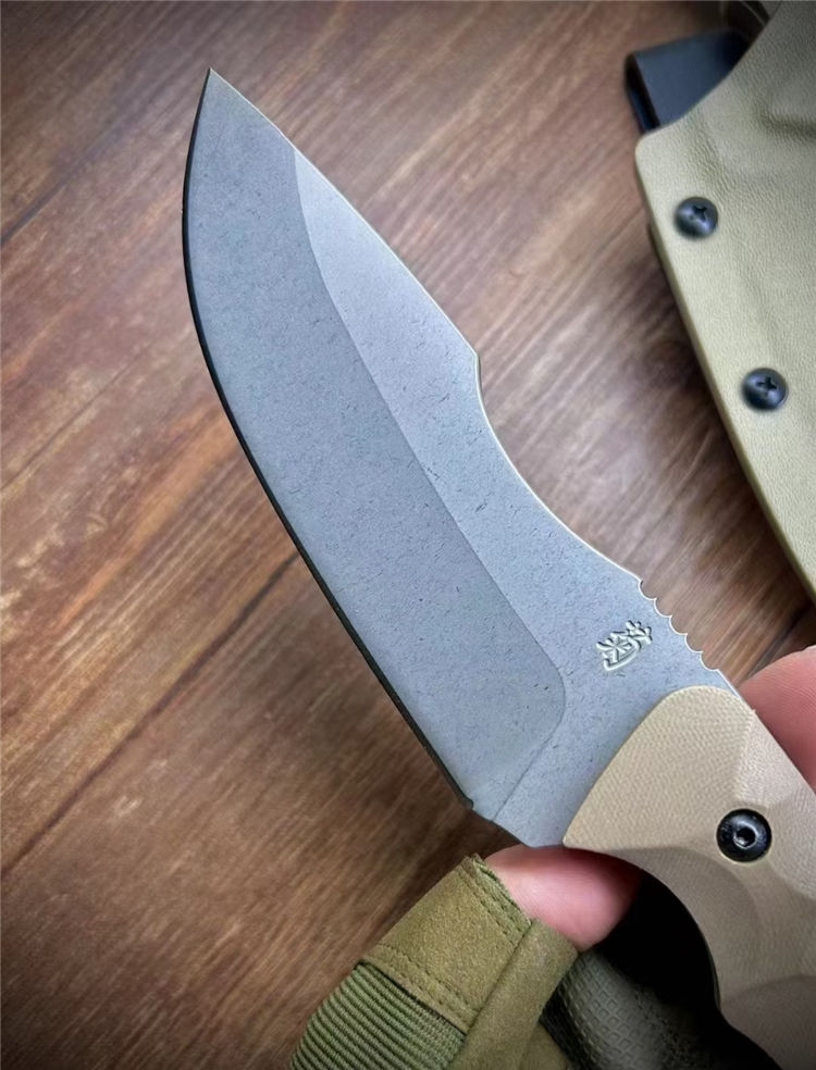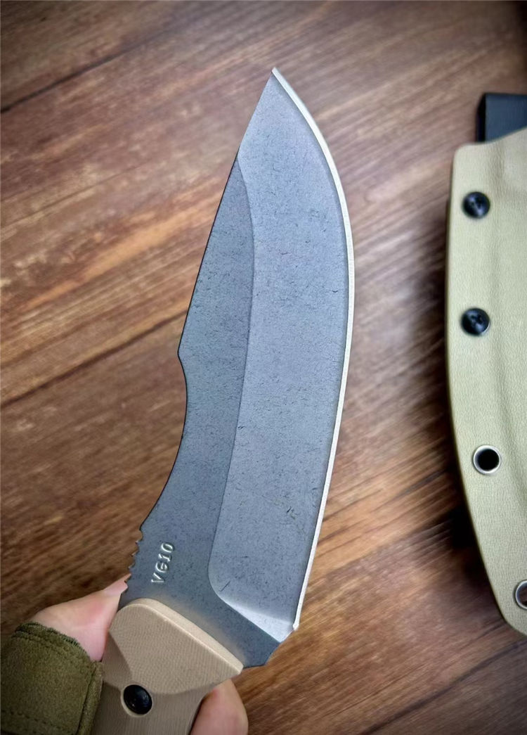 松田菊男犀牛直刀 全长:260mm 刃长:135mm 柄长:125mm 厚度:5mm 刃材:VG10 柄材:G10 硬度:60 热处理:真空热处理数控磨开V电脑锣周边 表面:喷沙石洗 刀鞘:K鞘沙色近口K料做的K鞘 包装:精美盒子
