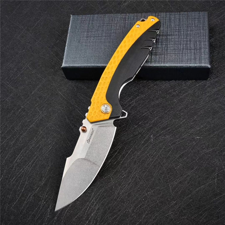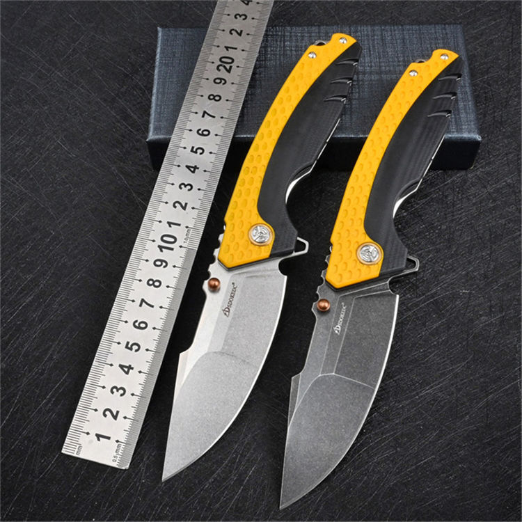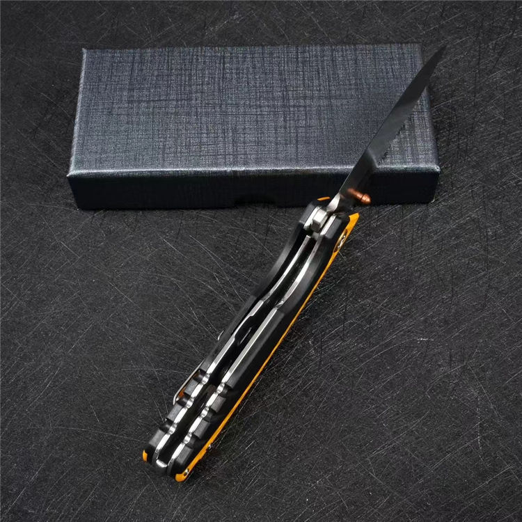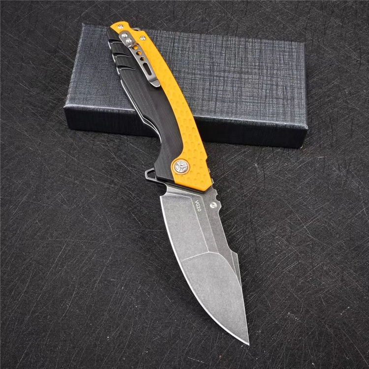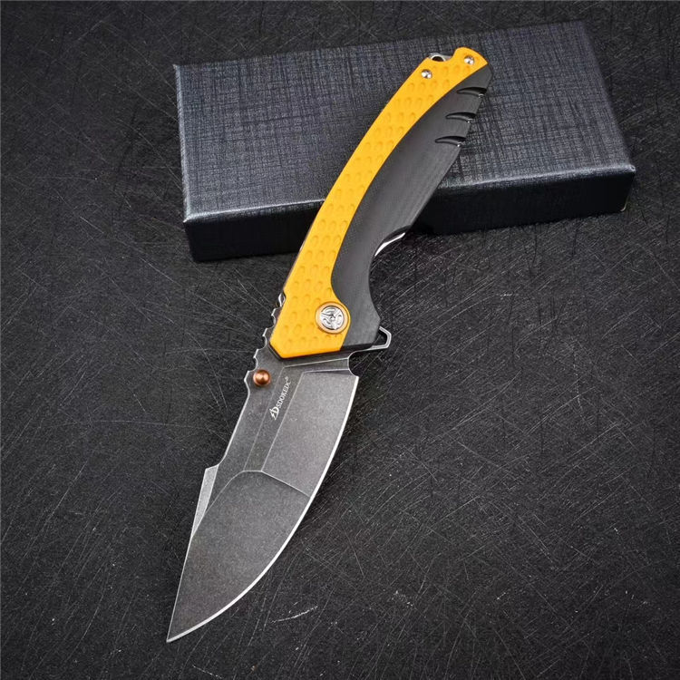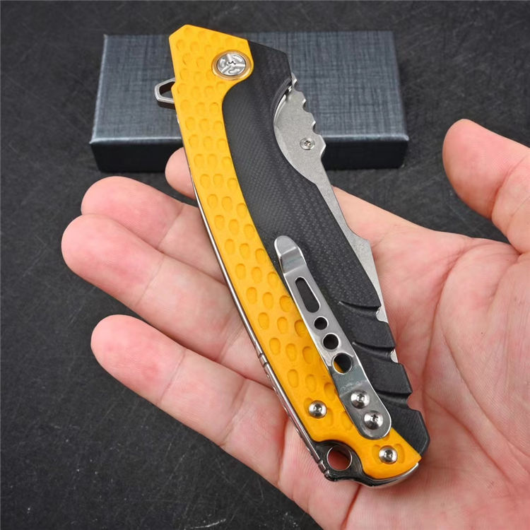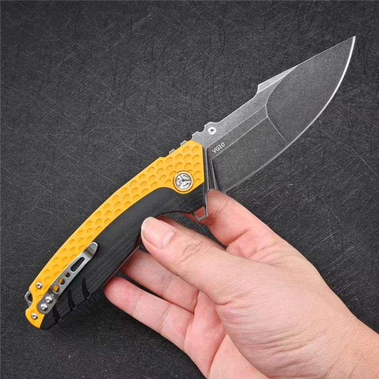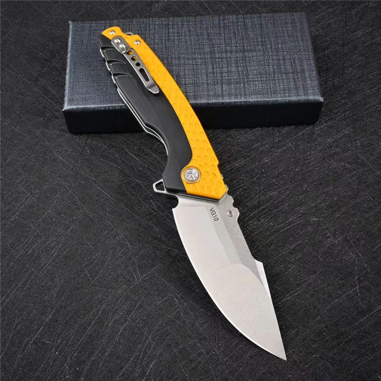 大黄蜂重型折刀 全长:22.6cm 刃长:9.9cm 柄长:13.6cm 刃厚:0.35cm 刃宽:3.5cm 刀重:216g 毛重:284g 钢材:VG10钢 柄材:黑色G10镶嵌黄色G10 硬度:60-62HRC 表面:石洗 包装:礼盒