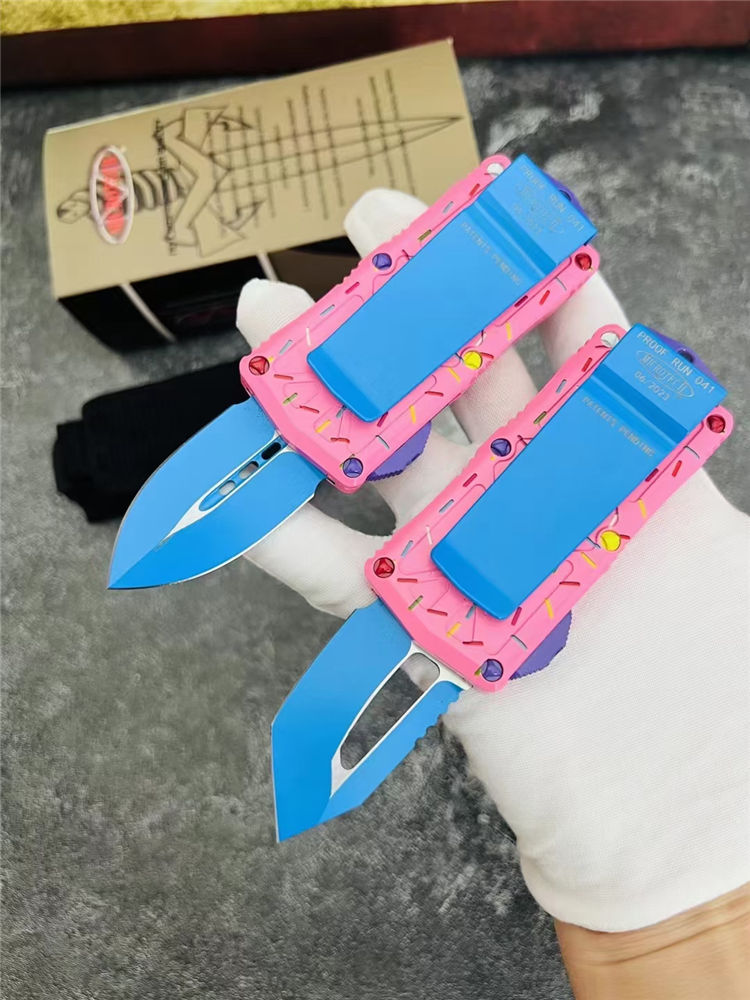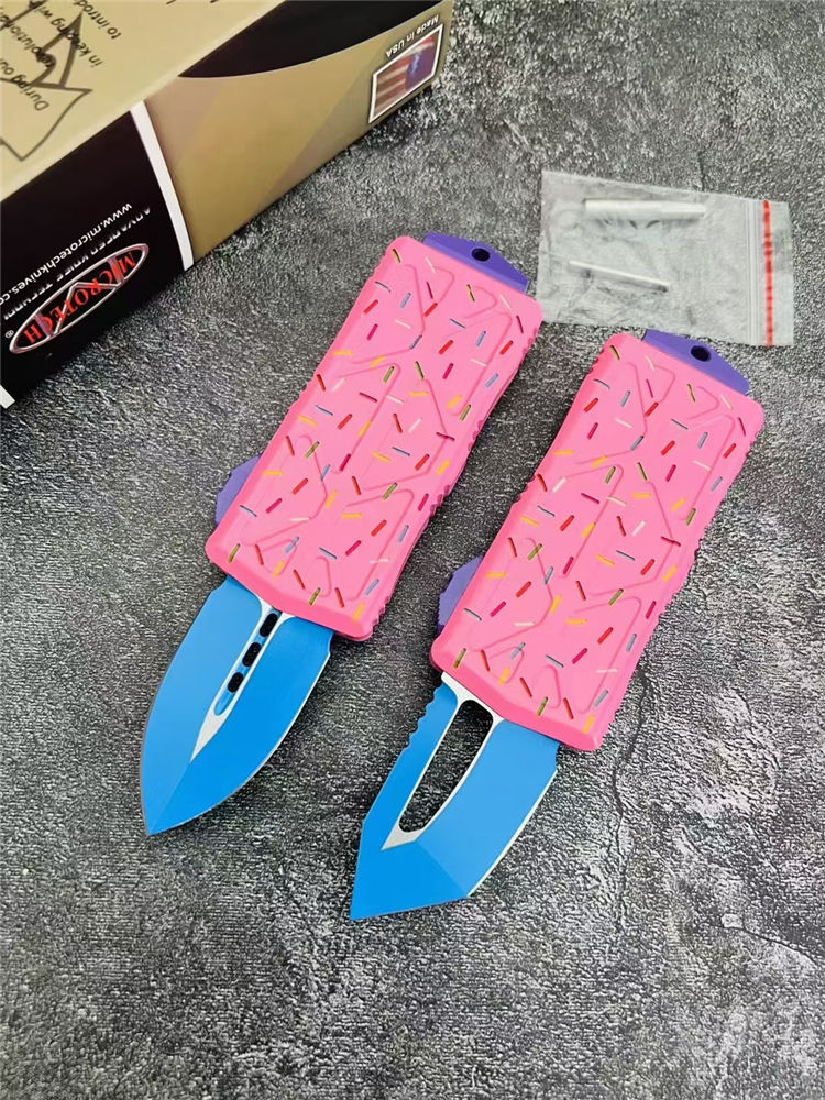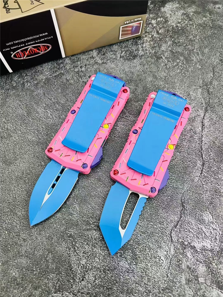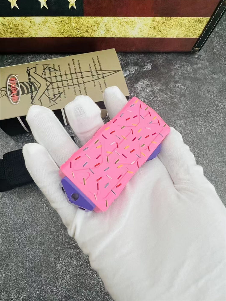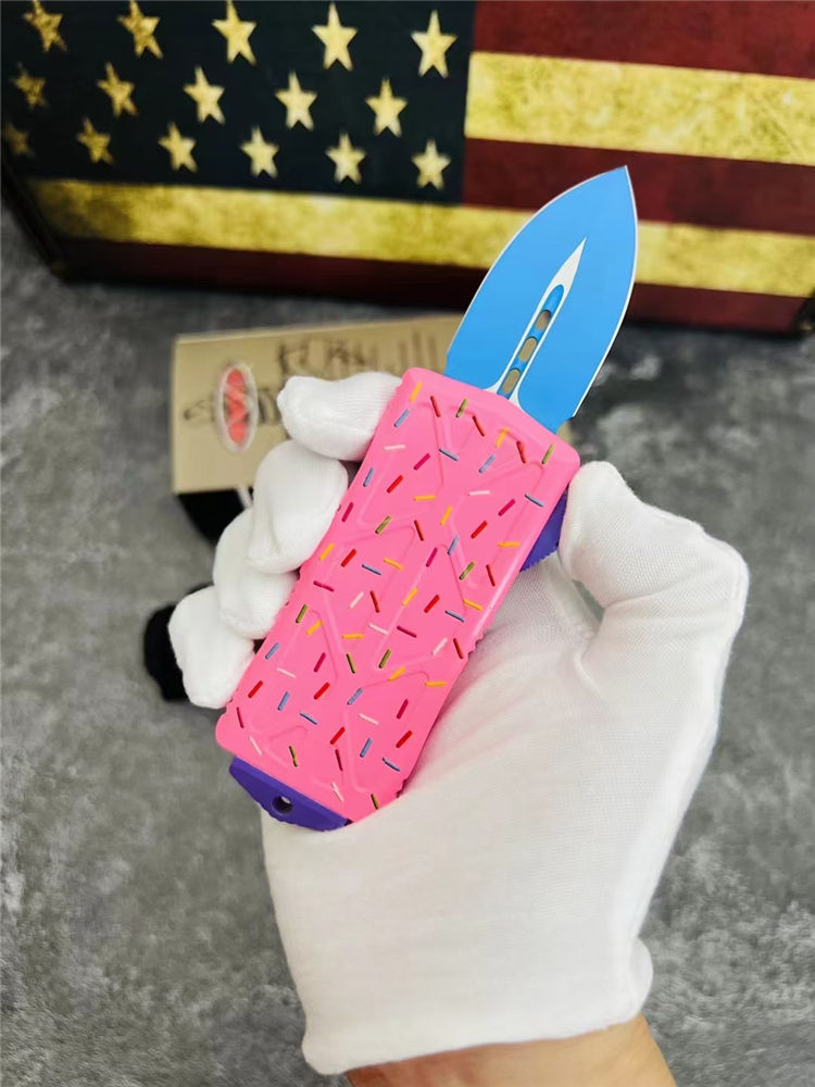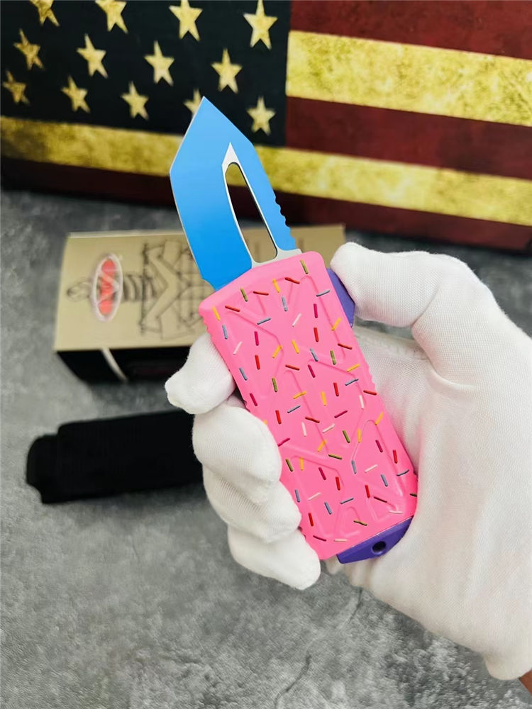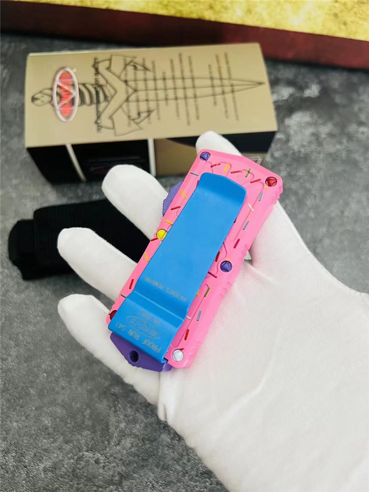 MT甜甜圈飞鱼直出跳刀 全长:14.0cm 刃长:4.7cm 刃厚:2.5mm 刃宽:2.7cm 柄长:9.3cm 刃材:D2 硬度:58-60HRC 刀重:108克 毛重:170克(含包装) 表面:氧化镀蓝刃 柄材:航空铝材 锁闭:直出弹簧刀 包装:彩盒和拆刀工具 备注:带玻璃锥,迷你口袋钱夹功能超大背夹,手柄全部CNC电脑锣出,高精密度