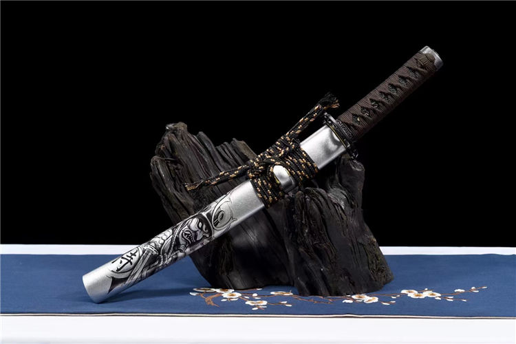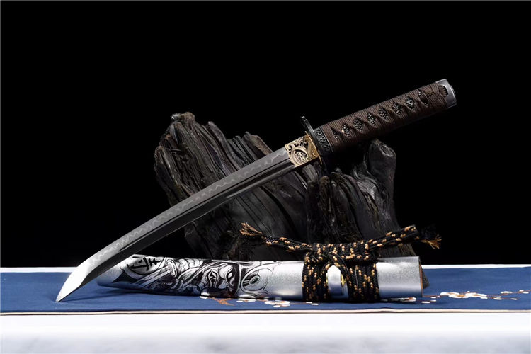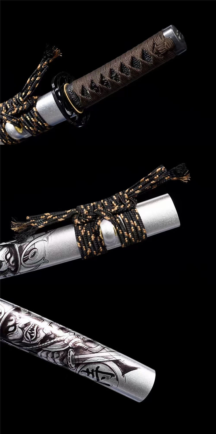 阿修罗武士刀 全长:55cm 刃长:33cm 柄长:17cm 刃宽:3.2cm 刃厚:0.6cm 重量:0.7KG 刃材:高性能T10烧刃寒气逼人,铁质刀镡 特点:钢材T10钢材锻打,开子母血槽,采用古法覆土烧刃淬水工艺,手工17道精致水磨,高硬度,刚性强 实木大漆鞘彩绘,搭配精美粗下绪,高端锦盒