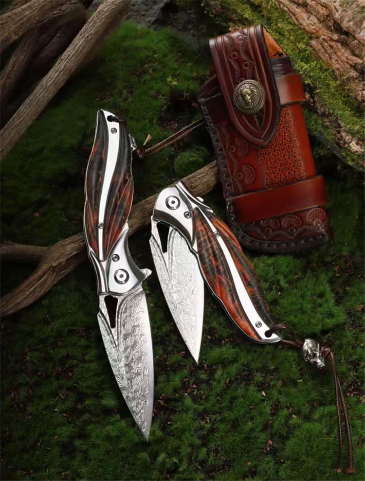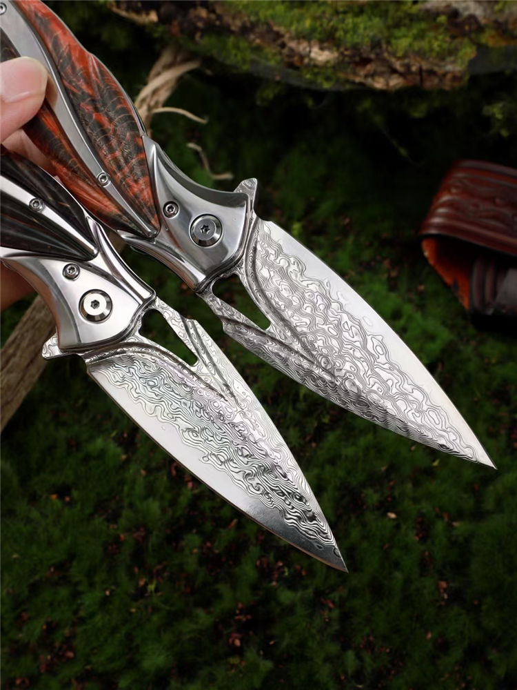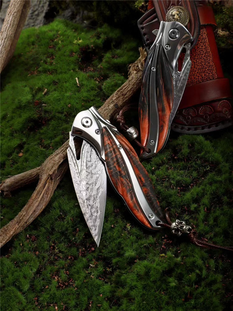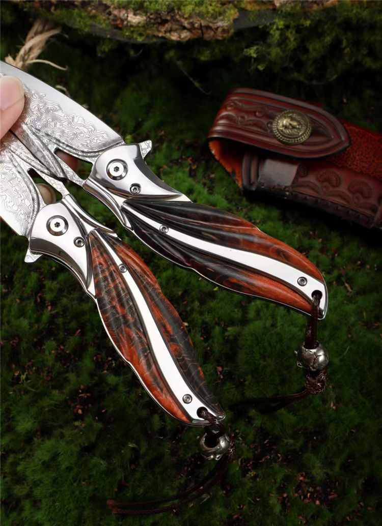 大马士革灵羽折刀 总长:19.5cm 刀刃:8.5cm 手柄:11cm 刃厚:3MM 刃宽:3cm 刃材:进口锻造大马士革钢78层 硬度:60HRC 结构:陶瓷滚珠轴承 柄材:不锈钢头+进口稳定固化木 包装:手工皮套+高配礼品盒+吊坠