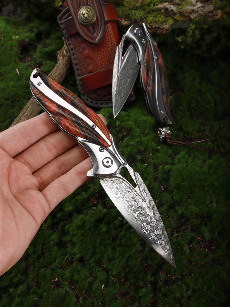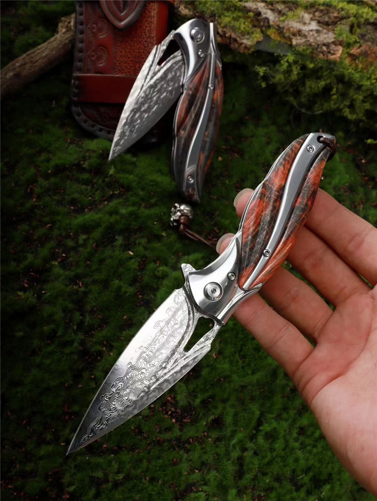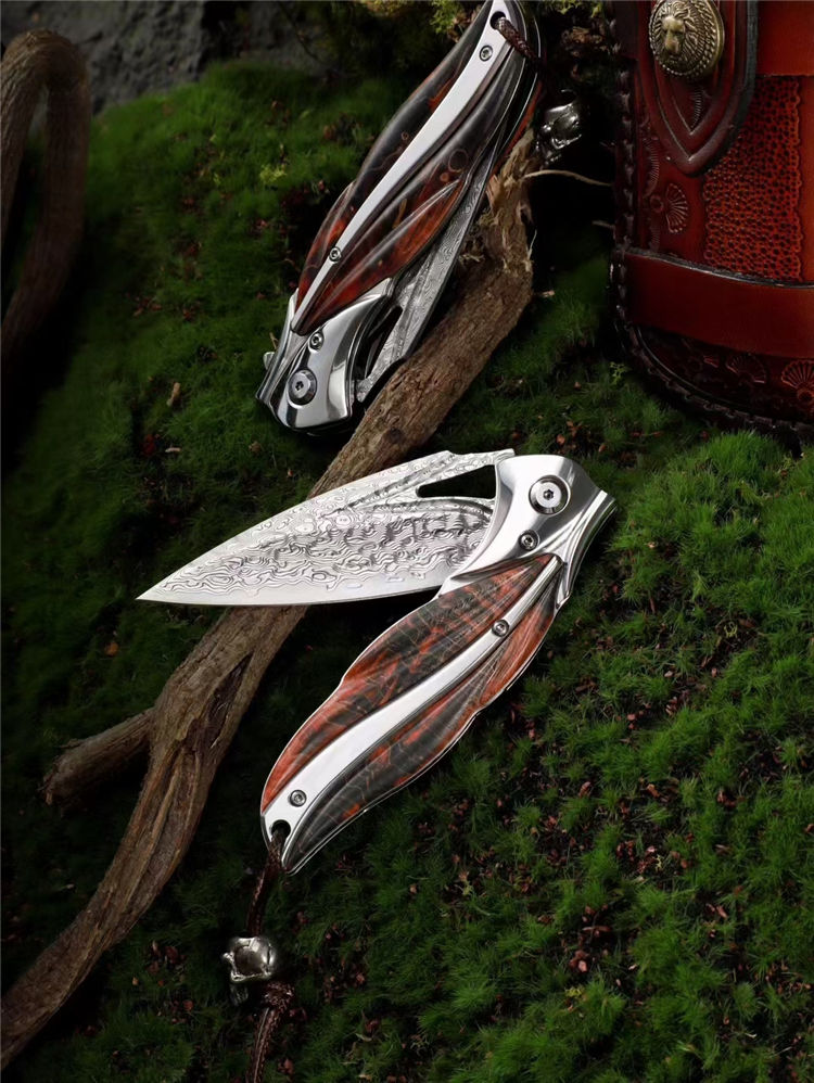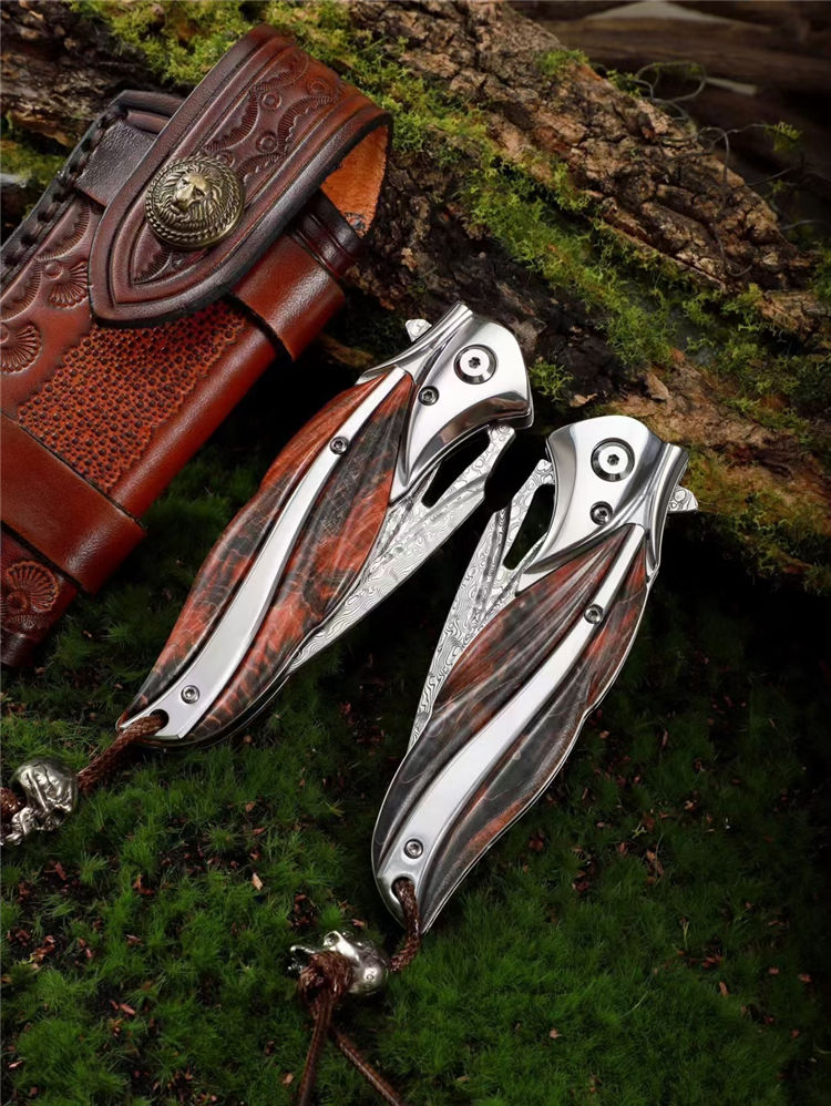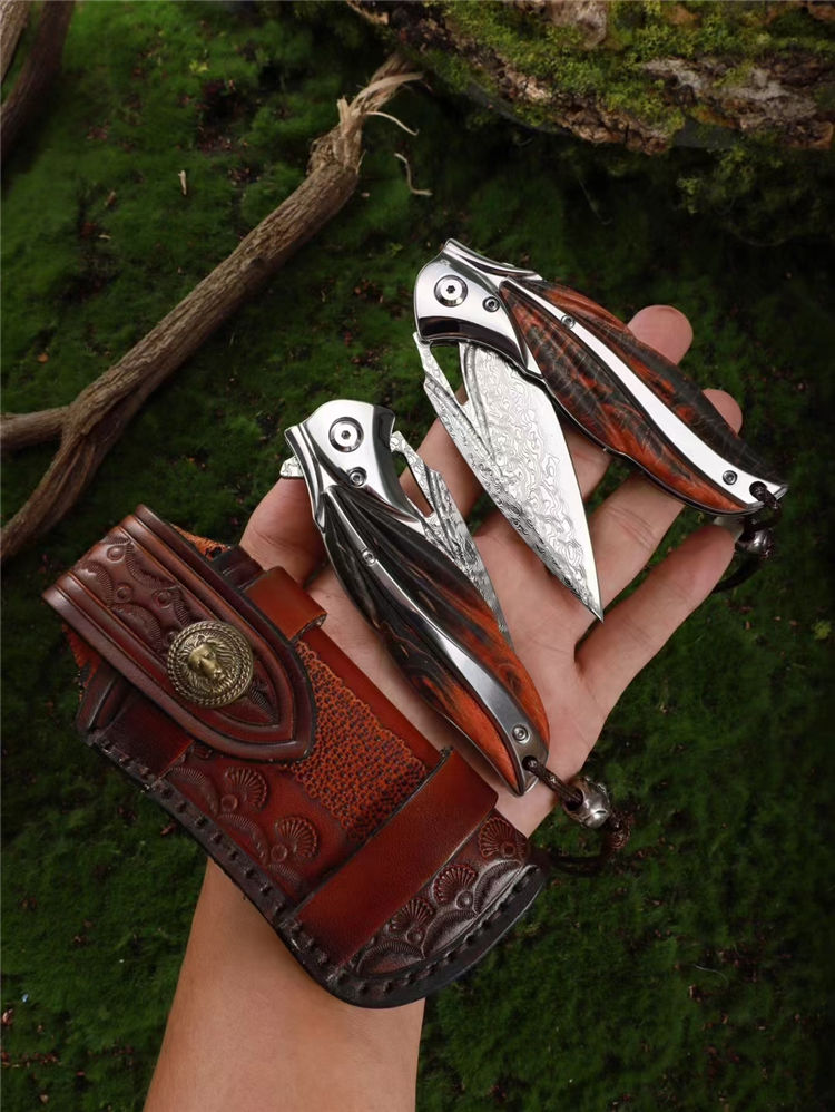 大马士革灵羽折刀 总长:19.5cm 刀刃:8.5cm 手柄:11cm 刃厚:3MM 刃宽:3cm 刃材:进口锻造大马士革钢78层 硬度:60HRC 结构:陶瓷滚珠轴承 柄材:不锈钢头+进口稳定固化木 包装:手工皮套+高配礼品盒+吊坠