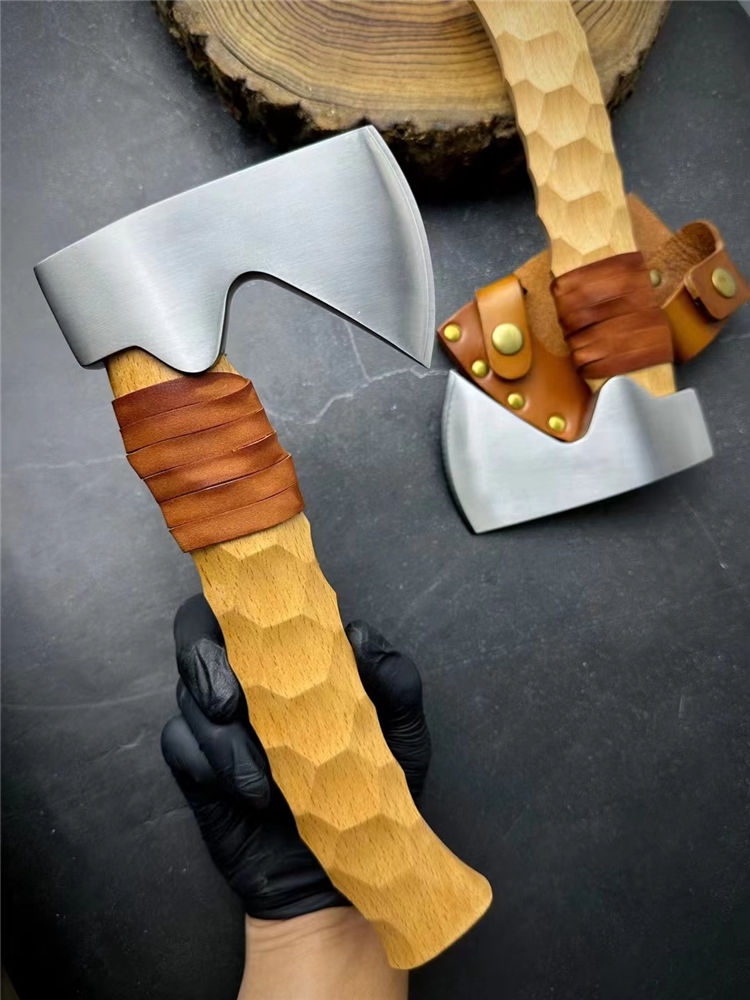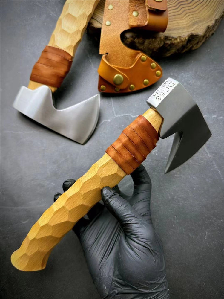 冰原驯鹿斧头 总长:25.5cm 斧刃:7.5cm 厚度:2.4cm 宽度:12cm 钢材:进口DC53合金钢 热处理:真空热处理 硬度:61HRC 柄材:皮绳包扎+桦木 皮套:阿根廷进口植糅皮 包装:高档黑色包装盒