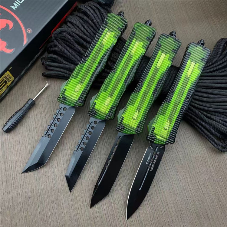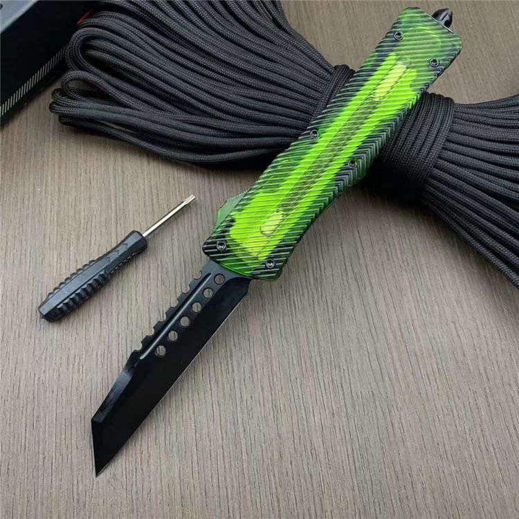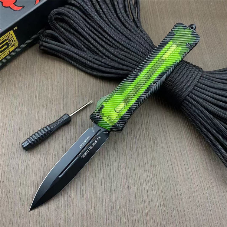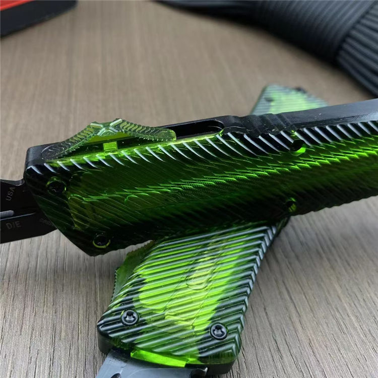 复刻版微技术透明柄海龙直出跳刀 全长:23.8CM 刃材:D2 刃长:9.5CM 柄长:14.4CM 刃宽:1.9CM 刃厚:0.3CM 柄材:铝合金+Ultem琥珀色 重量:115克 附件:尼龙布袋,说明书彩盒 复刻透视机械结构纹理防滑黄色透明柄加透明推钮整刀用,CNC,电脑锣,线切割制作而成,手工,精密度非常高,很值得收藏的一把刀