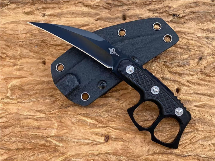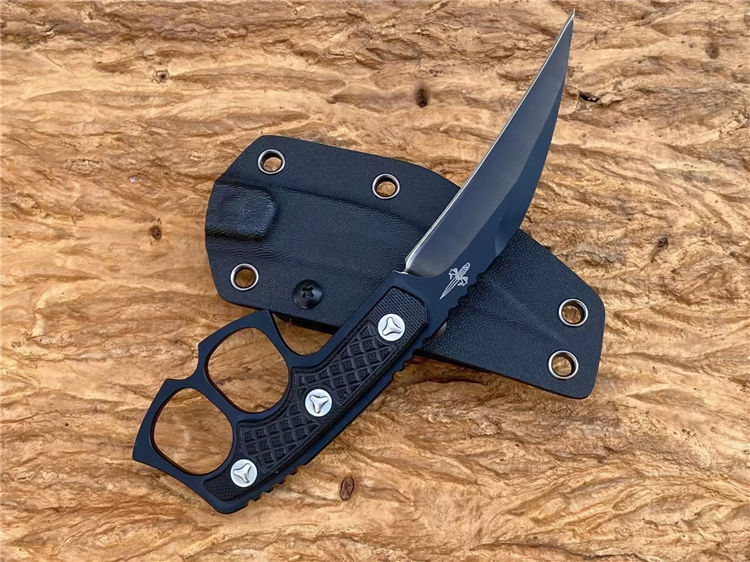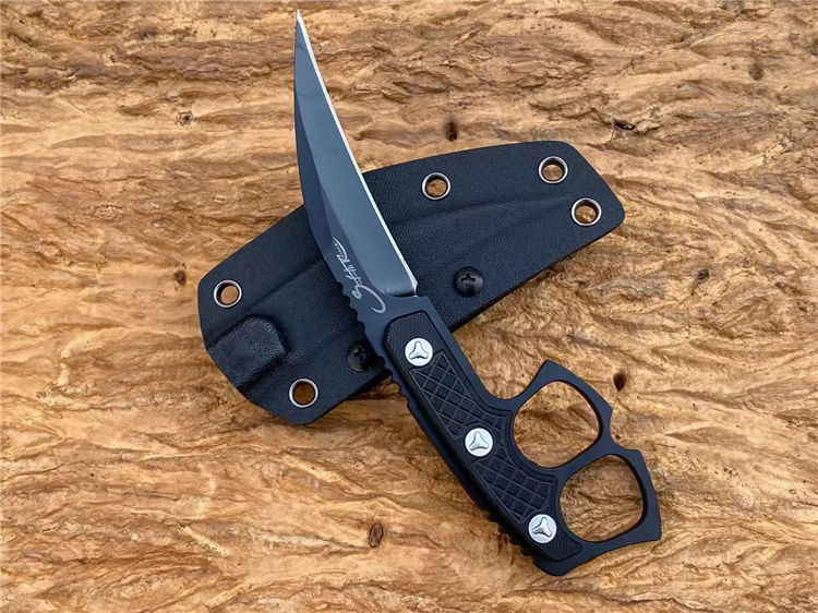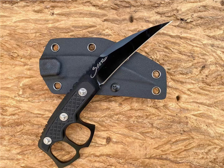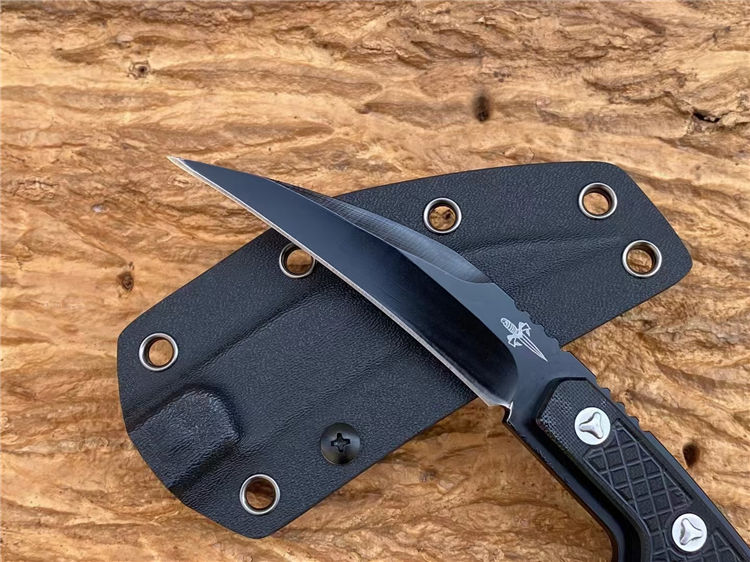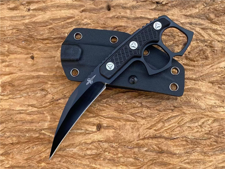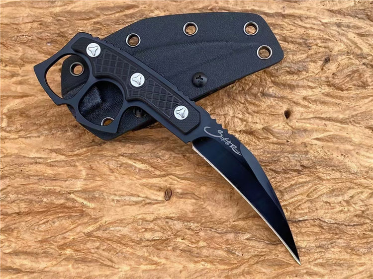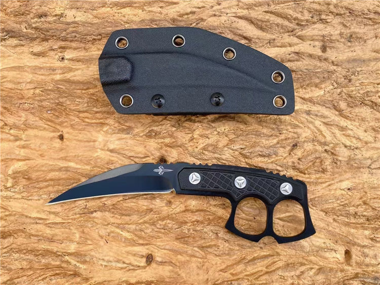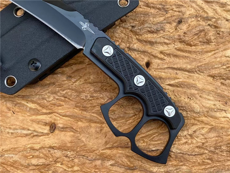微技术恶龙爪刀手刺 全长:28cm 刃长:8.8cm 厚度:3.5mm 材质:D2 重量:120克 硬度:61HRC 表面:黑钛 手柄:G10 刀鞘:进口战术K鞘