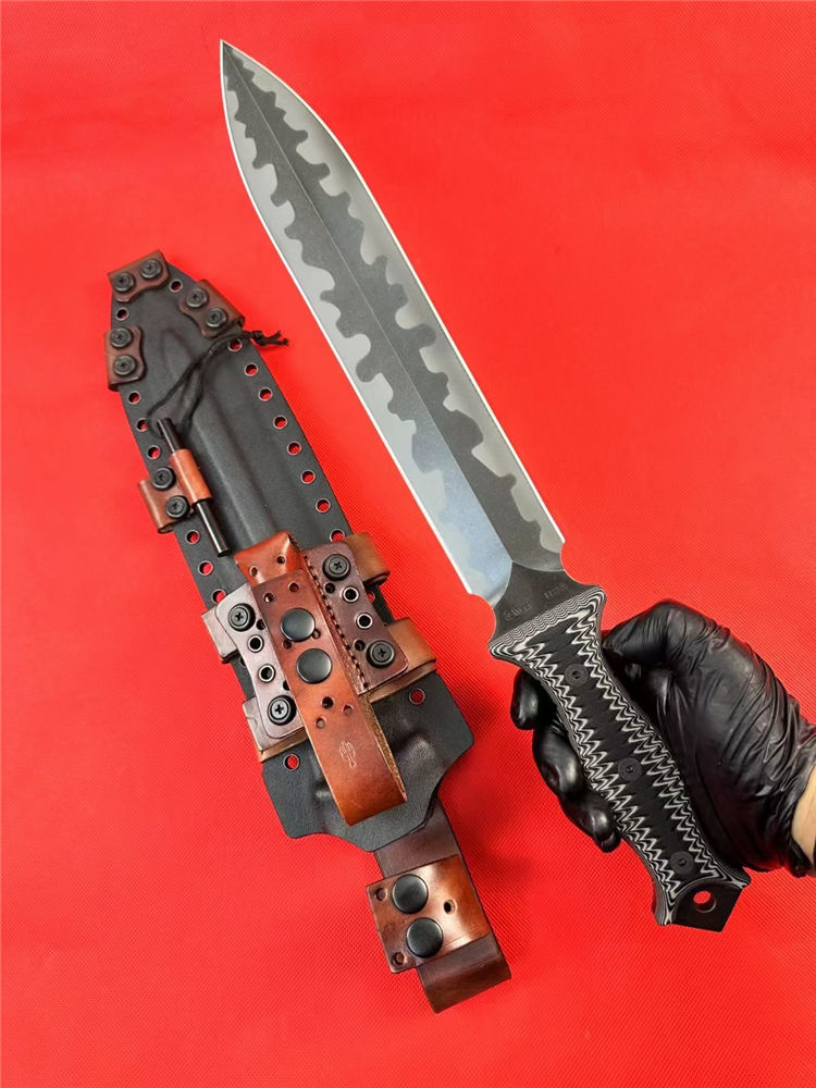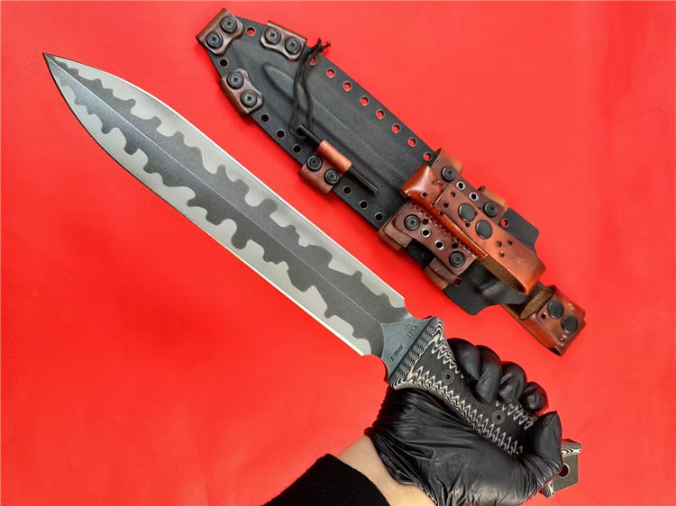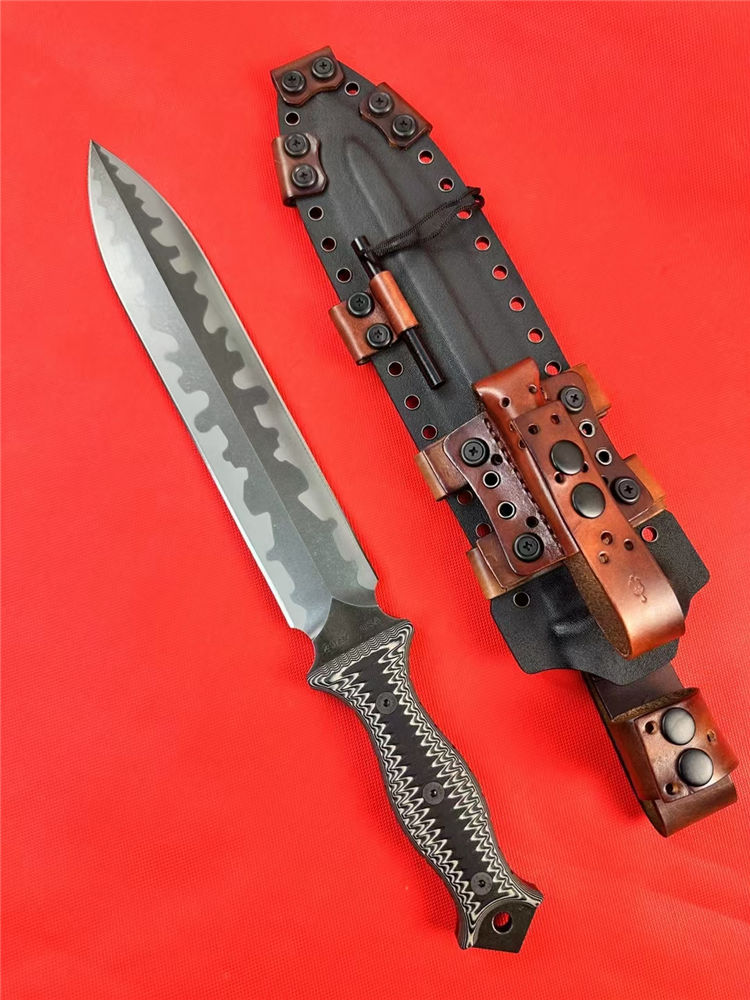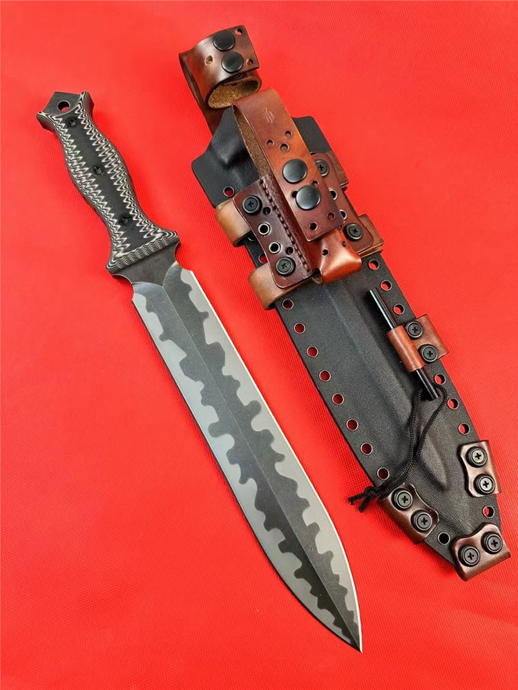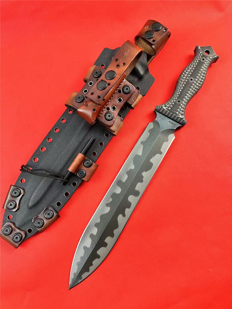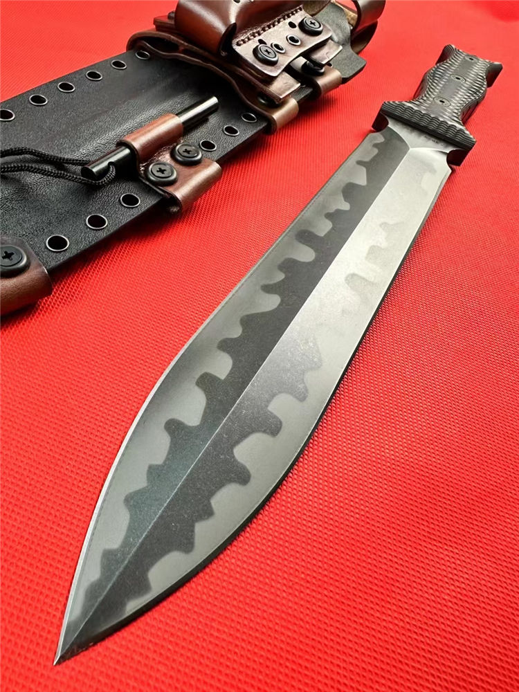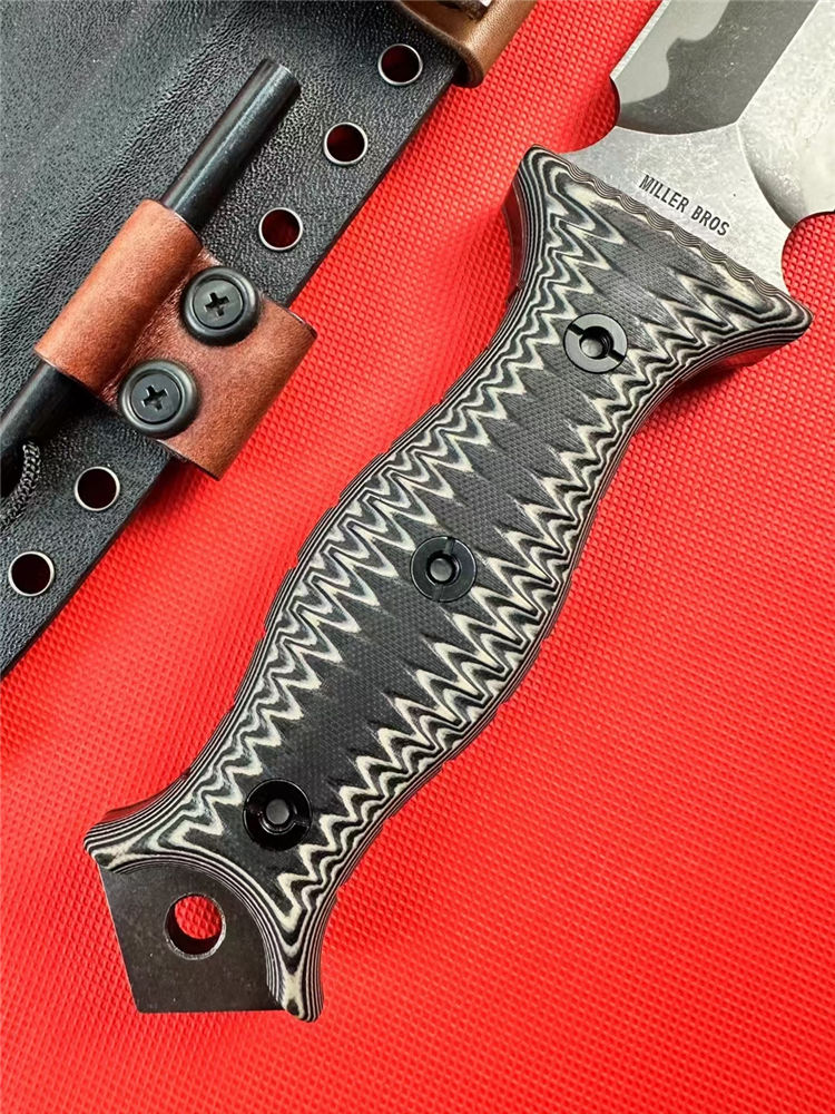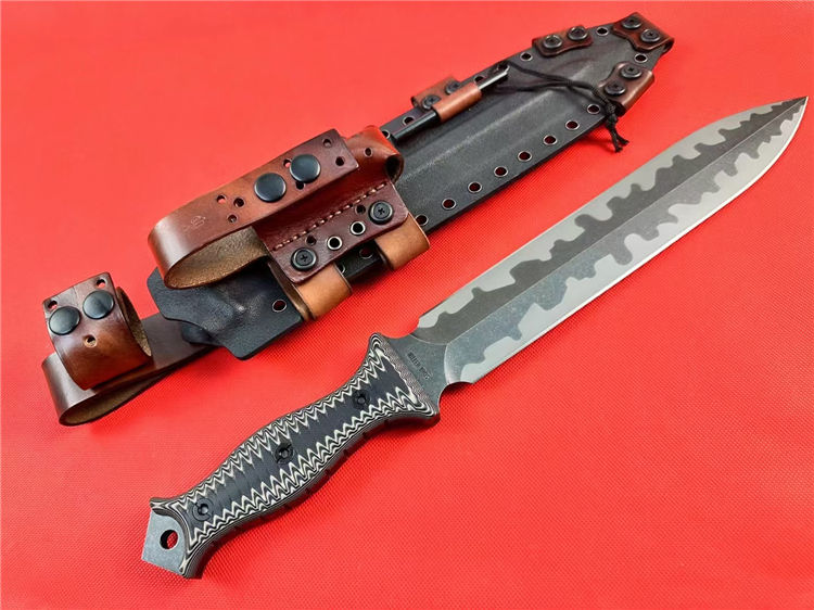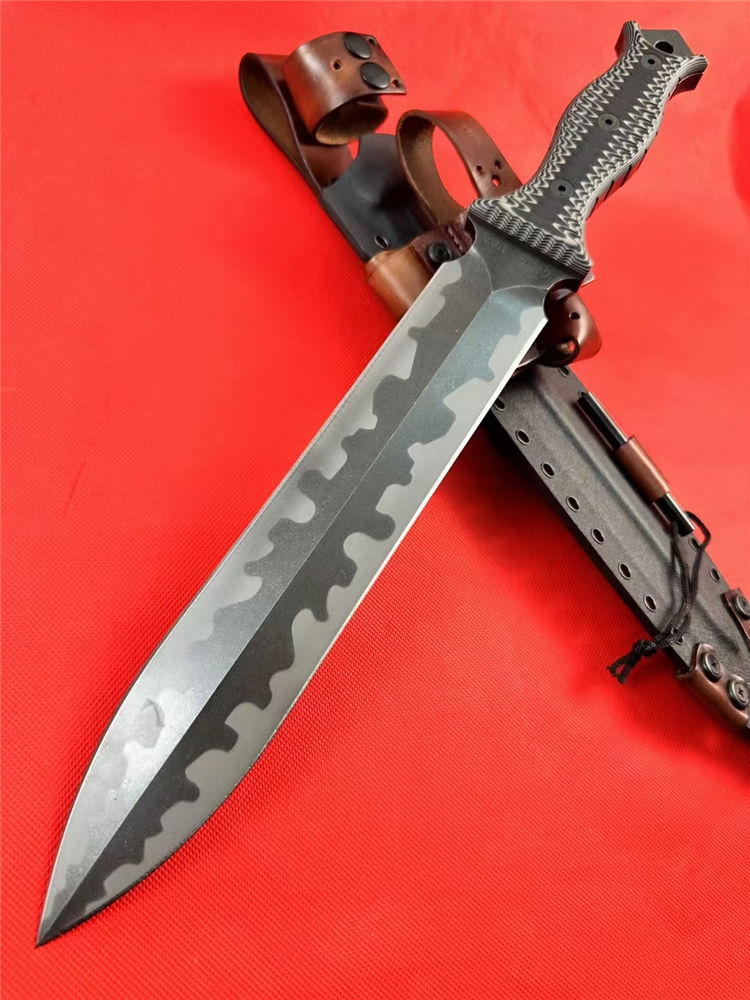 米勒兄弟M9双锋直刀 总长:43.8cm 刃长:26.5cm 厚度:7.mm 刃宽:4.7cm 柄长:15cm 钢材:进口A8钢 硬度:60-62HRC 热处理:专业真空深冷让处理油淬 柄材:双色G-10 表面:迷彩石洗钢印LOGO 刀鞘:进口2.5厚K鞘+进口意大利手工制作植鞣皮 包装:黑色手工盒子(合作代工出口版简包) 单刀重量:725g 含鞘重量:1120g