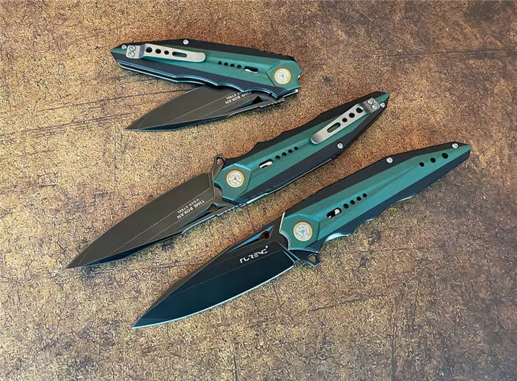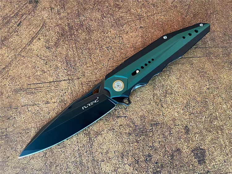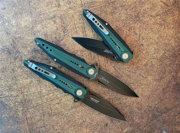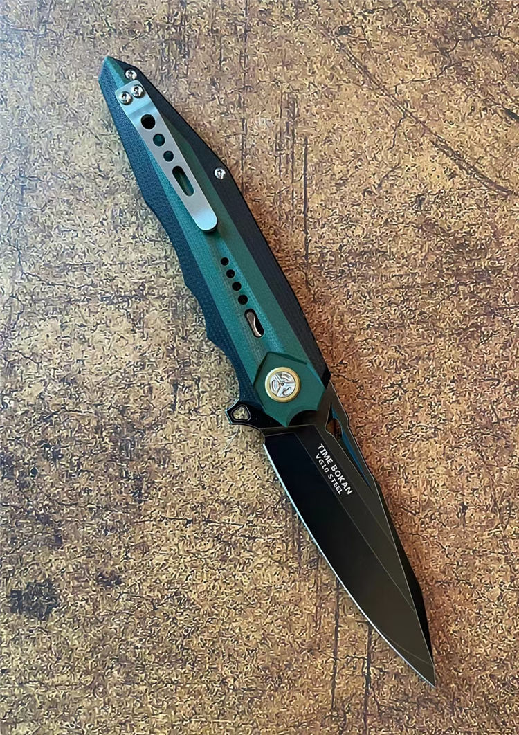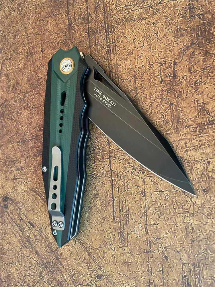 时间飞船折刀 总长:22CM 刃长:9.5CM 刃厚:4MM 刃宽:2.8CM 钢材:日本合资VG10合金钢 热处理:专业真空热处理 硬度:60-61HRC 重量:152G 表面:镀钛石洗工艺 柄材:由两种不同颜色复合G10镶嵌而成、CNC加工,配钛合金夹子 包装:手工盒子包装