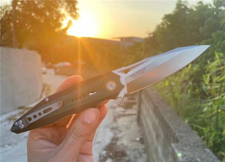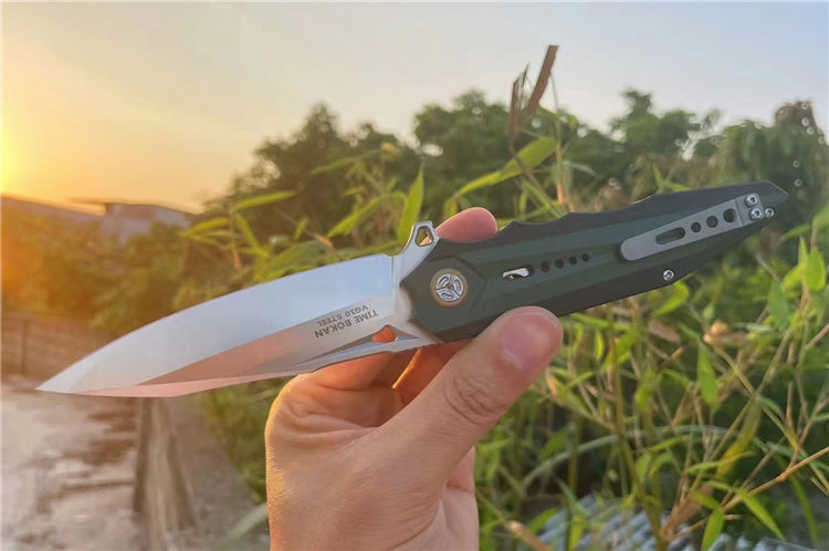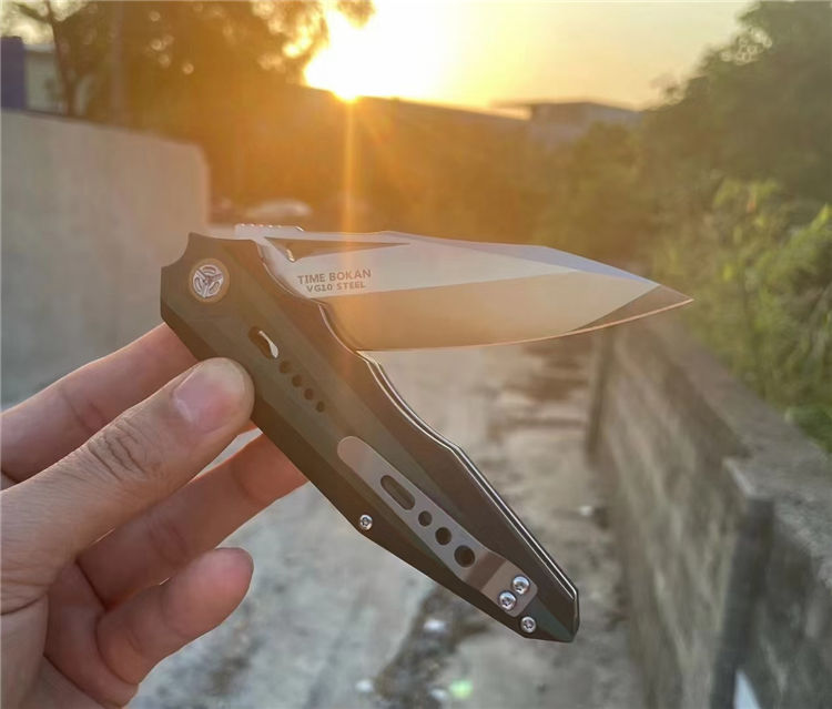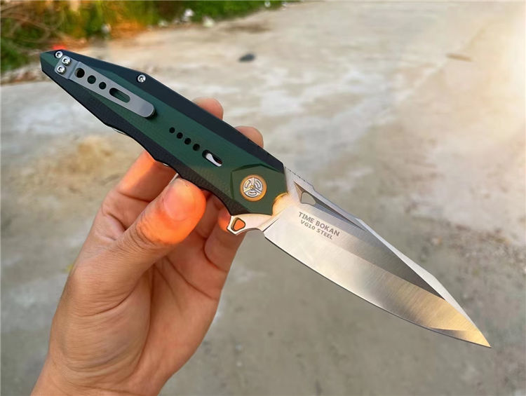 时间飞船白版折刀 总长:22CM 刃长:9.5CM 刃厚:4MM 刃宽:2.8CM 钢材:日本合资VG10合金钢 热处理:专业真空热处理 硬度:60-61HRC 重量:152G 柄材:由两种不同颜色复合G10镶嵌而成、CNC加工,配钛合金夹子 包装:手工盒子包装