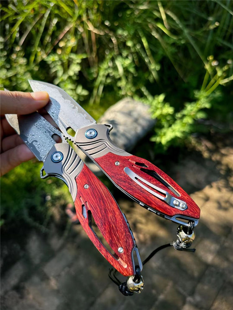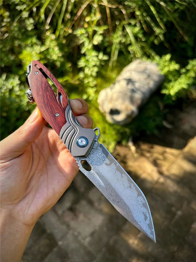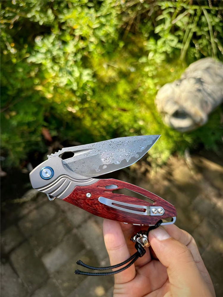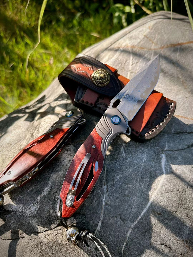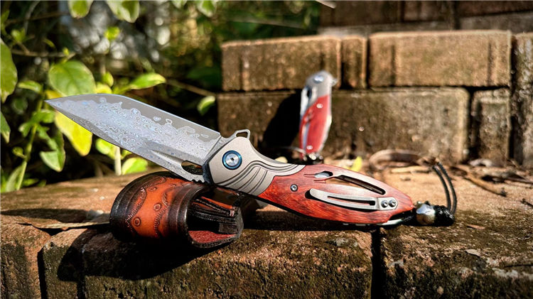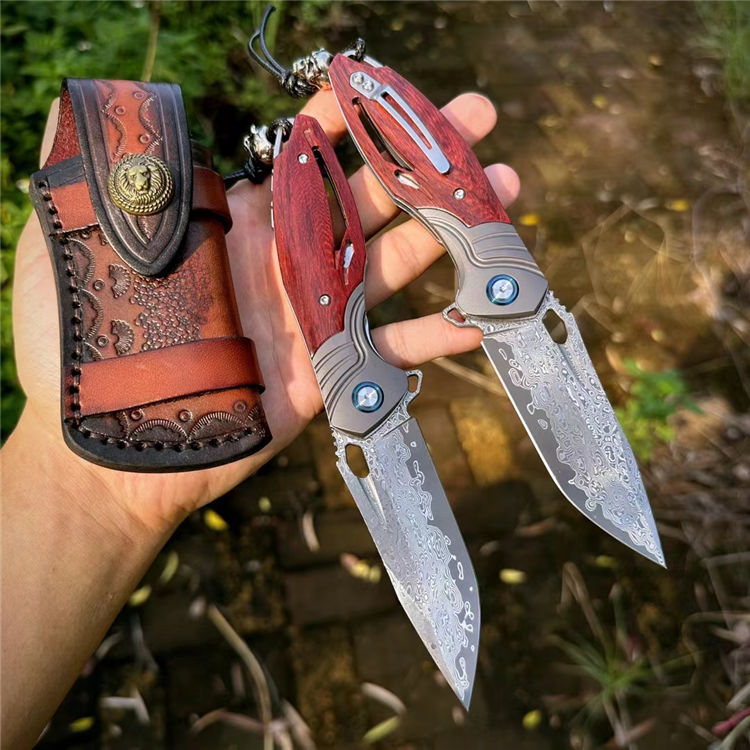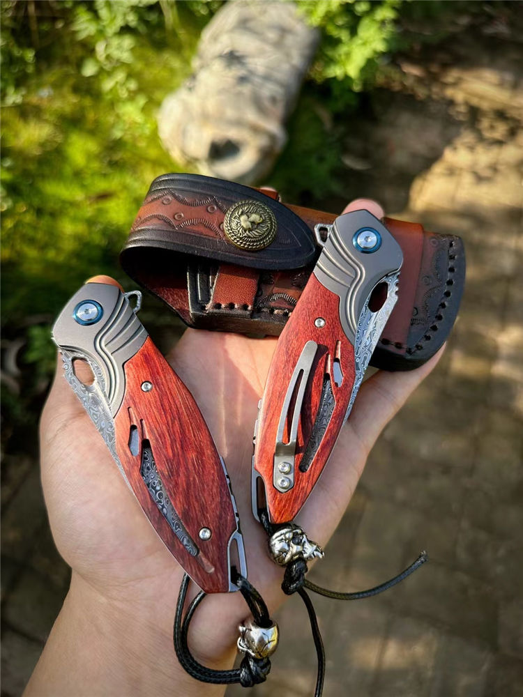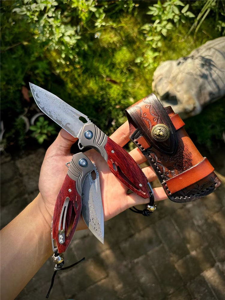 大马士革伊斯折刀 总长:20cm 刀刃:8.5cm 手柄:11.5cm 刃宽:3mm 刃厚:3mm 钢材:进口锻造大马士革钢85层 硬度:60HRC 表面:原大马士革花纹 热处理:真空热处理 柄材:430不锈钢雕刻+红酸枝木 结构:陶瓷滚珠轴承 皮套:意大利植鞣皮手工雕花皮套 包装:黑色硬盒+皮套+吊坠
