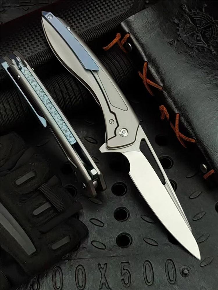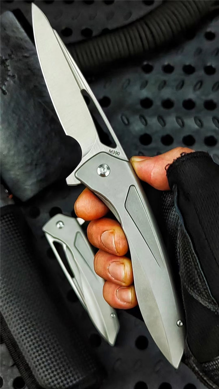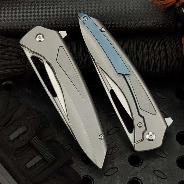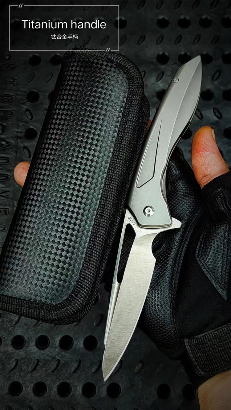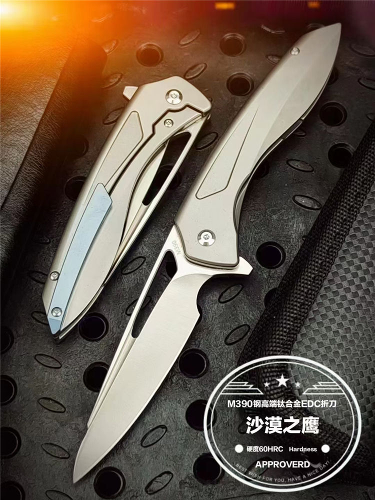 沙漠之鹰折刀 总长:22cm 刃长:8.0cm 柄长:12.5cm 刃厚:4.5cm 钢材:进口390钢 表面:cnc数控水磨精细砂光 硬度:60-62HRC真空热处理 柄材:钛合金 净重:238g 毛重:200g(含包装合) 配套:刀包