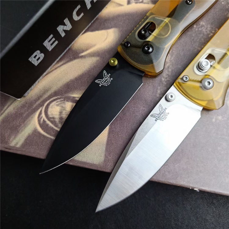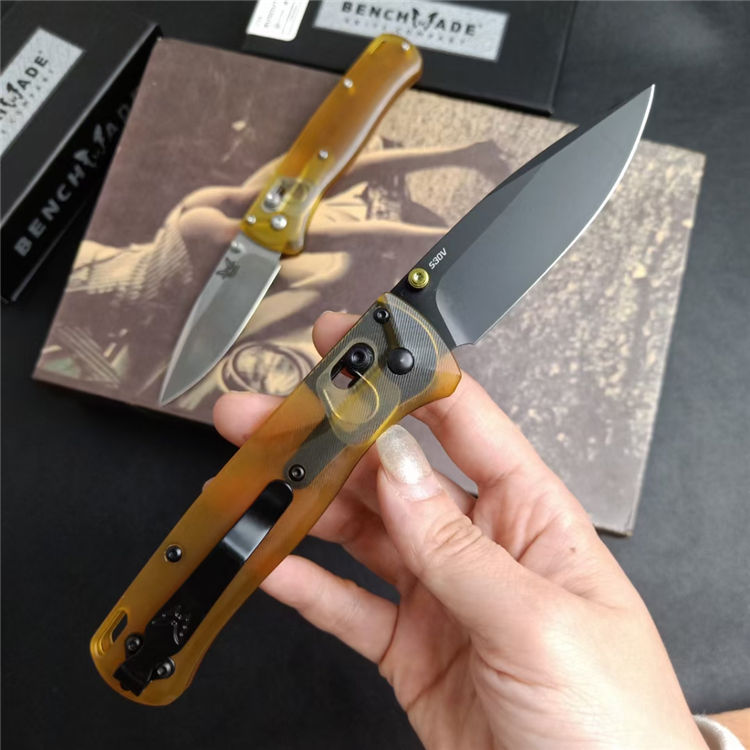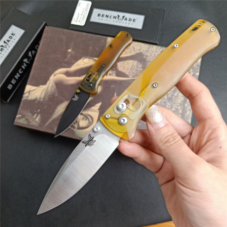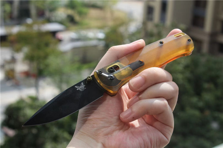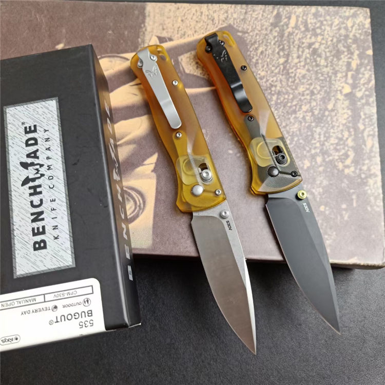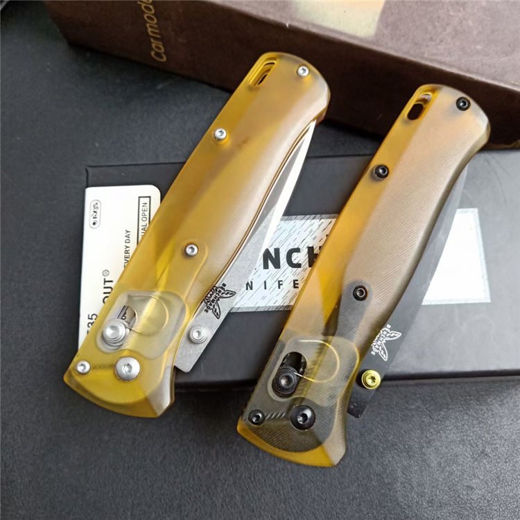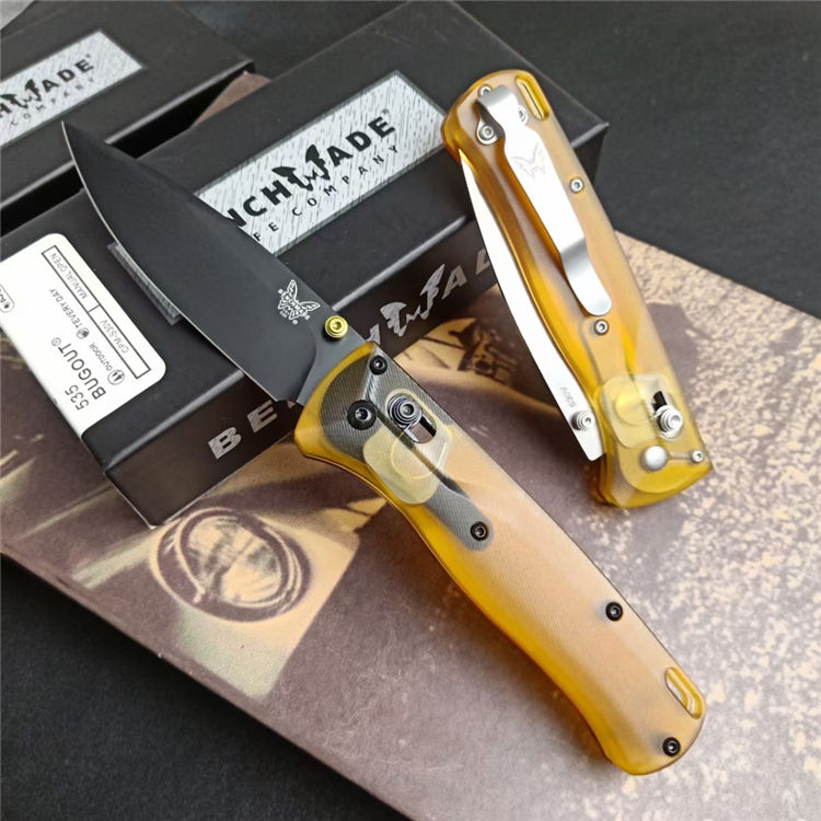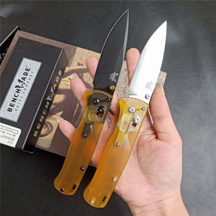透明版蝴蝶535BK4折刀 总长:200mm 闭合:112mm 刃长:80mm 厚度:2mm 刃宽:24mm 材质:9cr18 表面:数控水磨 柄材:黄色PEI透明版 重量:65克 毛重:131克