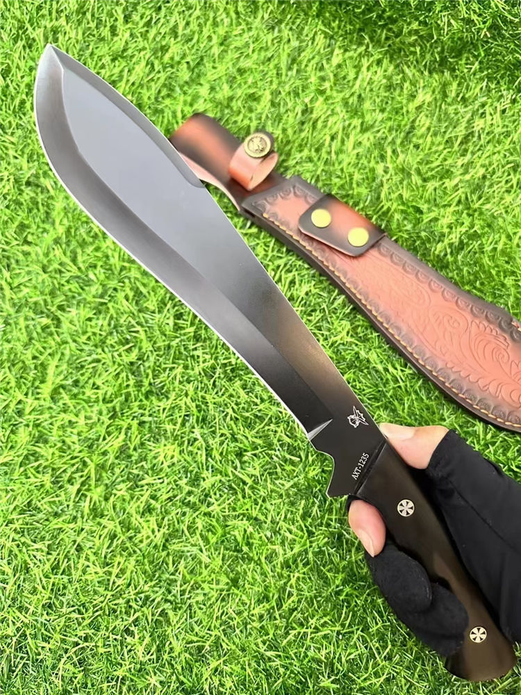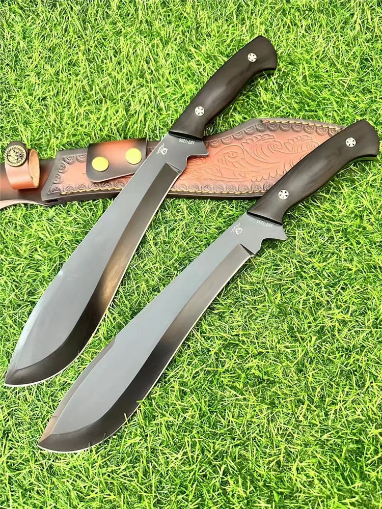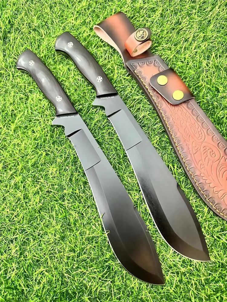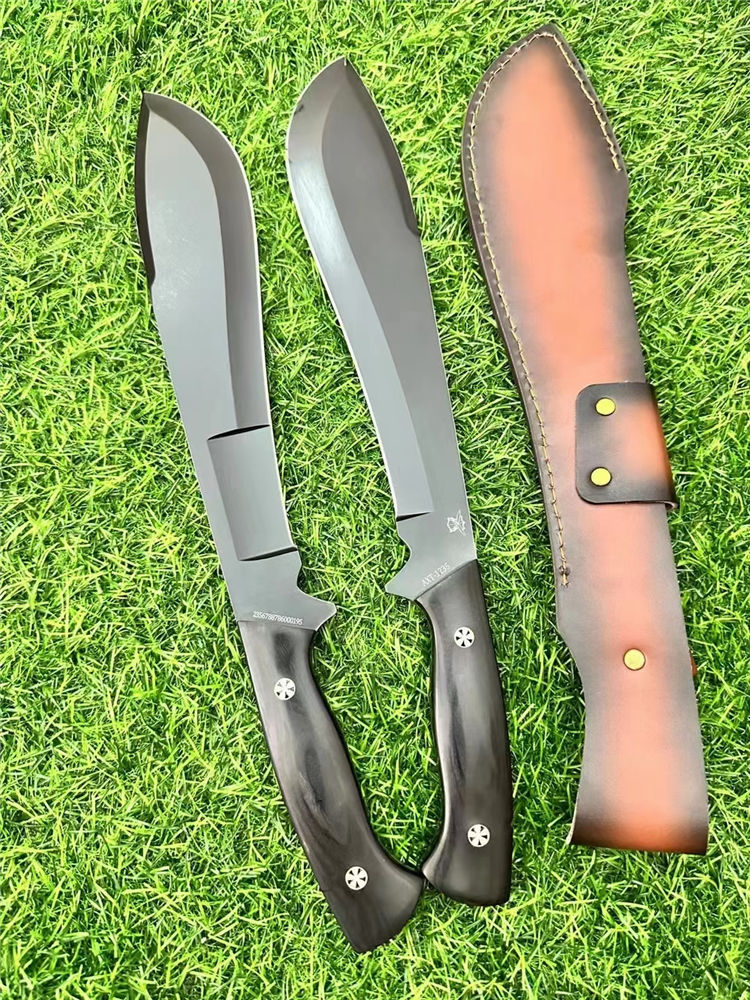 二代柳叶狗腿弯刀 总长:40cm 刃长:24cm 刃厚:6mm 重量:690g 刃材:AXT-1235钢 柄材:黑檀木一体龙骨 表面:砂光/黑钛 硬度:60HRC 包装:雕花皮套