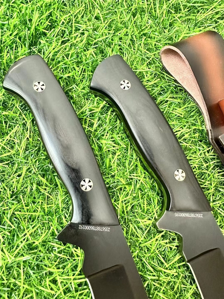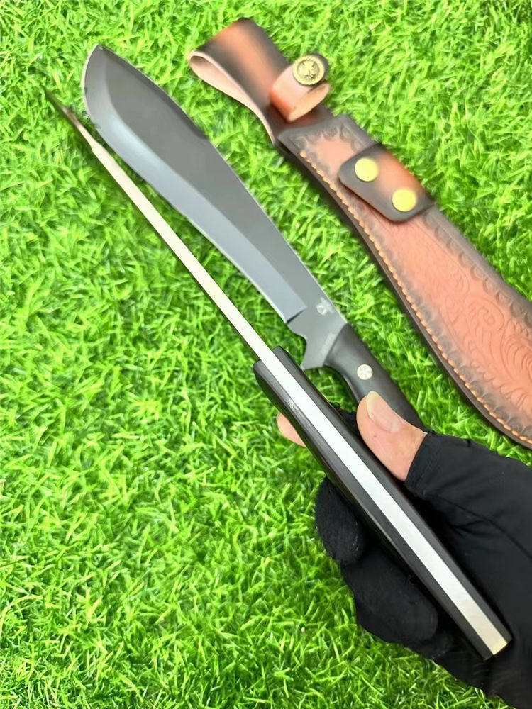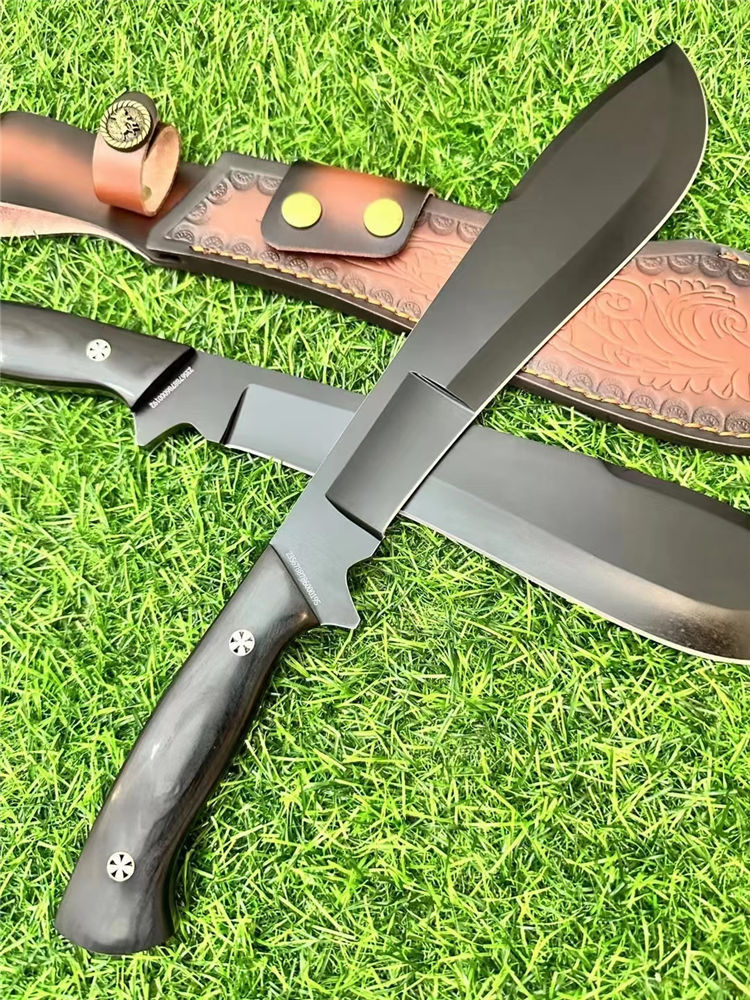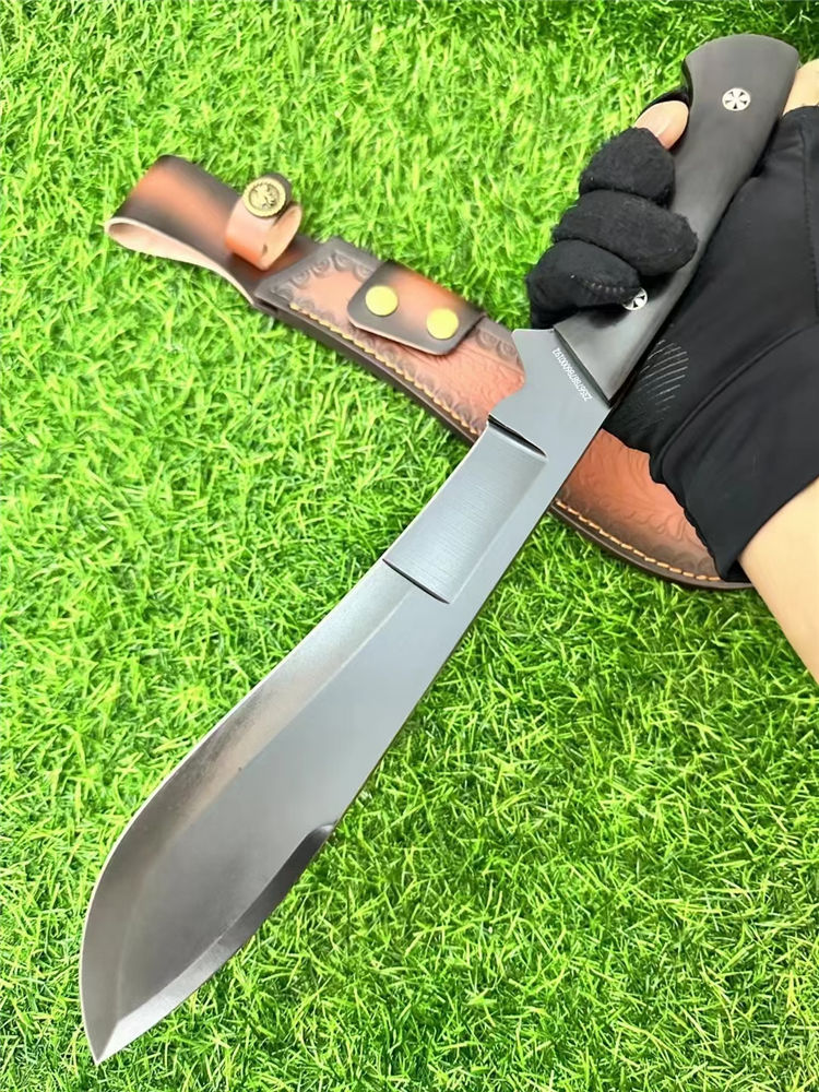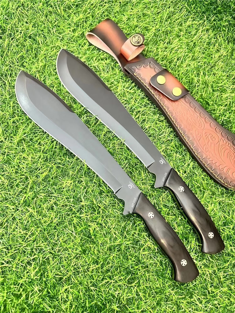 二代柳叶狗腿弯刀 总长:40cm 刃长:24cm 刃厚:6mm 重量:690g 刃材:AXT-1235钢 柄材:黑檀木一体龙骨 表面:砂光/黑钛 硬度:60HRC 包装:雕花皮套