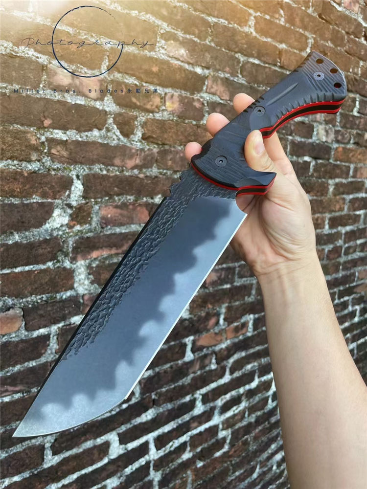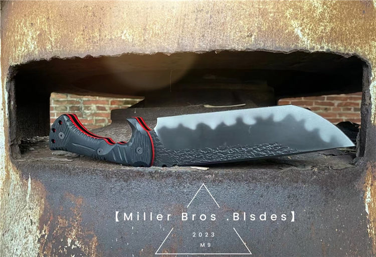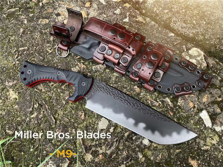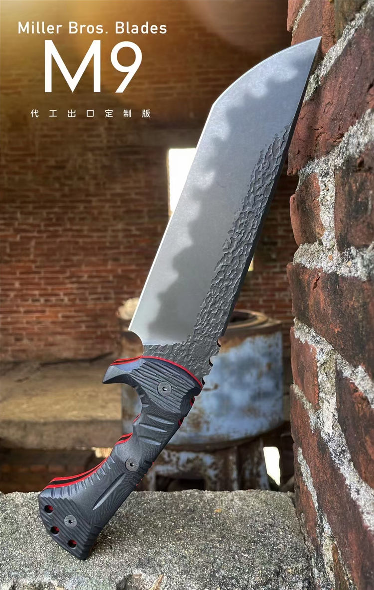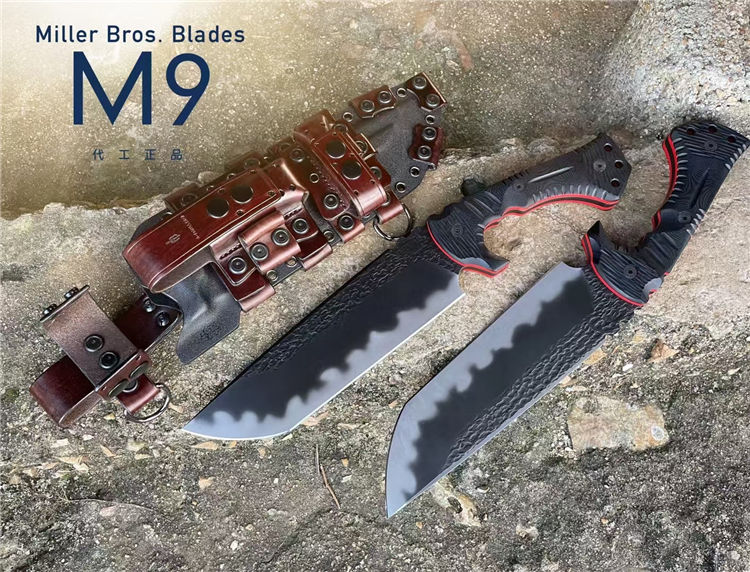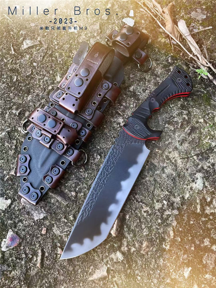 米勒兄弟M9直升机直刀 总长:39cm 刃长:22cm 刃厚:7MM 钢材:公司提供CTS-XHP粉末高 工艺:一体龙骨、专业真空深冷油淬热处理、钢印品牌logo 硬度:60-62HRC稳定值、硬度稳定、保持性好 表面:保留锻造钢锤纹,特色做旧迷彩工艺 单重:940G,含鞘1428G 手柄:黑色与红色G10复合特殊材料、表面进行手工制作防滑纹理,保持良好的舒适度与手感 包装:手工黑色盒子