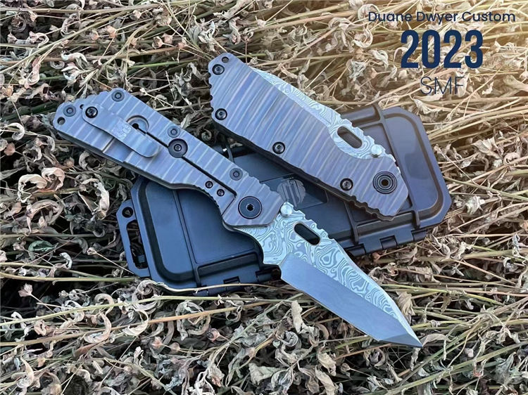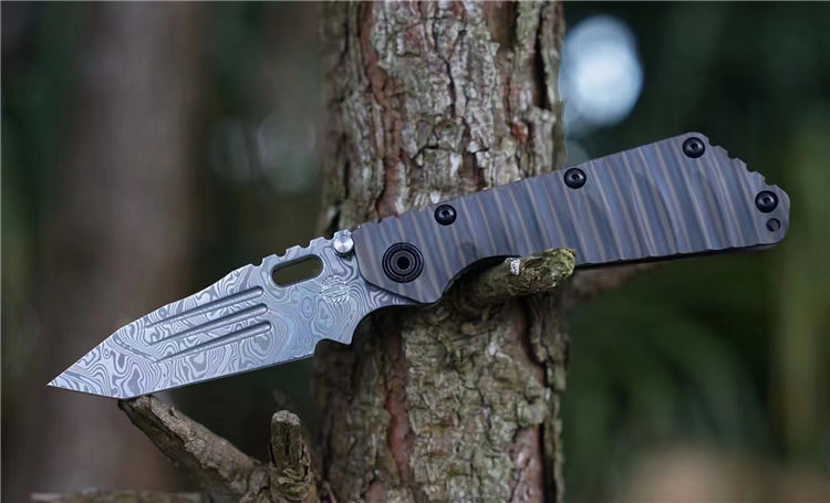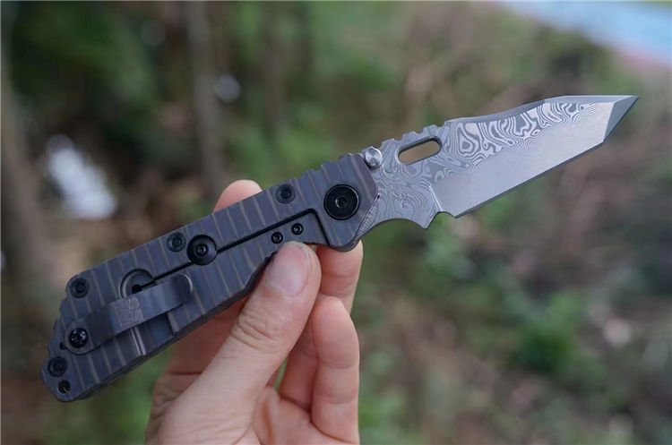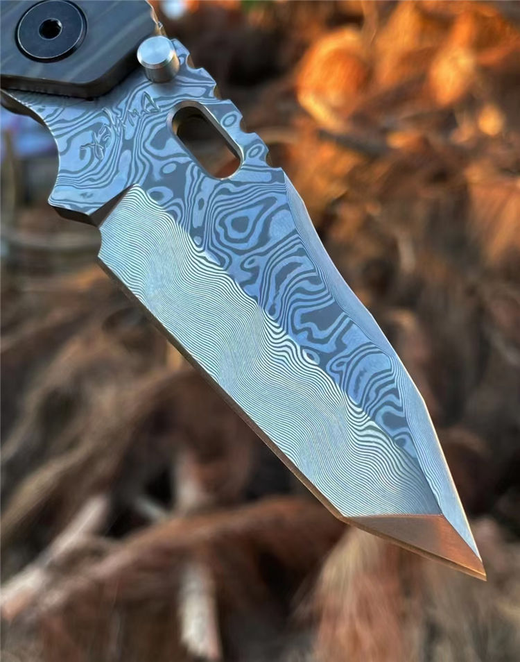 挺进者SMF三叉戟折刀 总长:22CM 刃长:7.5CM 刃厚:6MM 刃宽:3.5CM 钢材:公司提供手工锻造VG10大马士革钢(110层) 热处理:专业真空深冷热处理 硬度:60-61HRC 表面:锻造扭绞大马纹 重量:207G 柄材:TC4钛合金双面烧钛,低骨与背夹子都采用TC4钛烧刃 包装:高密度专业防水盒子