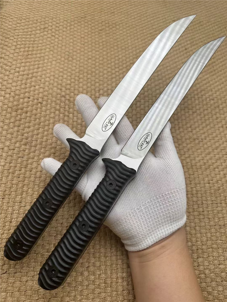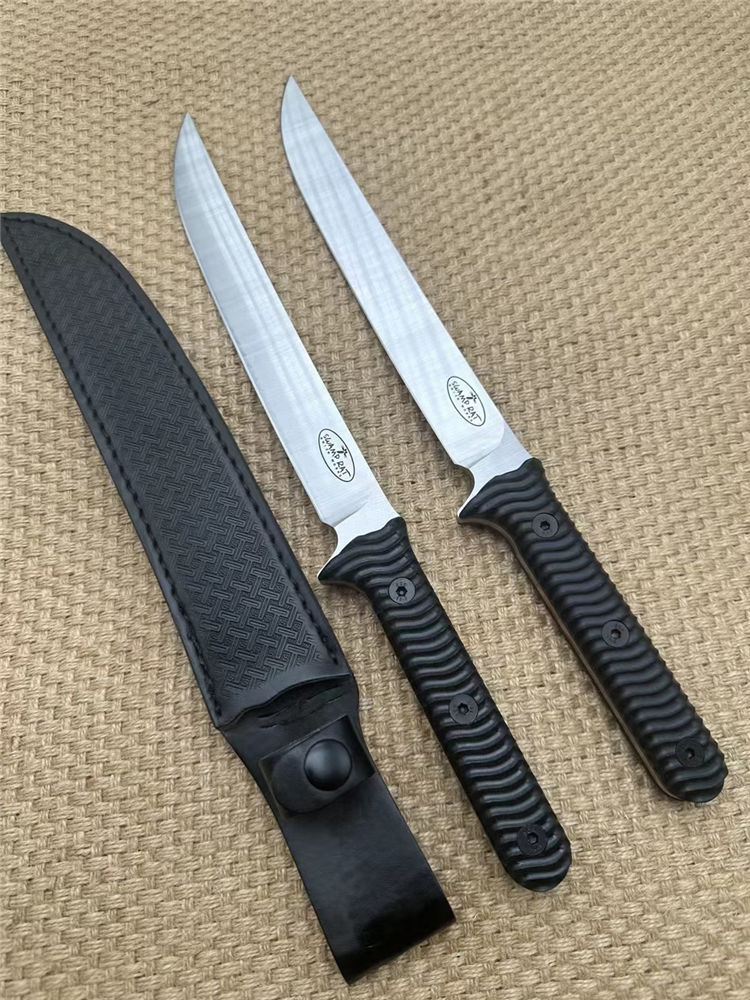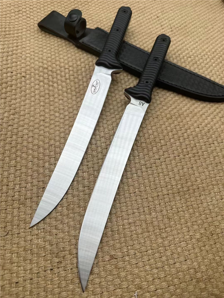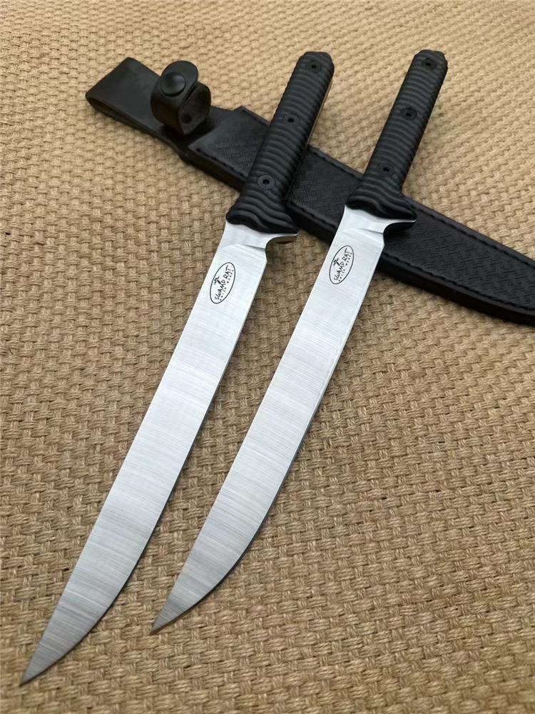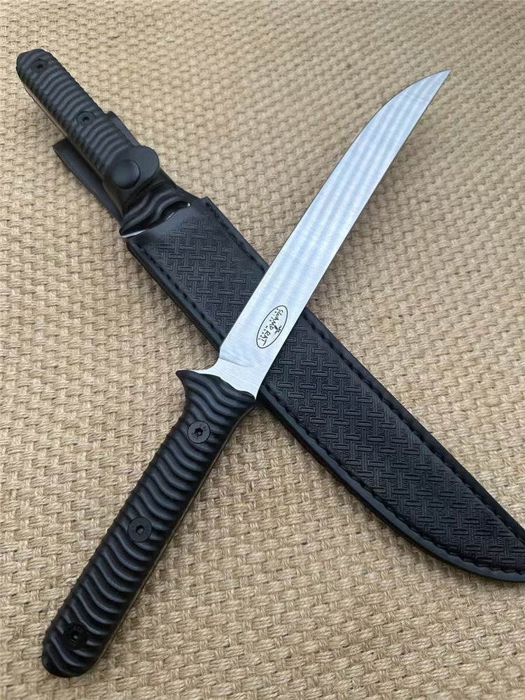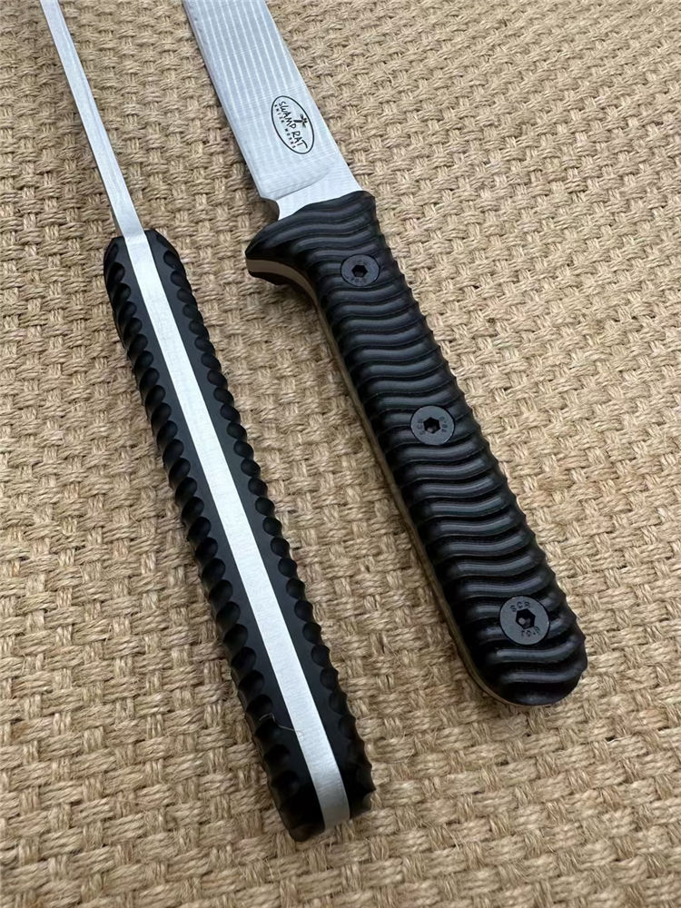 巴斯小号沼泽鼠直刀 钢材:A8钢 总长:37cm 刃宽:2.8cm 刃长:21.5cm 刃厚:5MM 表面:砂光 重量320g裸刀 硬度:60HRC真空深冷热处理,非常强悍的一款霸气中直 柄材:黑G10 开刃:水冷二次开刃 刀套:皮套