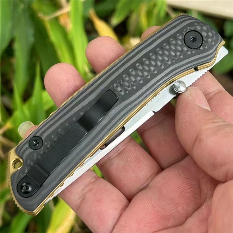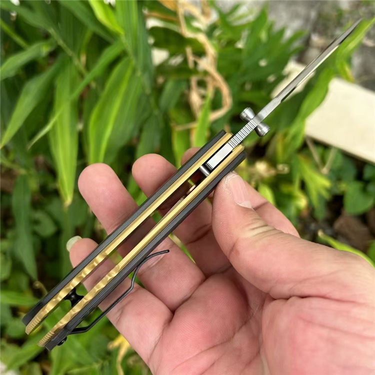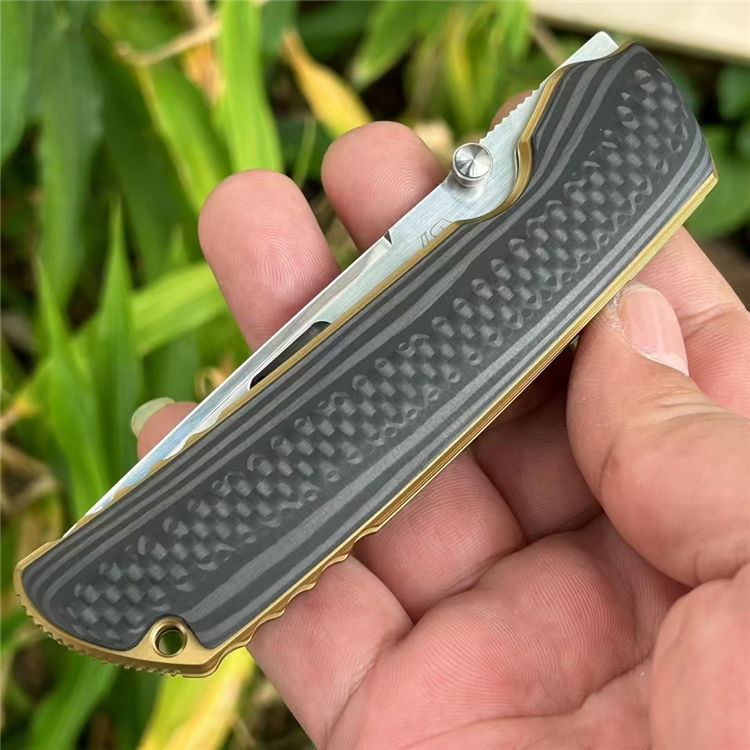 花田洋肥后2折刀 全长:21mm 刃长:90mm 柄长:120mm 刃宽:26mm 刃厚:3.6mm 刃材:VC10(深冷处理) 重量:148g 硬度:59-60HRC 表面:拉丝/镜光 柄材:TC4钛合金+炭纤维 刀夹:TC4钛合金 结构:陶瓷轴承垫片 其他:防水盒