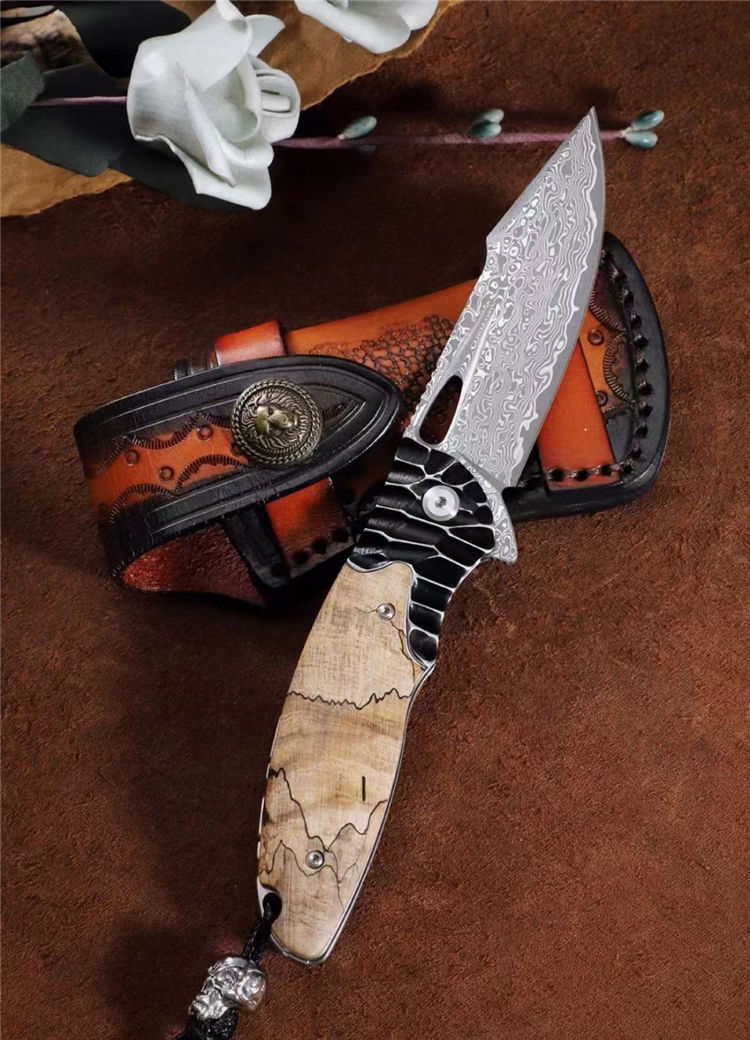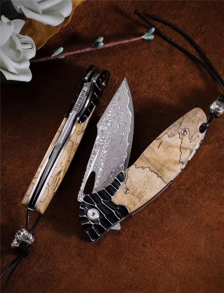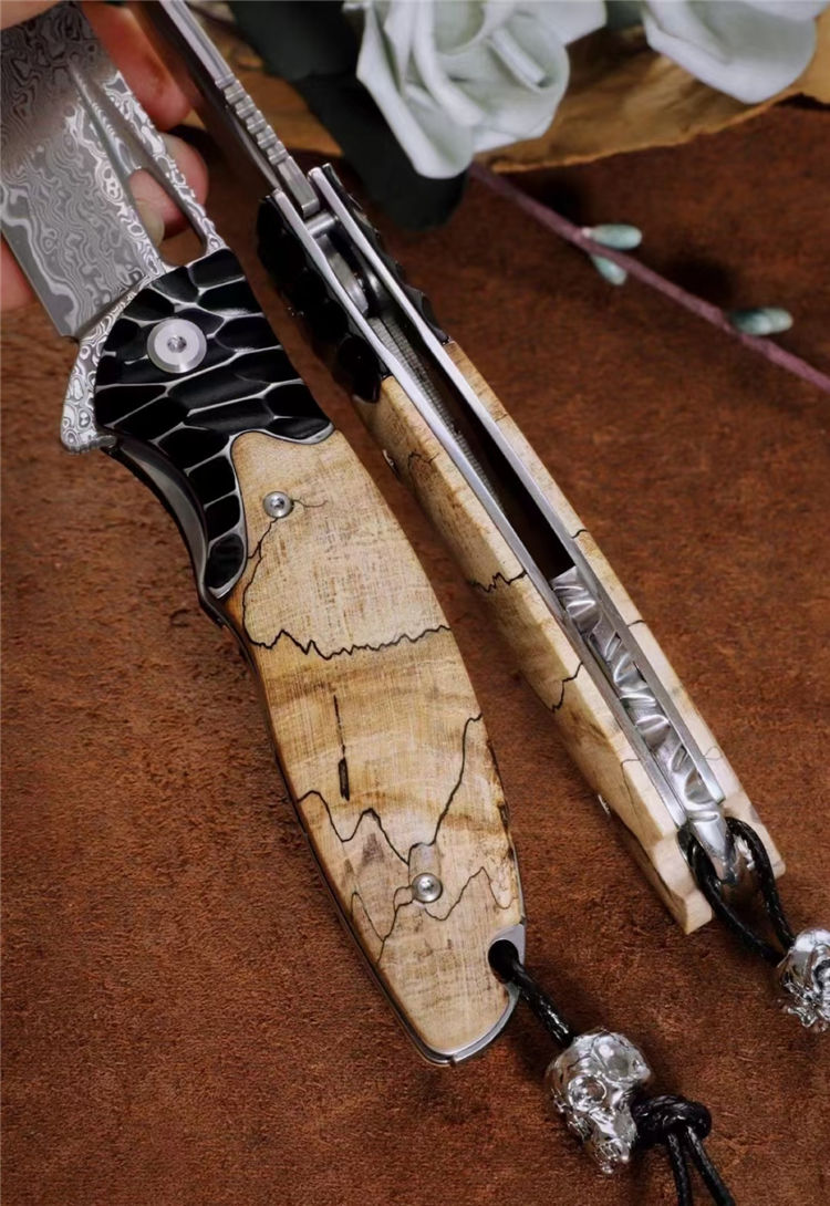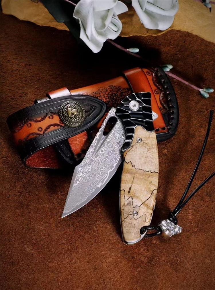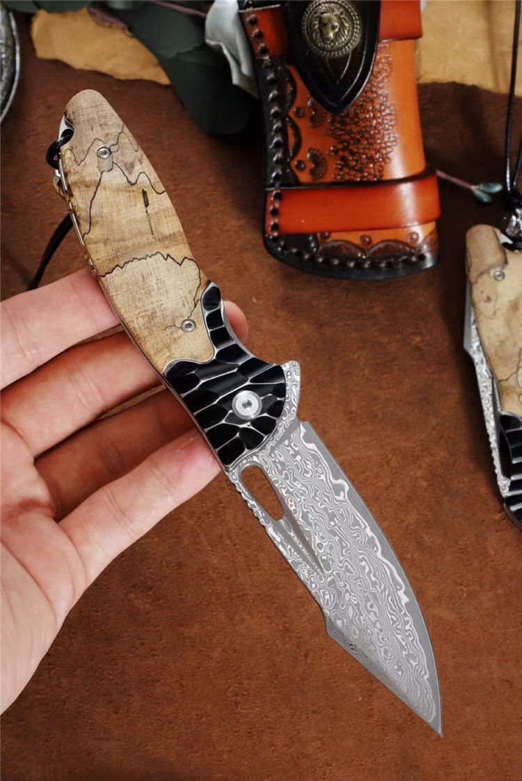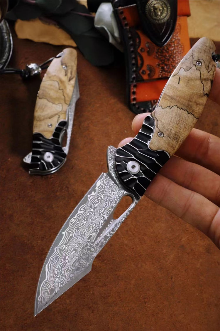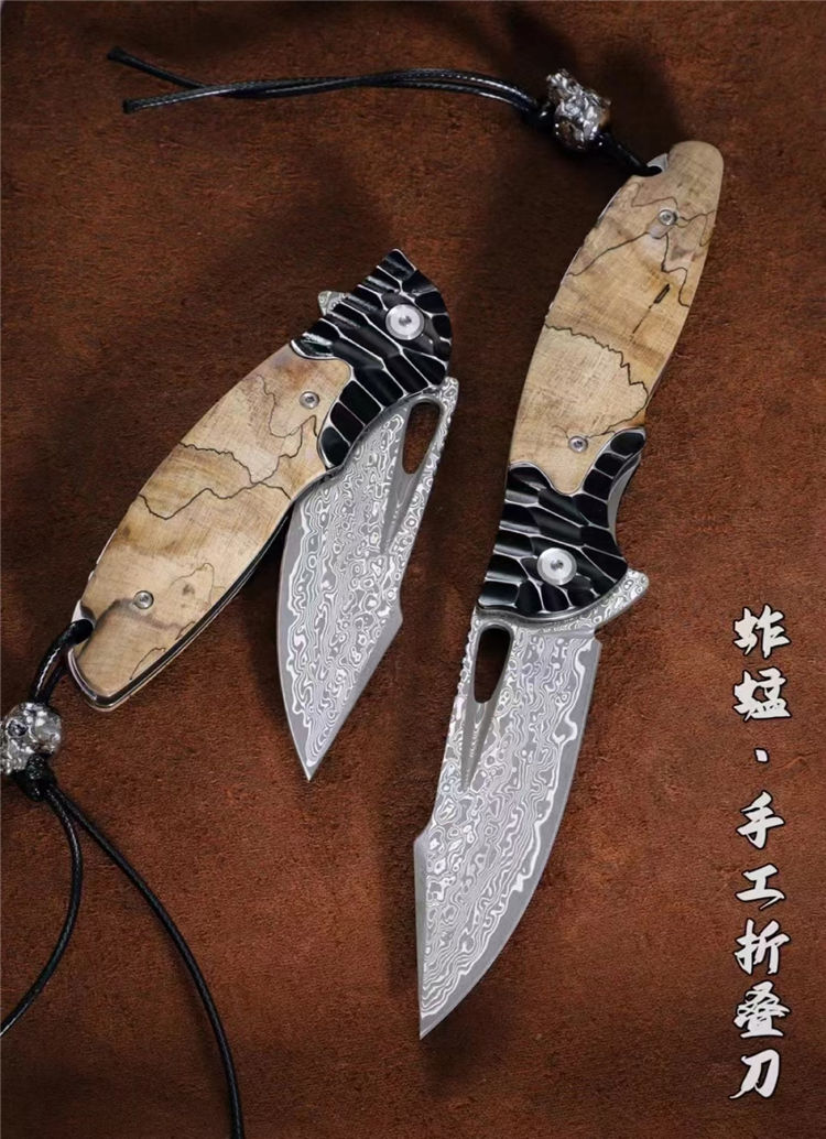 大马士革蚱蜢折刀 总长:20cm 刃长:8.8cm 闭合:10.5cm 刃宽:2.8cm 刃厚:3mm 材质:85层大马士革钢(祥云花纹) 开刀:陶瓷滚珠轴承 硬度:60HRC 柄材:304不锈钢雕刻+进口稳定木 包装:吊坠+皮套+手工黑硬盒