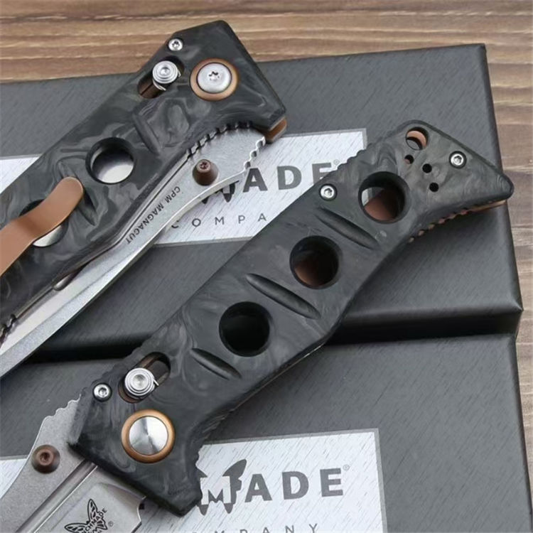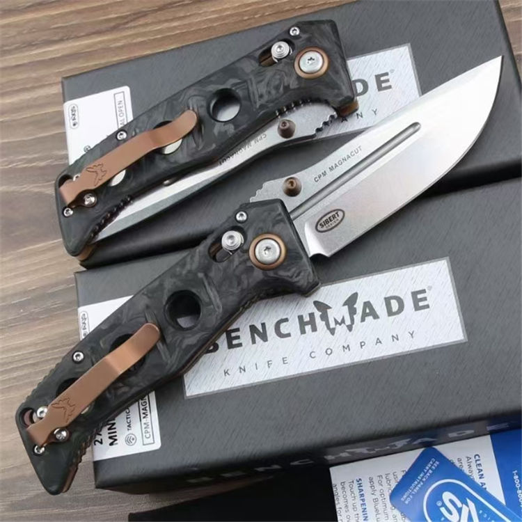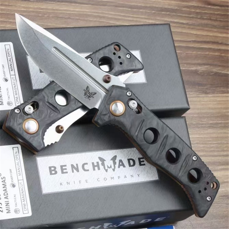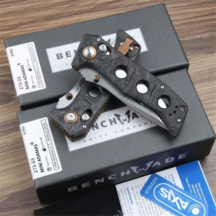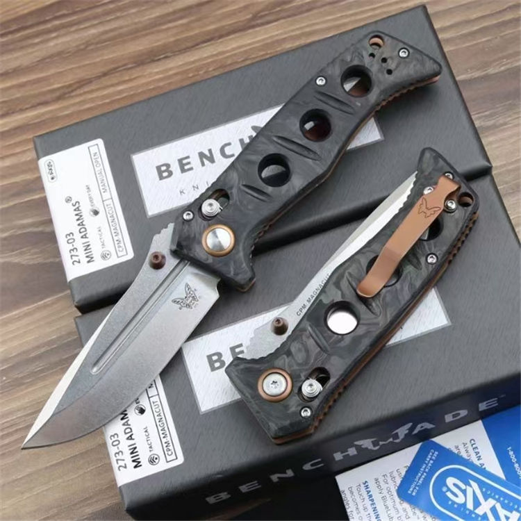 蝴蝶273-03碳纤维折刀 总长:19.3cm 刃长:8.3cm 柄长:11cm 钢材:440c 厚度:3.2mm 硬度:58HRC 重量:107克 柄材:碳纤维+钢 包装:彩盒