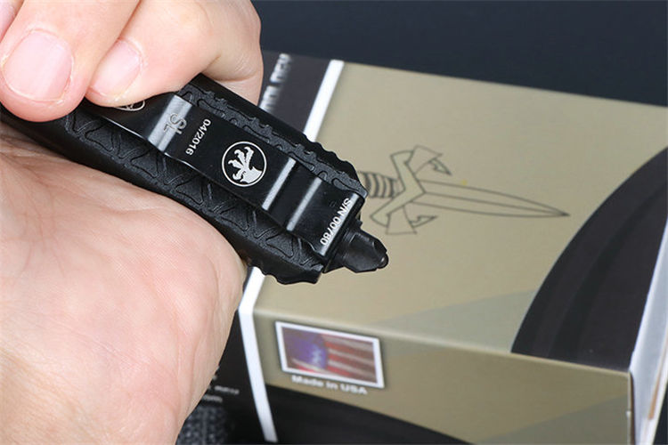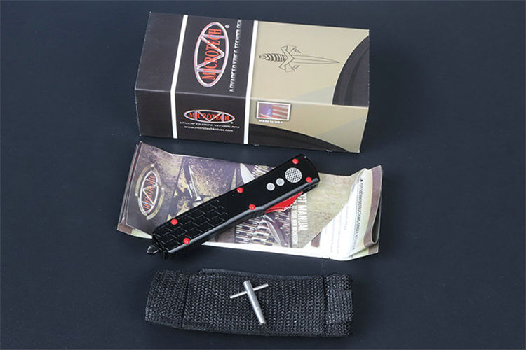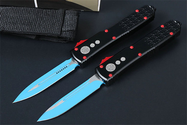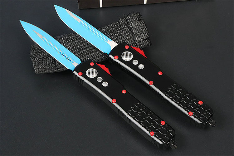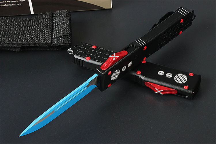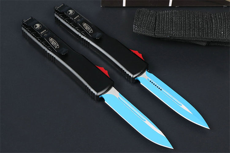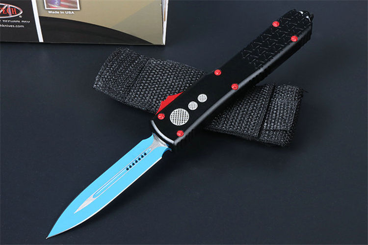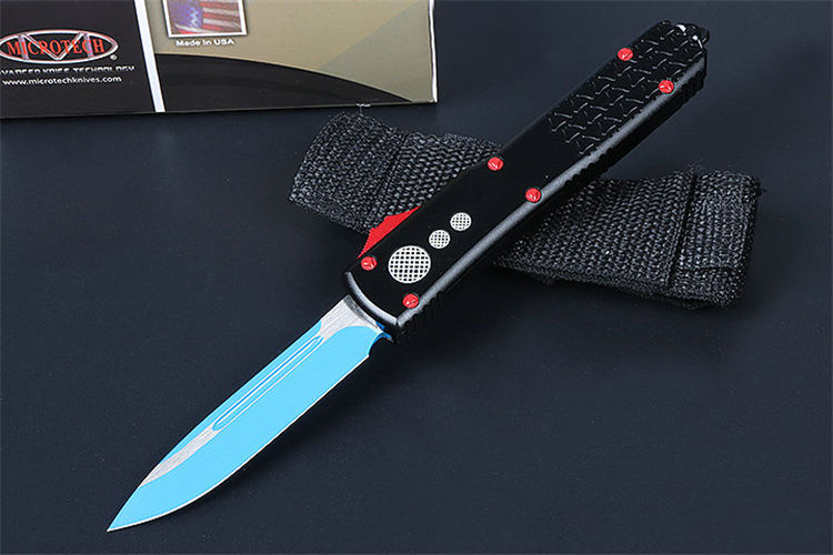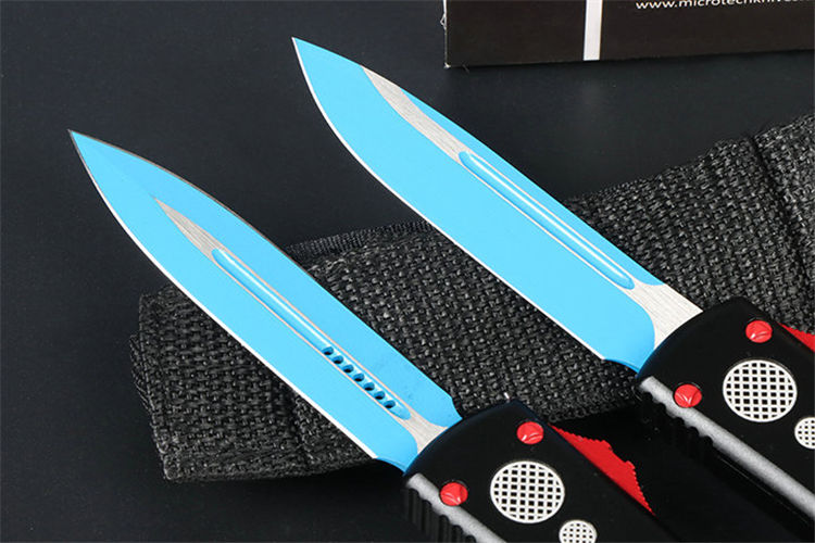 微技术A7蓝钛直出跳刀 全长:22CM 刃长:9CM 柄长:13CM 刃宽:1.8M 刃厚:0.31CM 刃材:5CR13 ,表面蓝钛加拉丝 柄材:T6铝合金 刀型:直跳 锁定:按钮锁 刀重:100克 重量:180克(含包装) 附件:尼龙套,说明书,彩盒,送拆刀工具