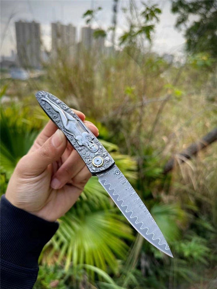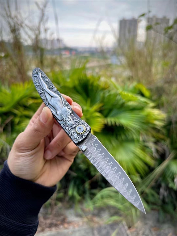 大马士革慕莎裸女折刀 全长:19cm 刃长:8cm 折合:11cm 厚度:3mm 刃材:进口锻造78层大马士革 硬度:60HRC