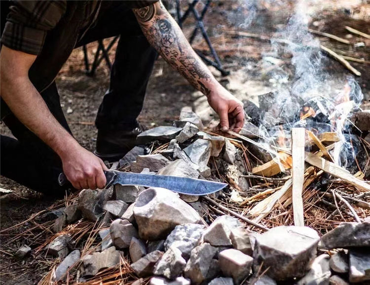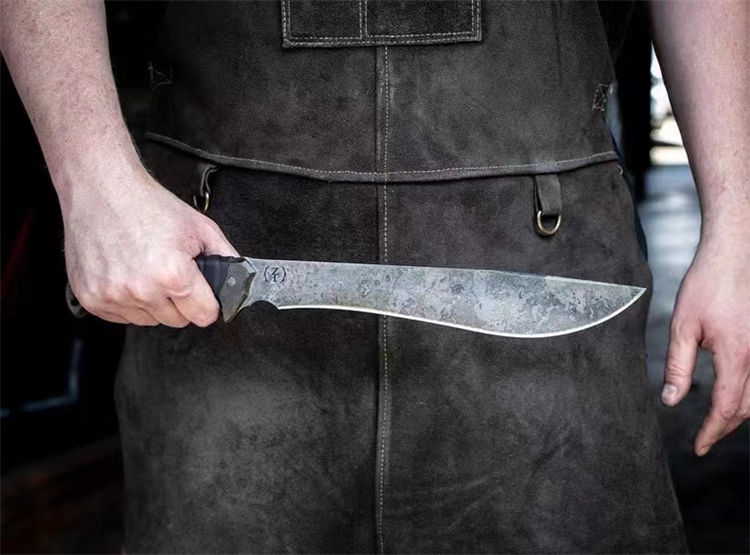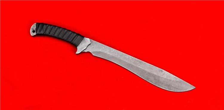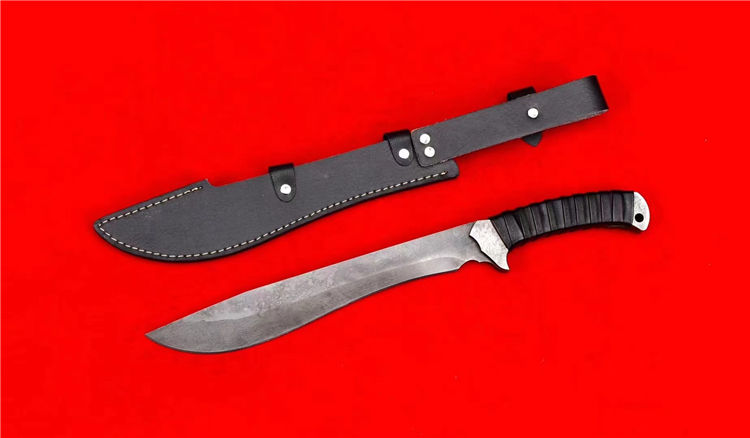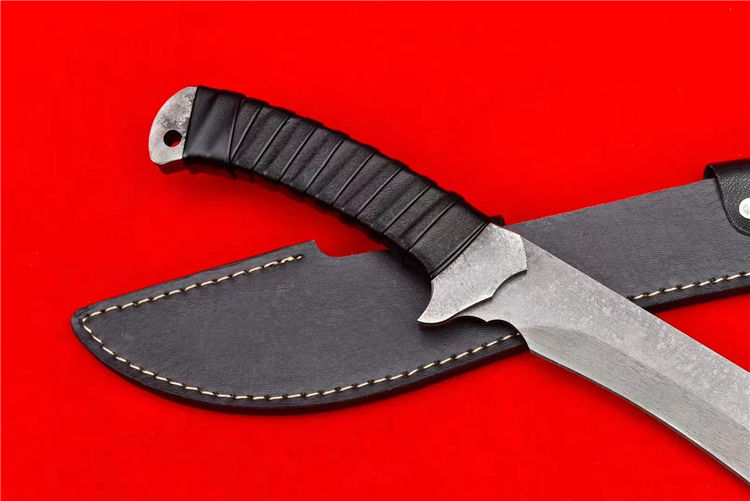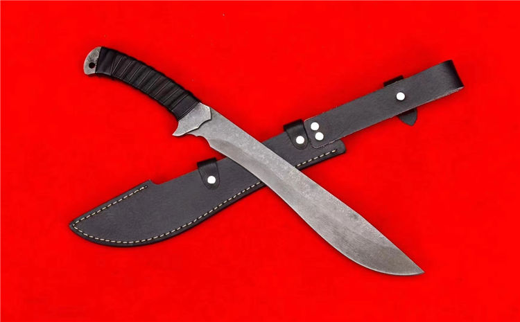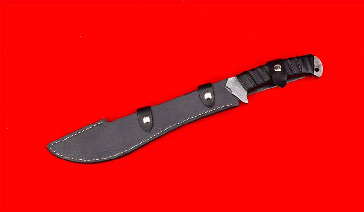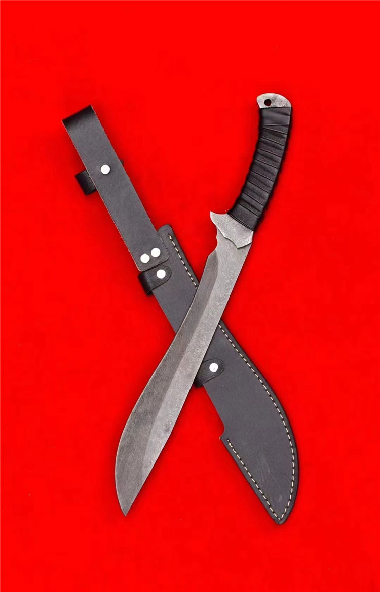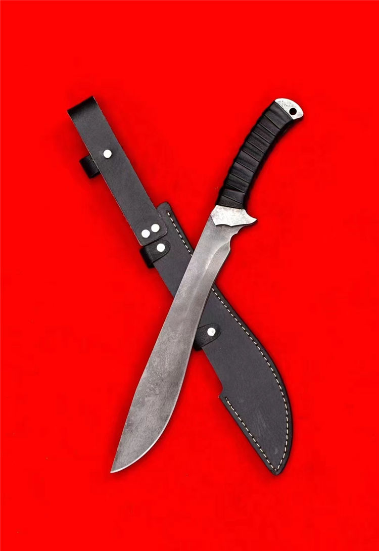 末日废土小弯刀 全长:44.5cm 刃长:27cm 刃厚:4.5mm 一体锻造切割,金属贴片缠皮绳,配PU鞘