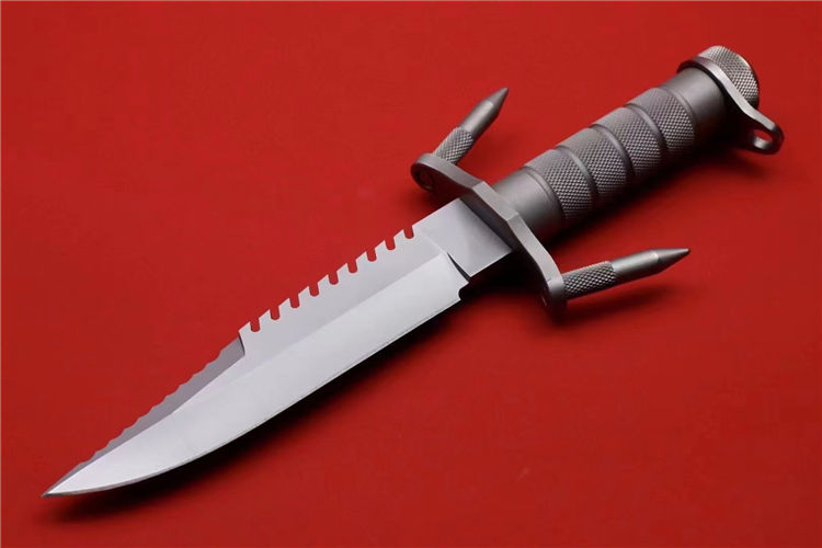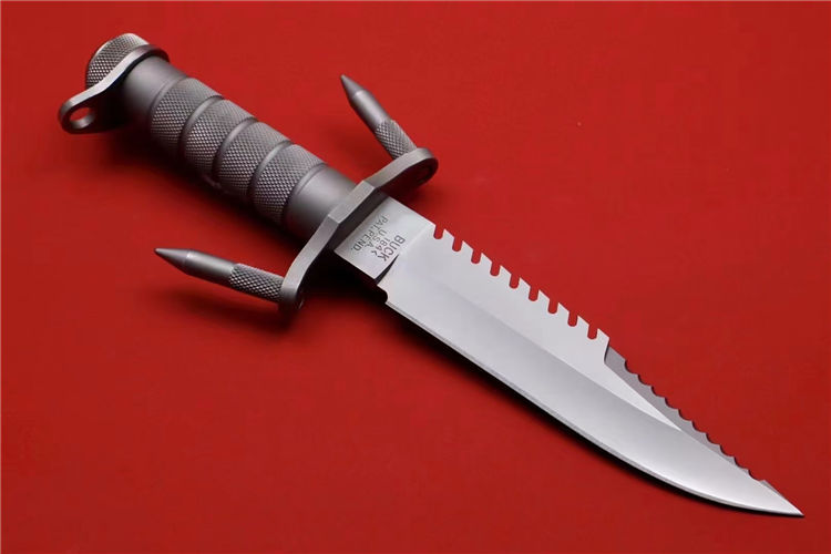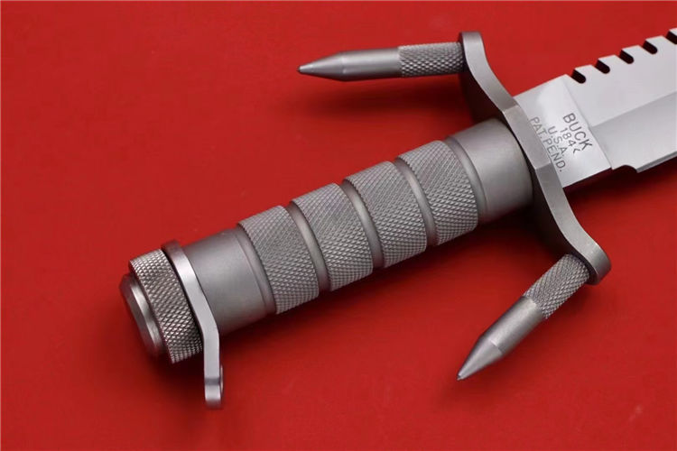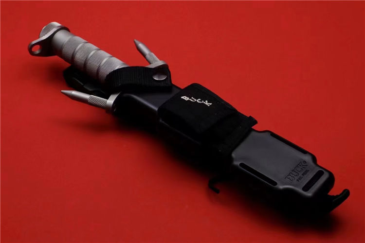 巴克BUCK184海军海豹突击队直刀 总长:32CM 刃长:19CM 刃厚:0.6CM 刃材:美国锻造合金钢 硬度:61HRC 手柄:高强度合金钢 附件:手柄内置野外求生器材 刀鞘:附带绑腿磨刀石,附带两枚铆钉