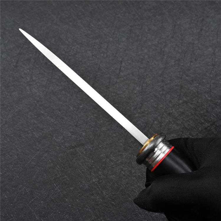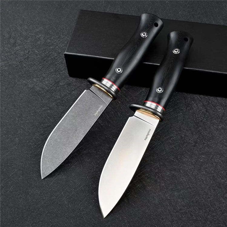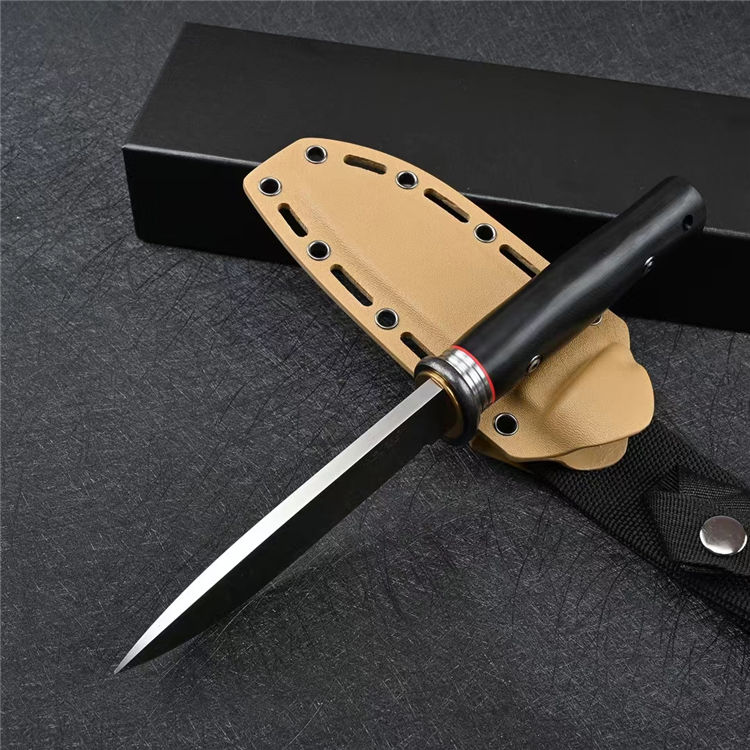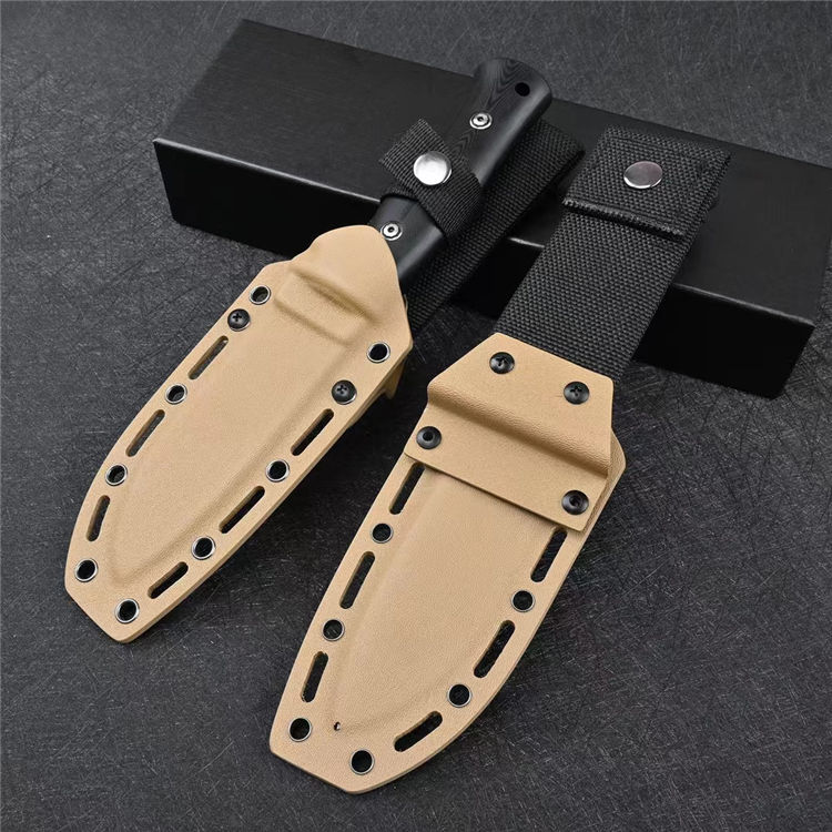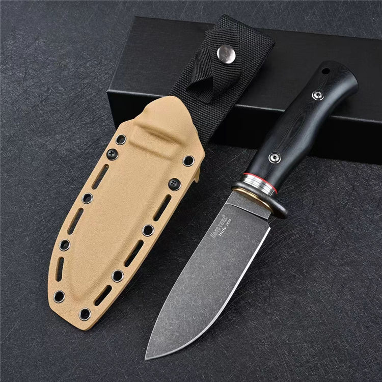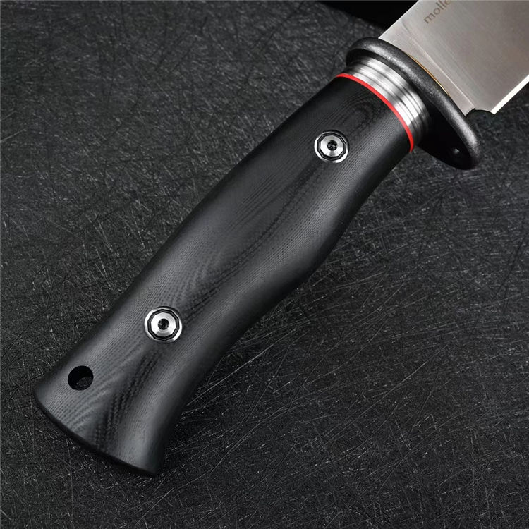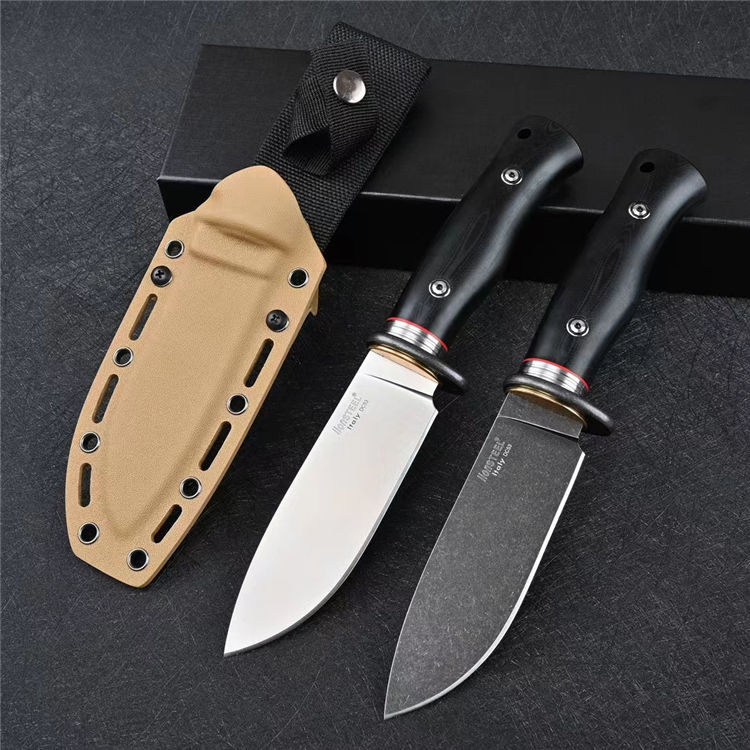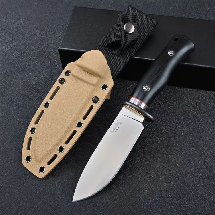 意大利T8钢狮直刀 全长:26.2cm 刃长:12.4cm (开刃处) 柄长:13cm 刃厚:0.55cm 刃宽:3.7cm 刀重:367g 毛重:627g 钢材:DC53钢 柄材:钢头+G10 硬度:60-61HRC 表面:砂光/黑色石洗 包装:礼盒 刀鞘:K鞘