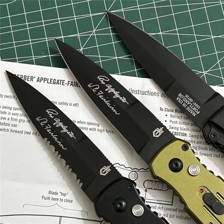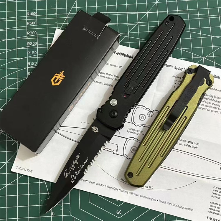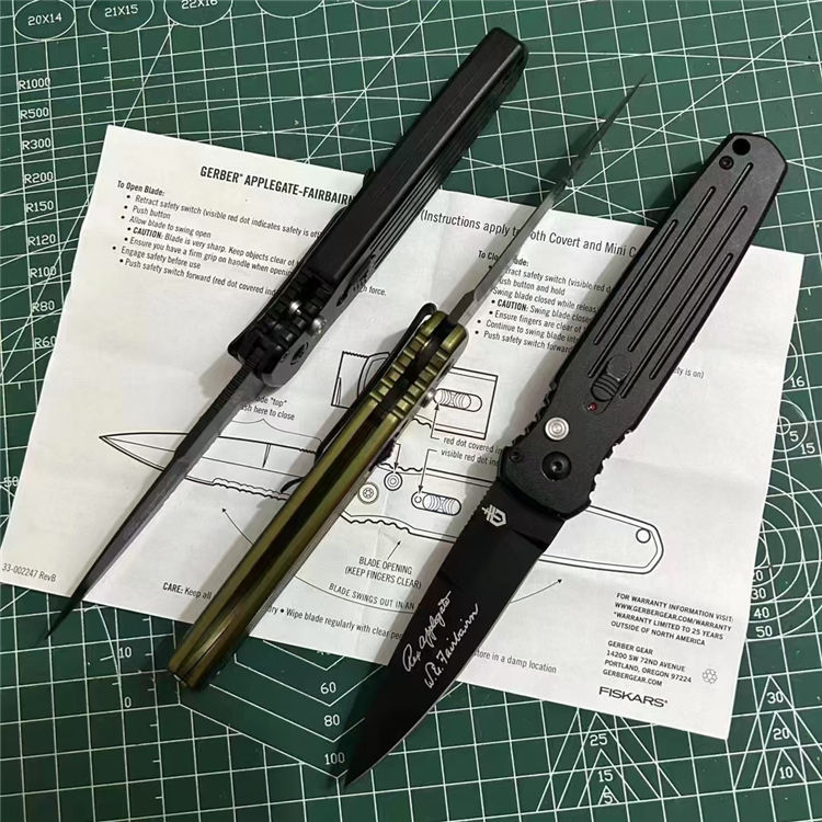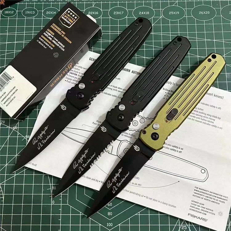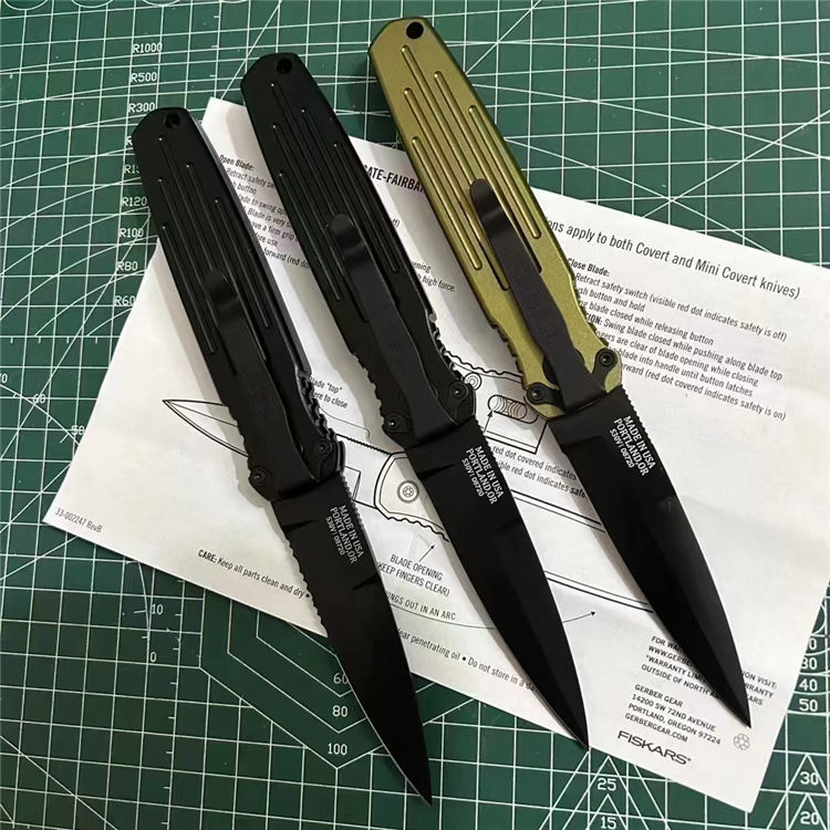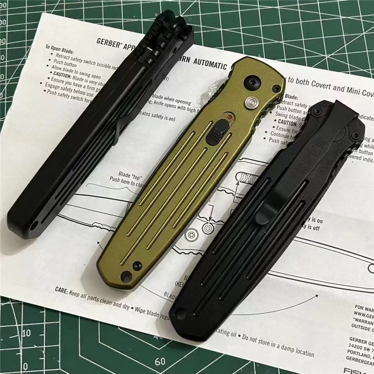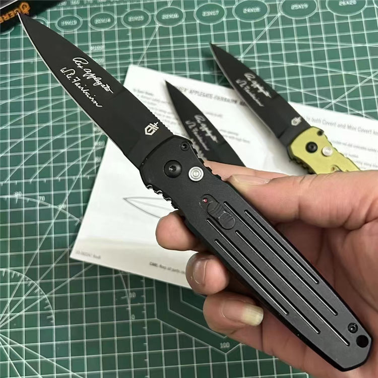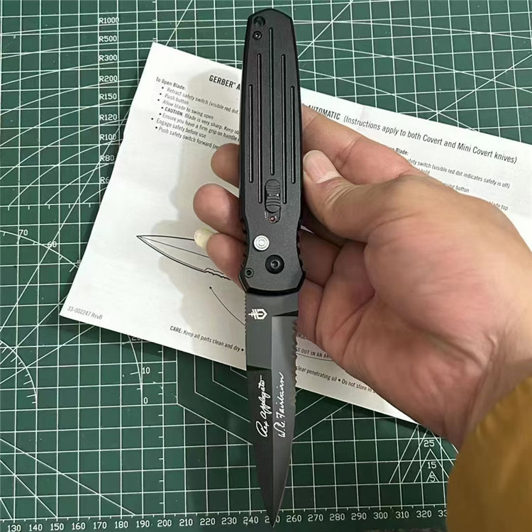戈博Auto Covert侧开跳刀 全长:200mm 刃长:87mm 柄长:125mm 刃宽:22mm 刃厚:2.9mm 刃材:S30V 刀重:108g 硬度:58-60 HRC 表面:发黑处理 柄材:航空铝(阳极氧化),经CNC电脑锣成型,做工精细 其他:配彩盒+说明书