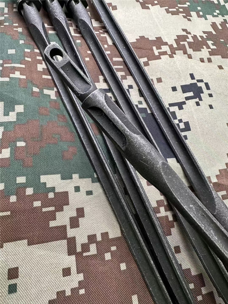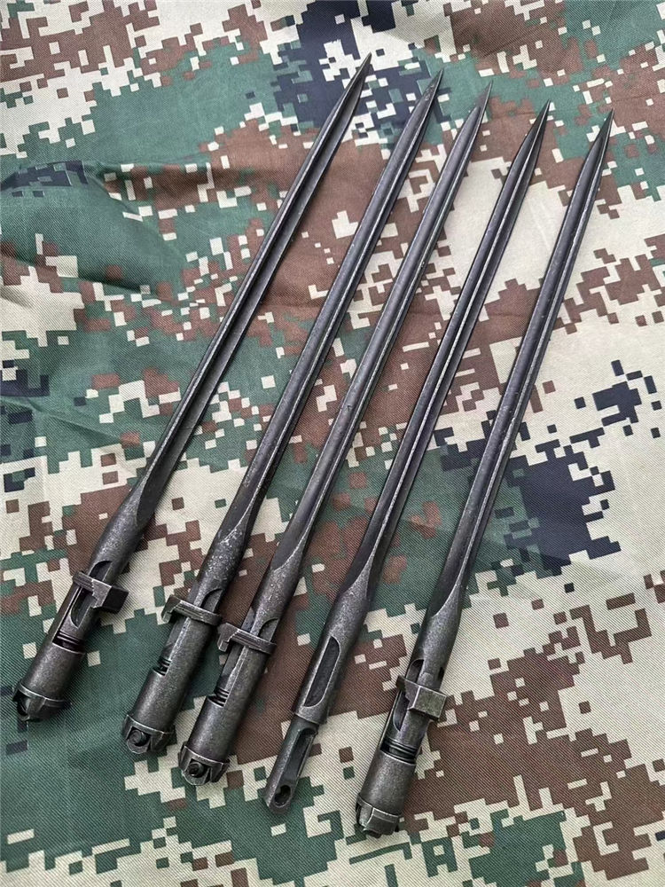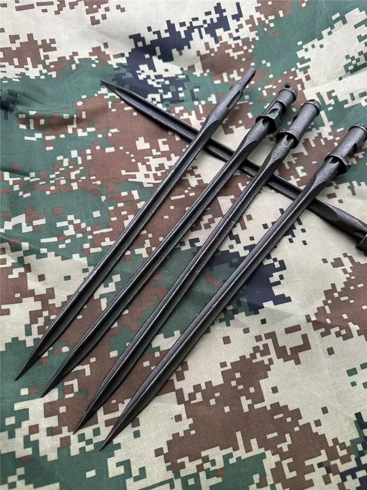 复刻做旧款63式三棱刺刀 全长:38cm 刃长:30cm 刃厚:1.2cm 刃宽:1.2cm 材质:合金钢 复刻做旧款,表面有轻微瑕疵 沙眼属于正常问题 三棱刮刀式刺刀,大大提高了枪刺的强度、刚度和刺入深度,仅用于63式自动步枪,是中国步枪最后一种折叠刺,也是一个时代的终结