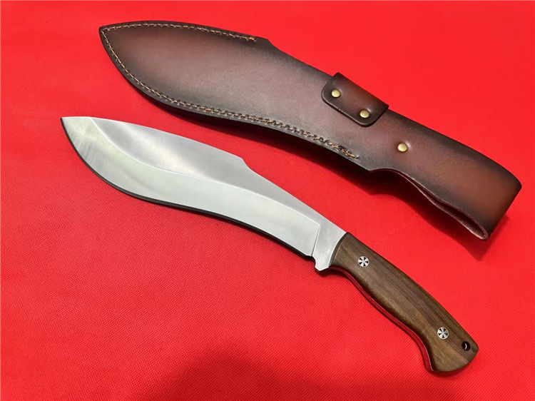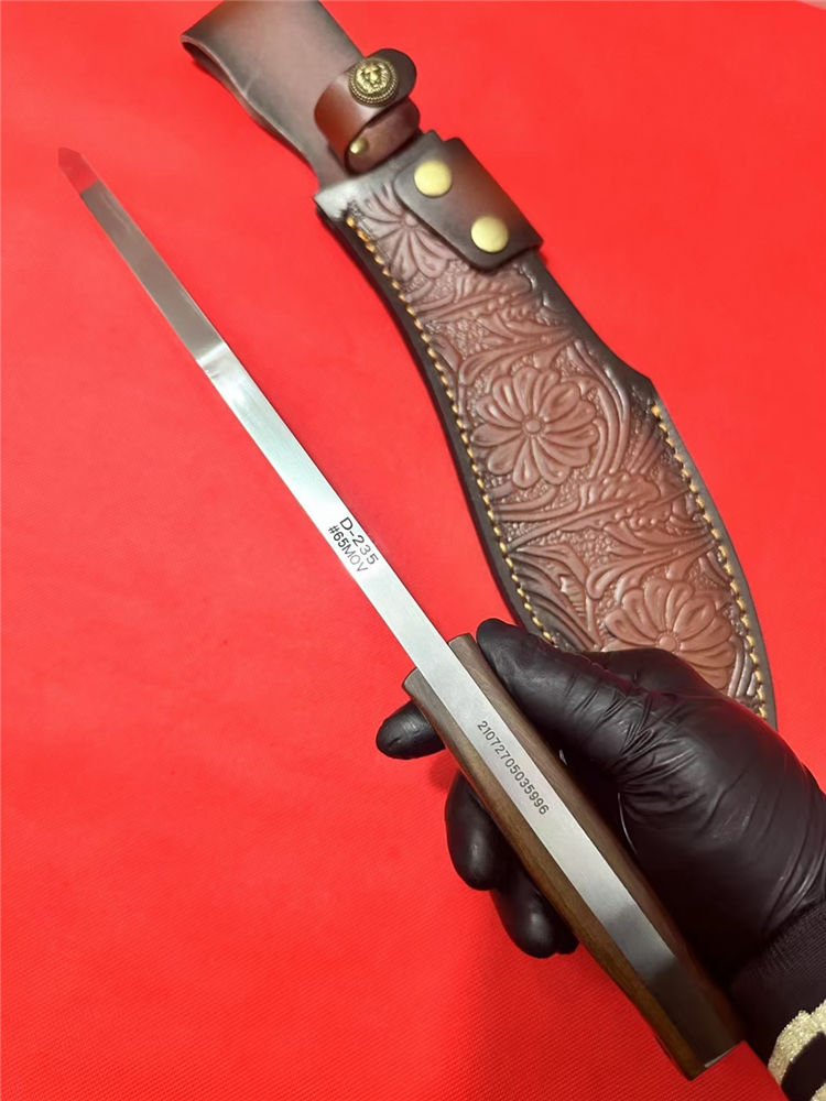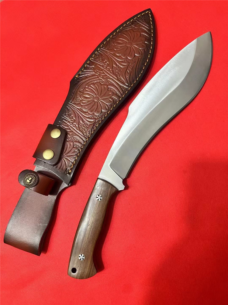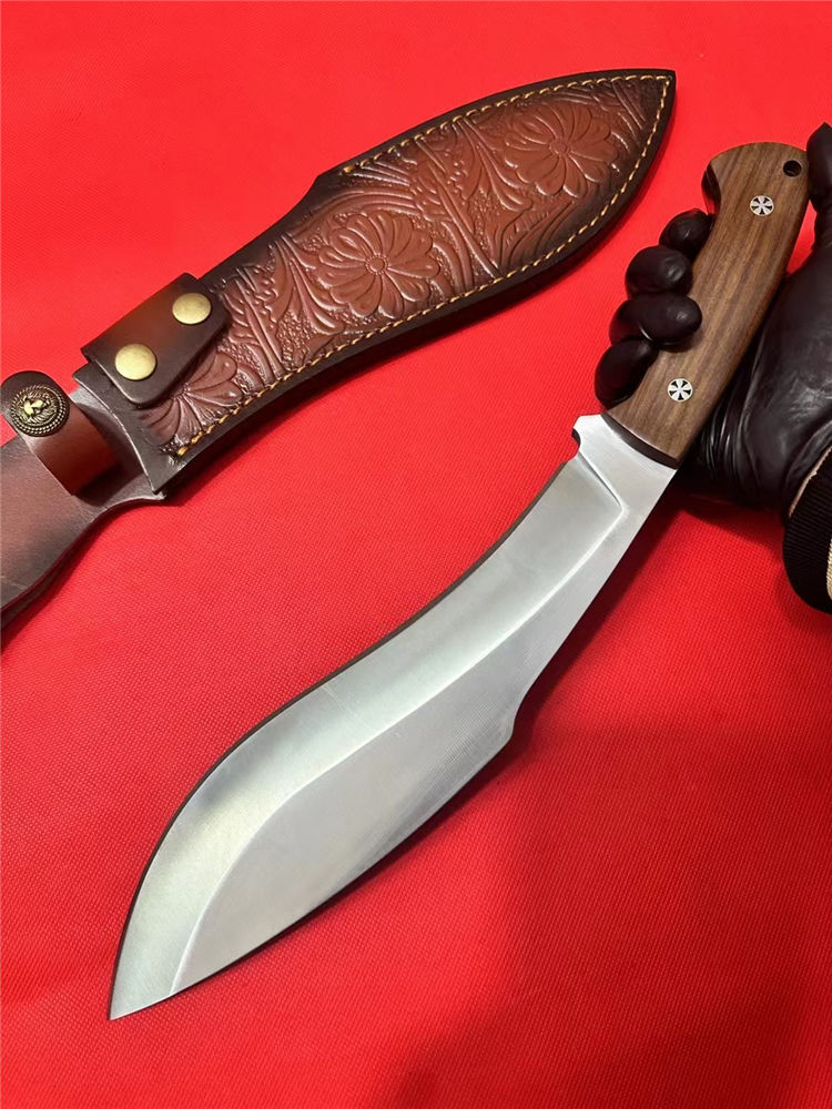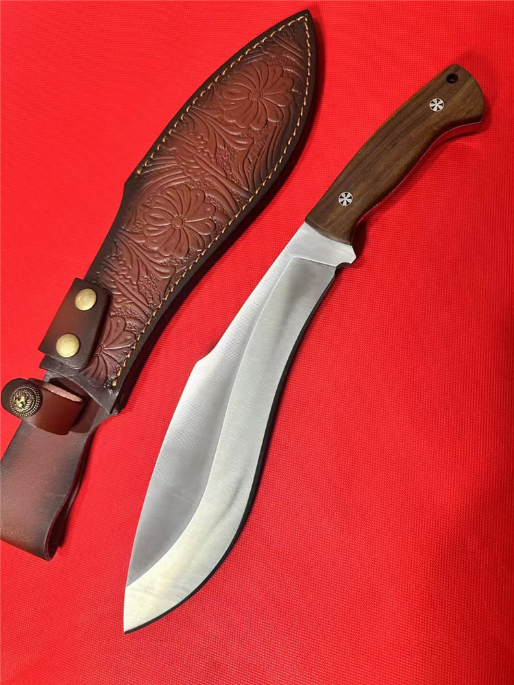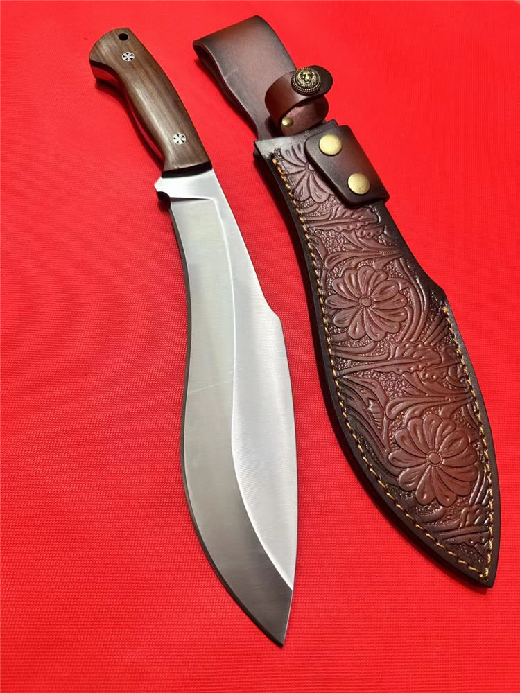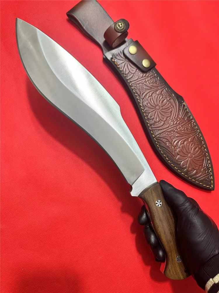 重装巡山狗腿弯刀 全长:40cm 刃长:26cm 柄长:12.5cm 刃宽:70mm最宽处 刃厚:10mm 刃材:进口D235-65锰钢高温热处理 刀重:1100g 硬度:63HRC 表面:砂光拉丝 柄材:沙皮木 结构:一体龙骨 配套:进口牛皮皮套 包装:纸箱硬盒