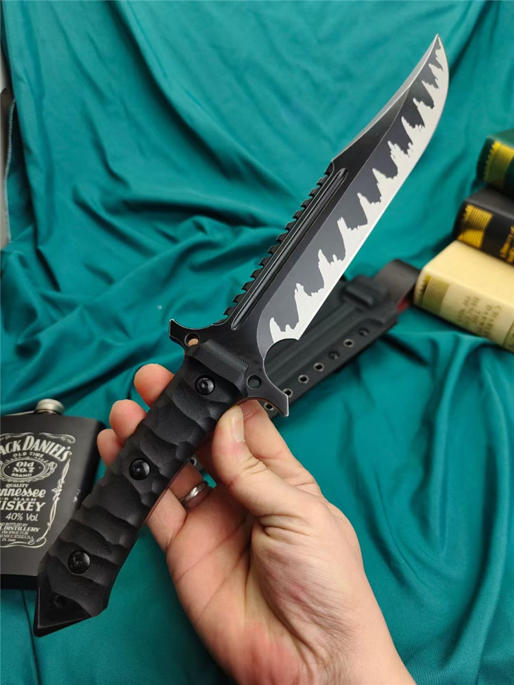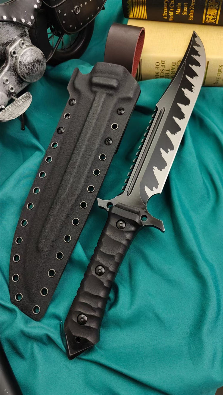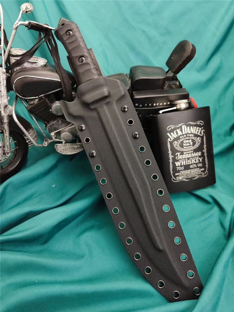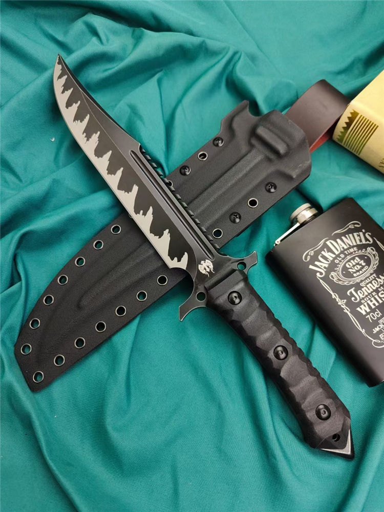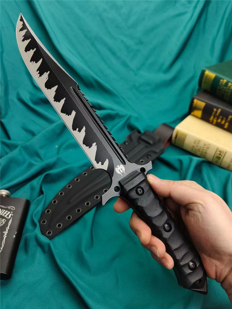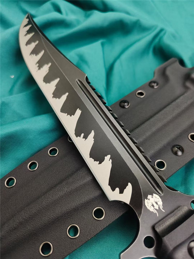 兰博鬼鉴岚直刀 全长:400MM 刃长:220MM 刃宽:40MM 刃厚:8.0MM 刃材:VG10 硬度:60HRC左右 涂层处理:火焰纹镀黑钛 配件:G10柄 K鞘:战术K鞘 重量:裸刀716克,含套884克 黑色礼盒
