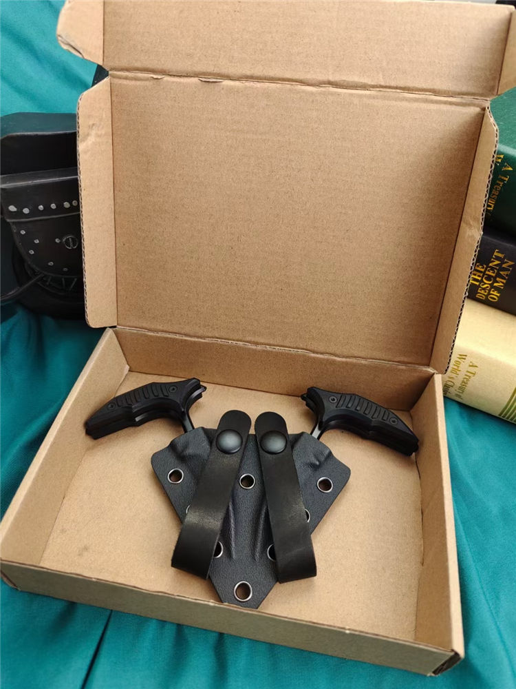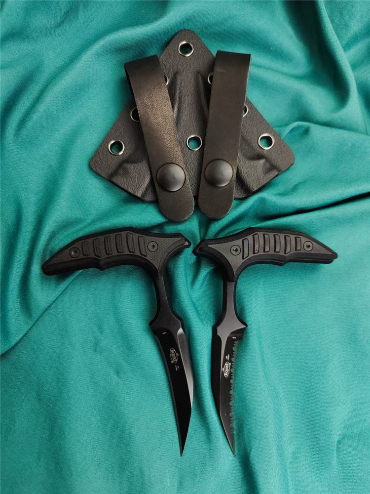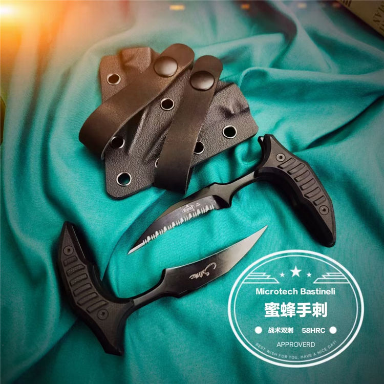 微技术黑钛版蜜蜂手刺 全长:11.2cm 刃厚:4mm 刃长:6.2cm 刃宽:1.4cm(最宽处) 柄厚:2.2cm 柄长:7.4cm 材质:M390 表面:镀黑钛 净重:77g 全重:115g 两种搭配方式可选:(全刃+全刃)(全刃+全齿)