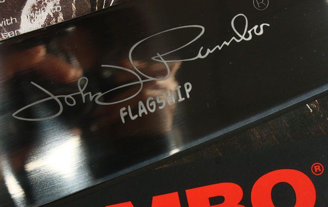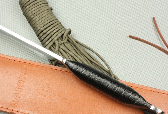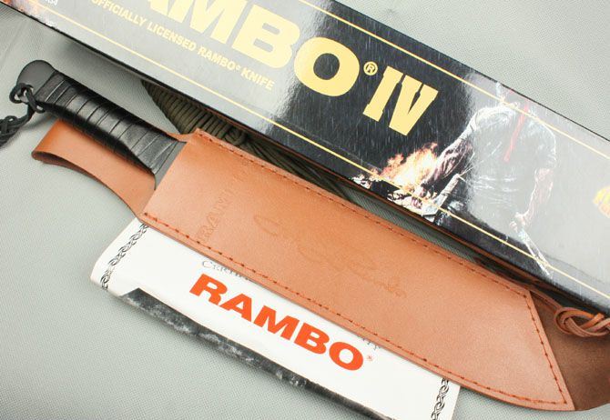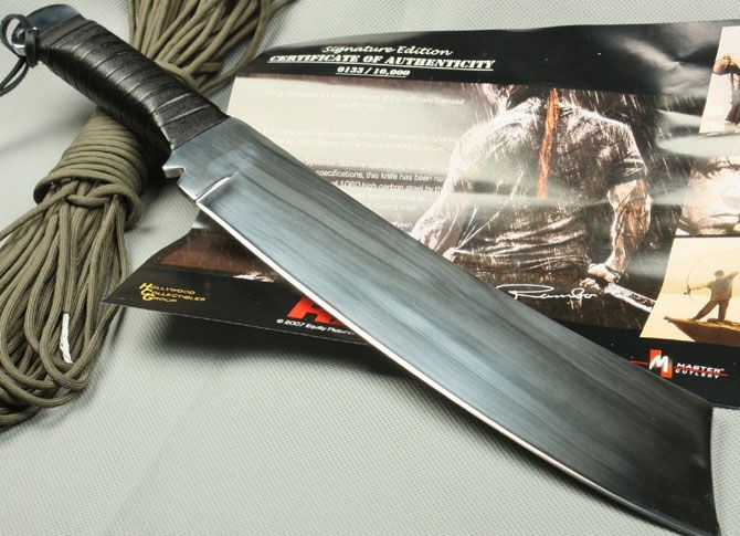 最新兰博4号手签纪念版(白) 全长:49.7cm 刀刃:30cm 刃厚:0.58cm 材料:420J2不锈钢 硬度:57HRC 柄长:16.5cm 净重:890克 毛重:1300克(包含高级金字彩盒和皮套)随附高档真皮刀套,“史泰龙”签名照一张,“出世纸”一张