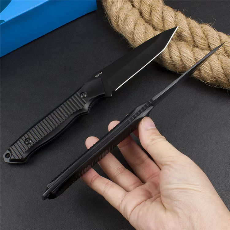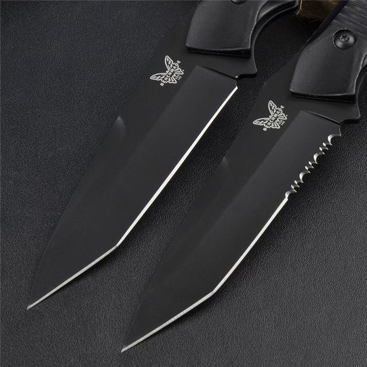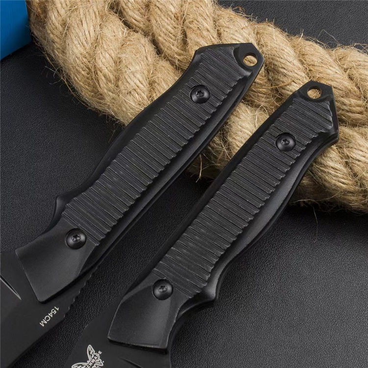 蝴蝶140BK猎虎方头直刀 全长:225mm 刃长:98mm 刃材:154cm 刃厚:4mm 柄长:125mm 硬度:58-59HRC 表面:氧化黑 柄材:铝合金 刀套:战术尼龙套(绑腿) 重量:163g 包装:原装彩盒