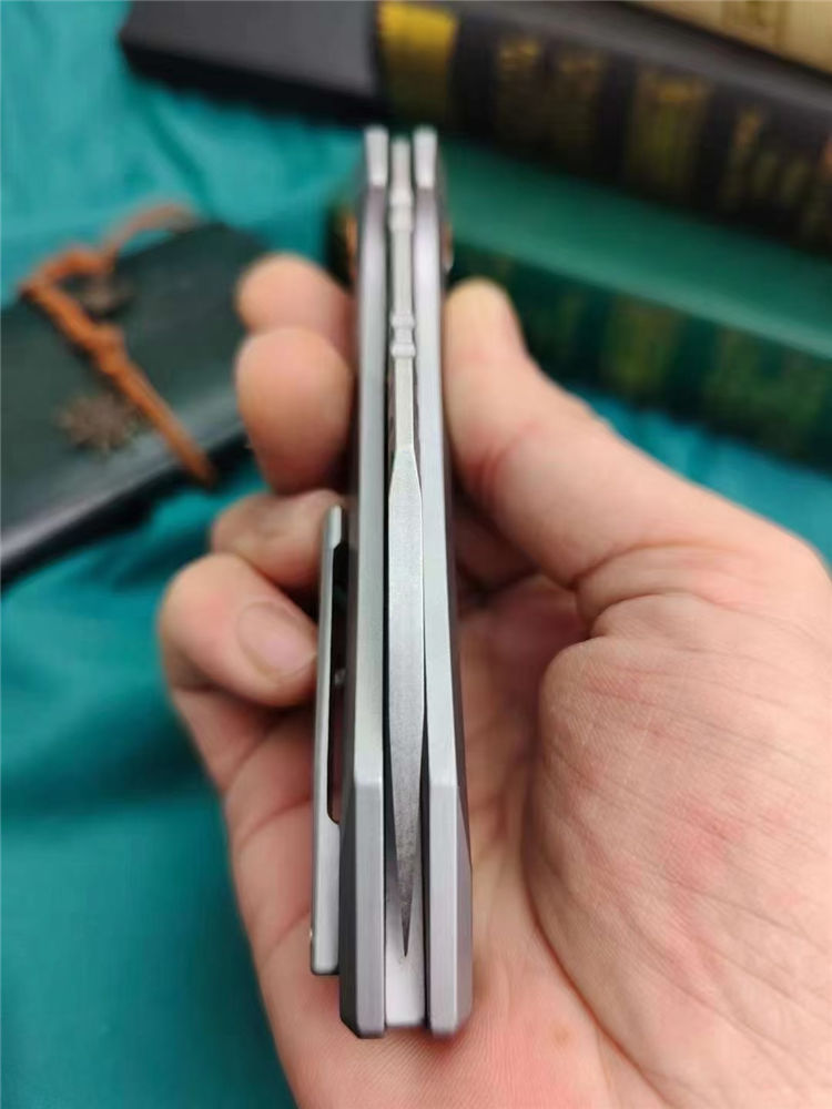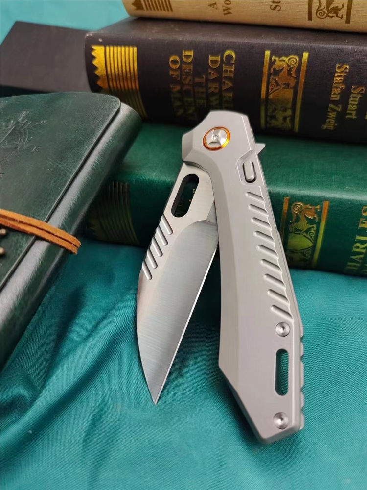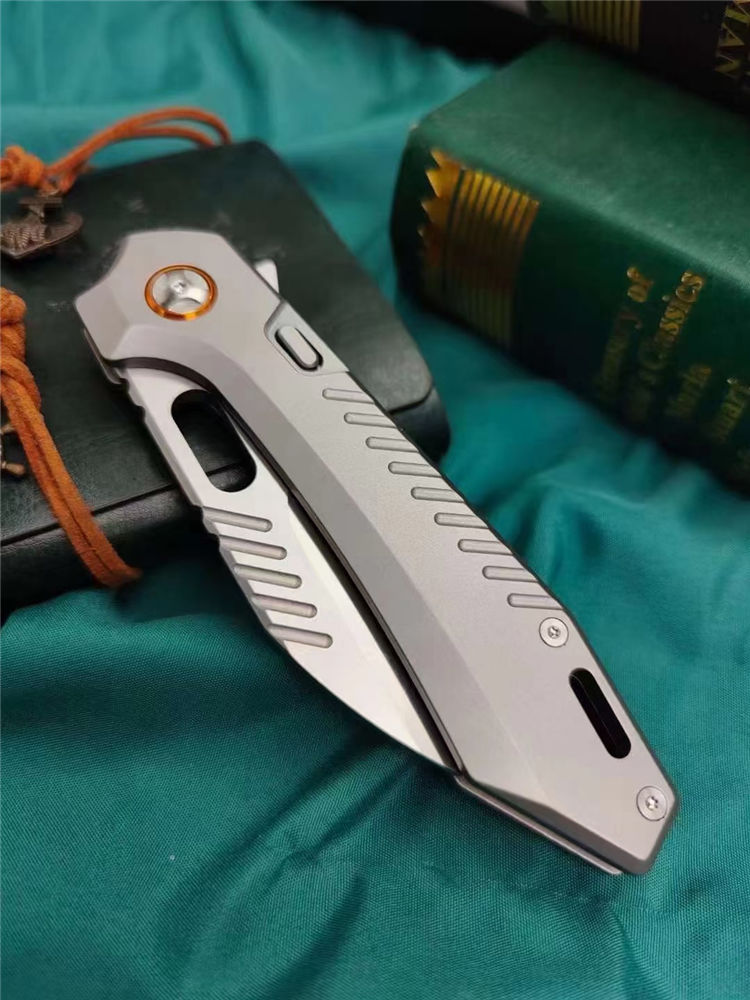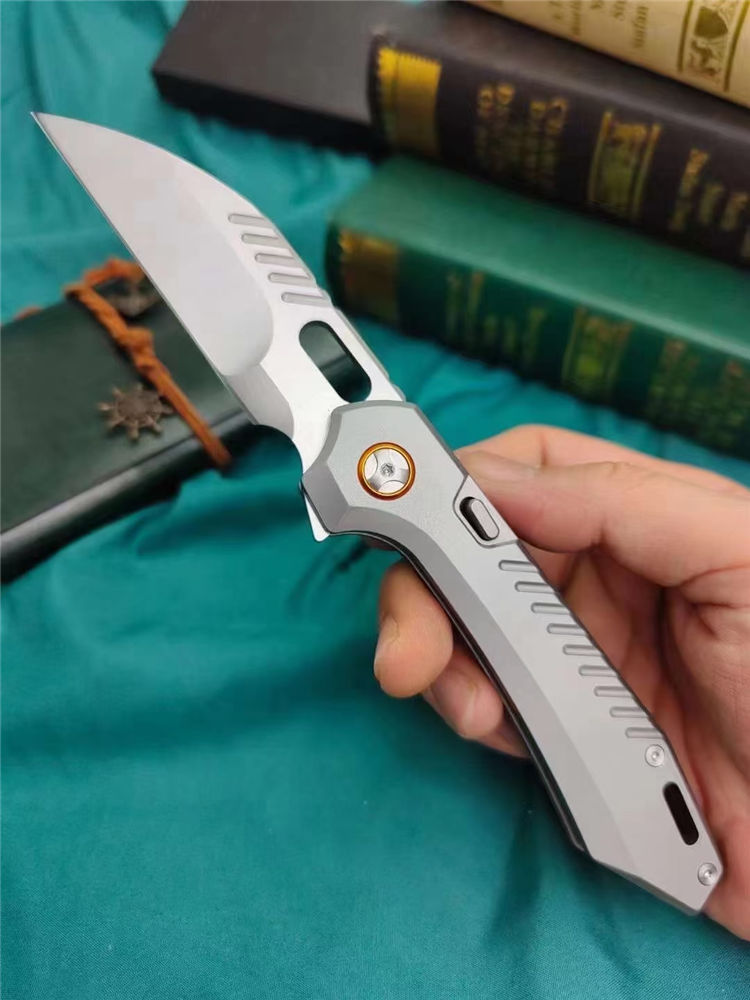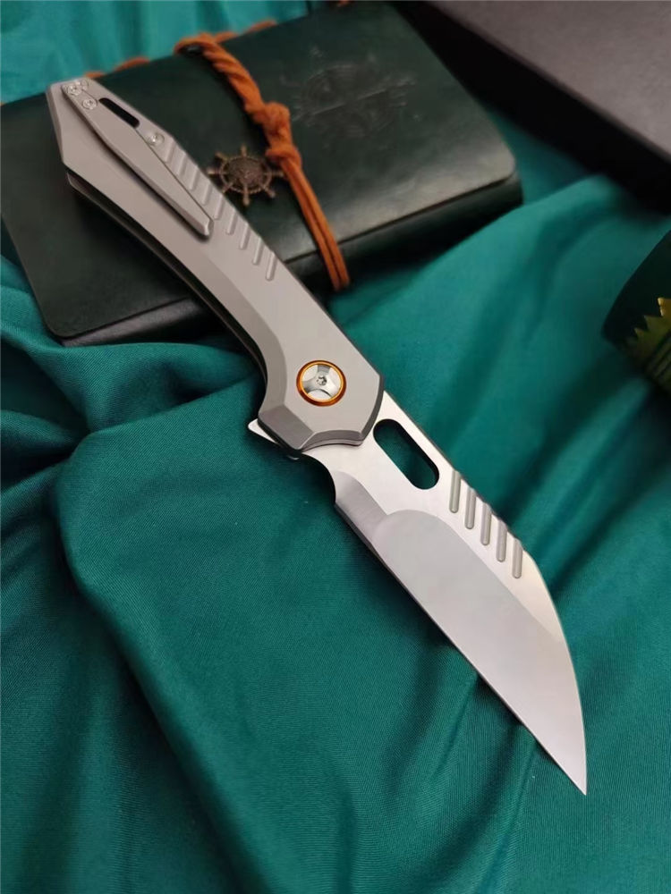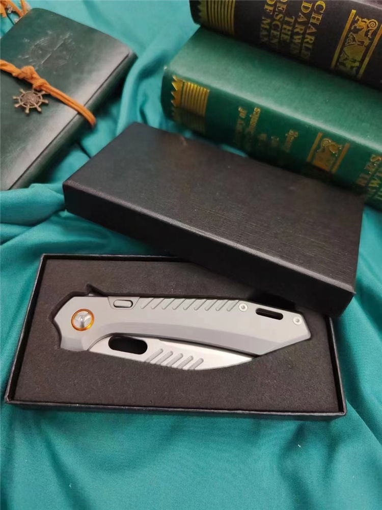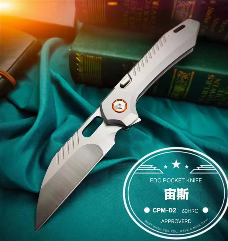 宙斯折刀 全长:220mm 刃长:80mm 柄长:130m 刃宽:30mm最宽处 刃厚:3.8mm 刃材:CPM-D2钢 刀重:268g 毛重:320g (含包装盒) 硬度:59-61HRC 表面:数控磨+精细拉丝砂光 柄材:420LJ不锈钢 结构:滚珠轴承 包装:黑礼盒