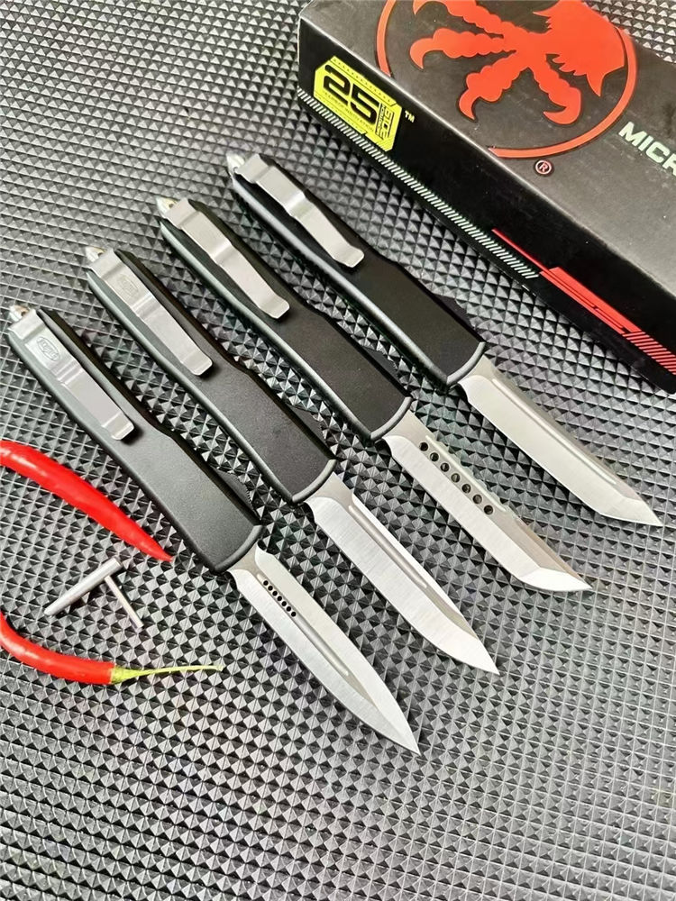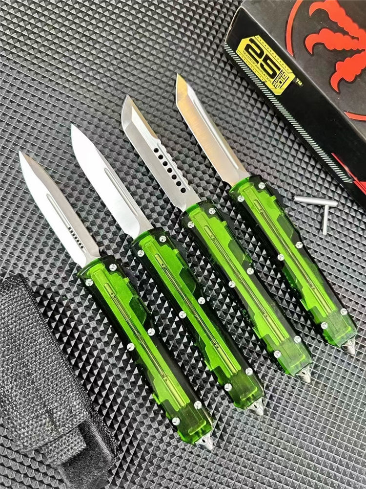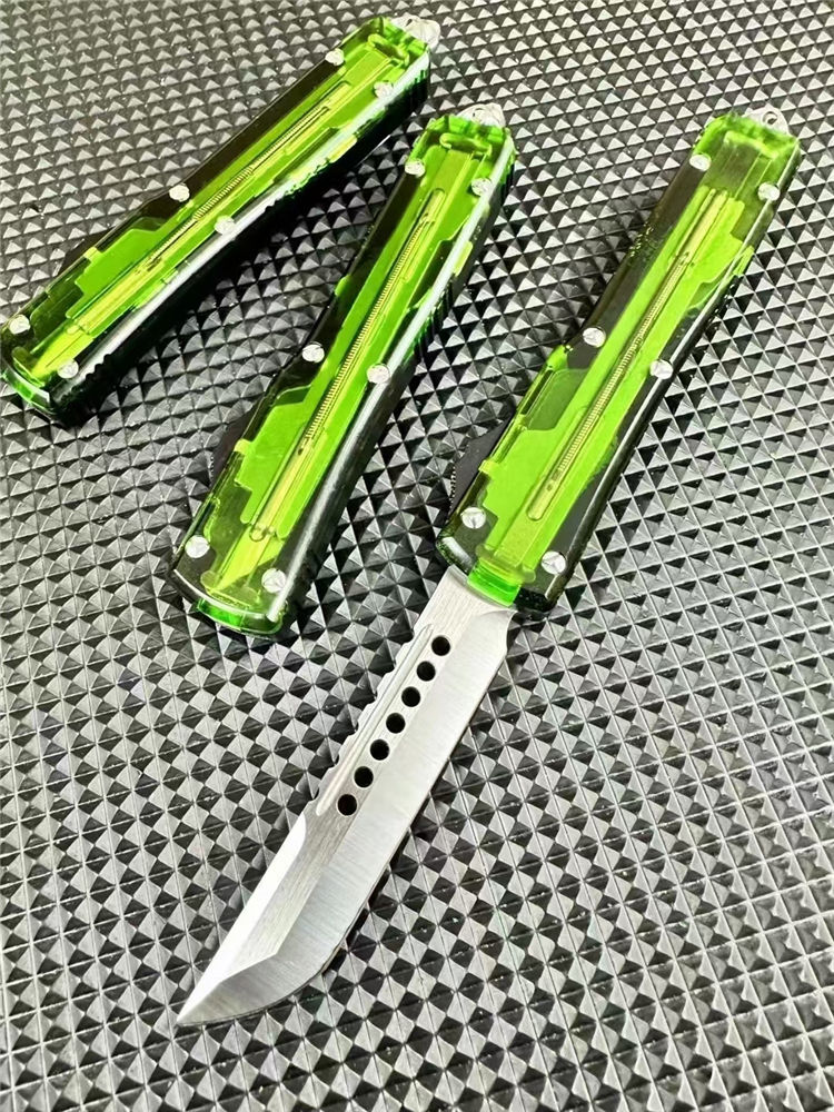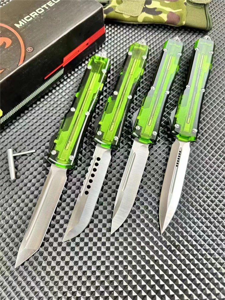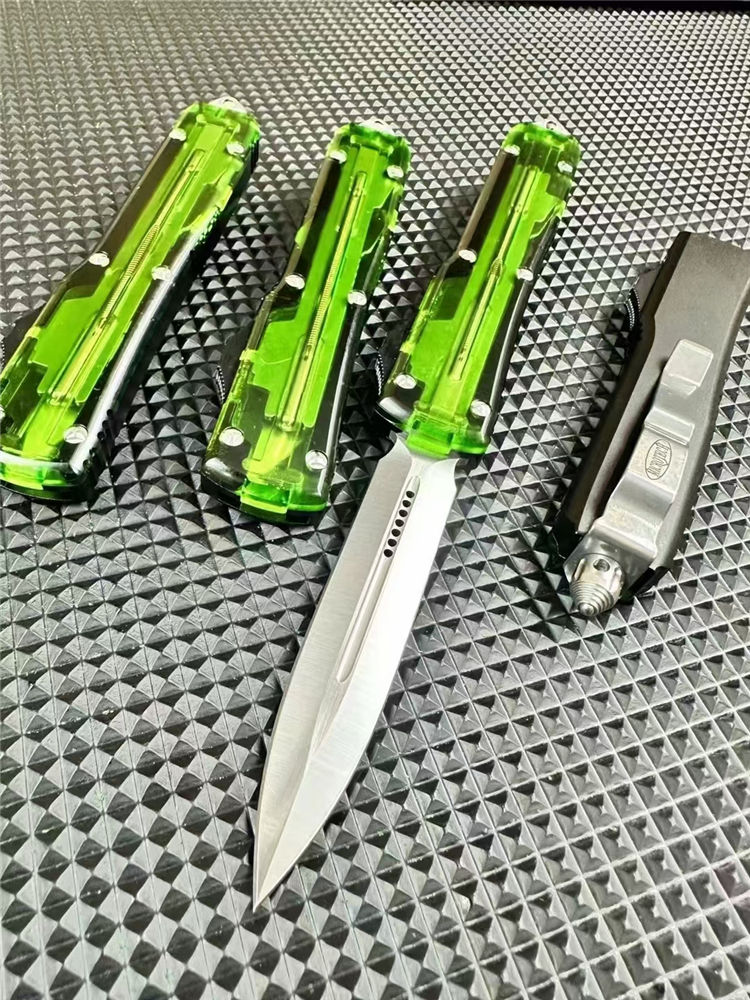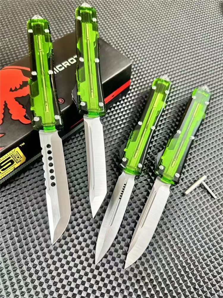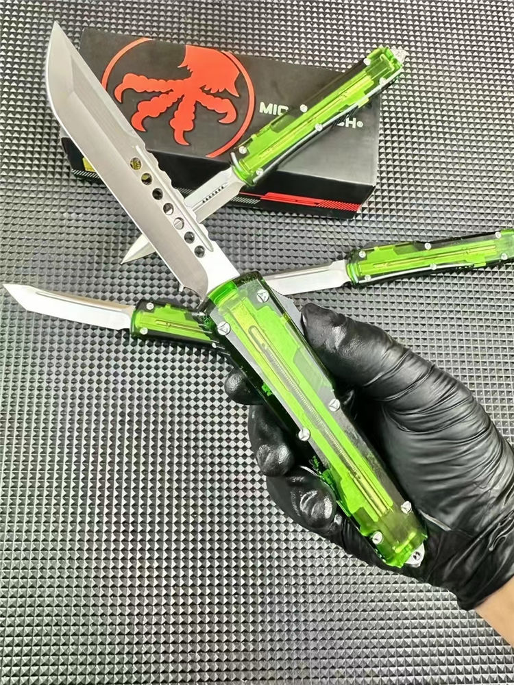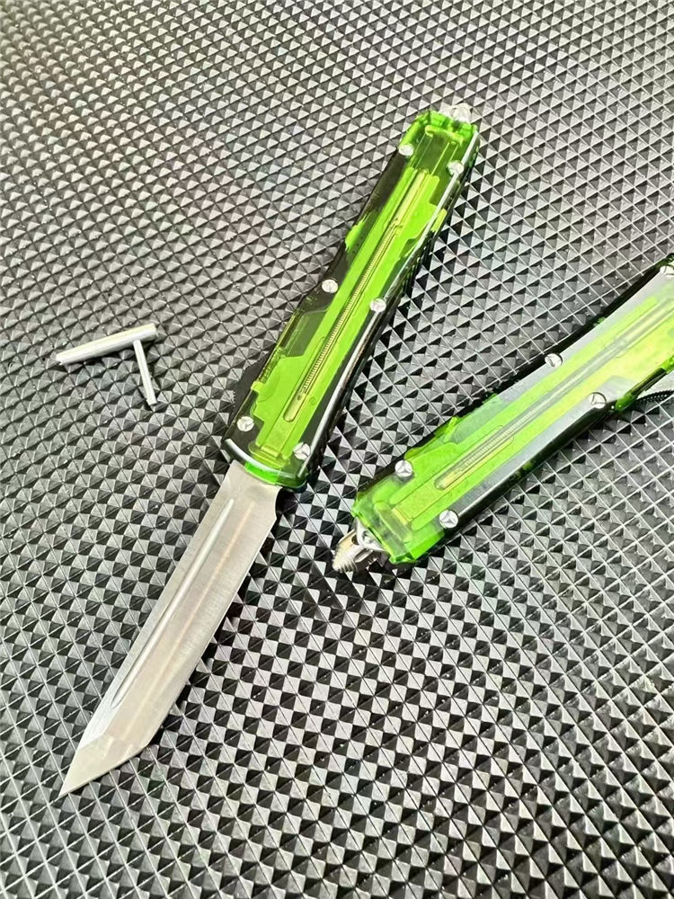 微技术UT85透明直出跳刀 全长:22.5cm 刃长:8.5cm 柄长:12.1cm 刃宽:1.7cm 刃厚:0.3cm 刃材:D2钢 柄材:铝合金+透明亚克力 锁定:推钮锁 重量:200克(含包装) 净重:126克 附件:尼龙套,说明书,彩盒,送拆刀工具 整刀用CNC,电脑锣线切割制作而成,手工,精密度非常高,半透明柄 非常有个性