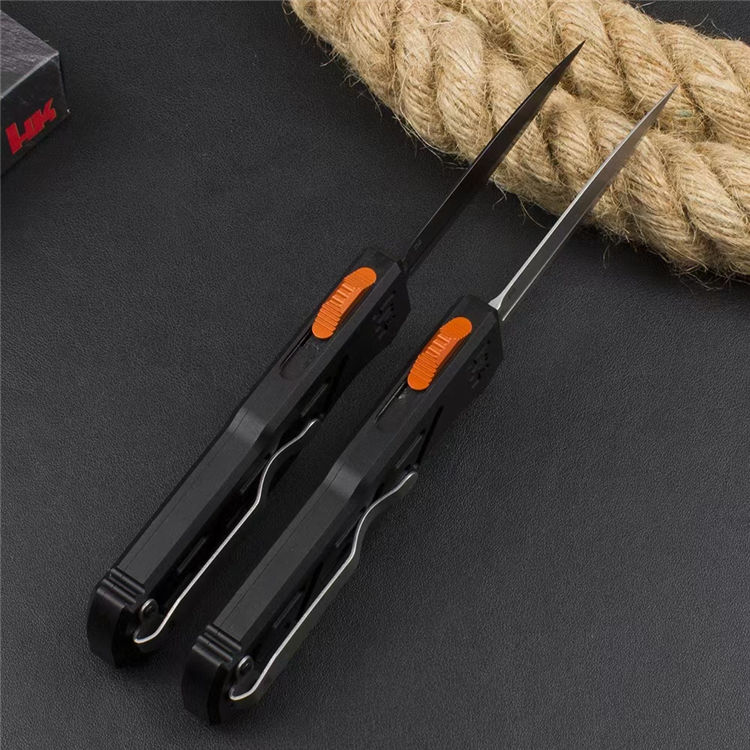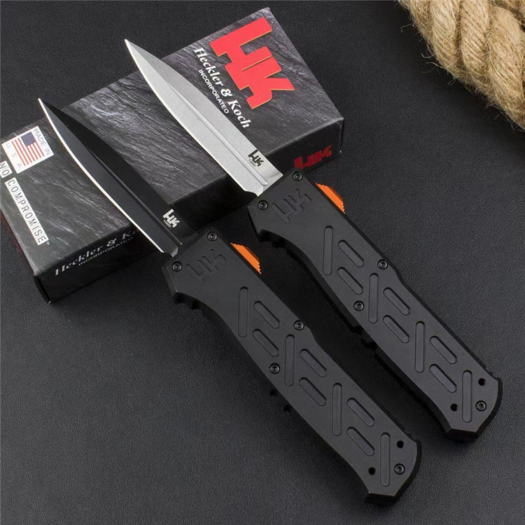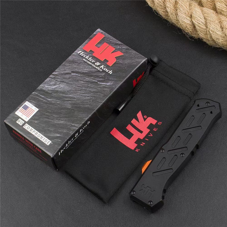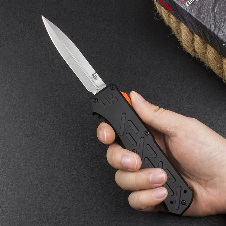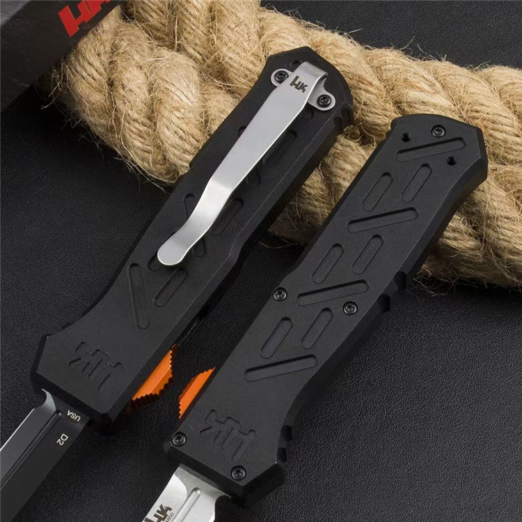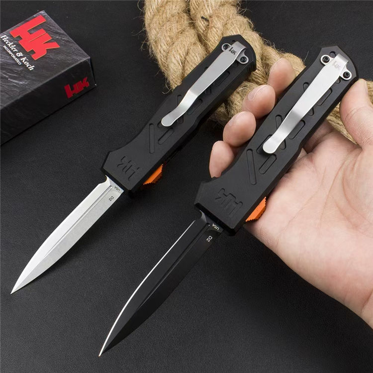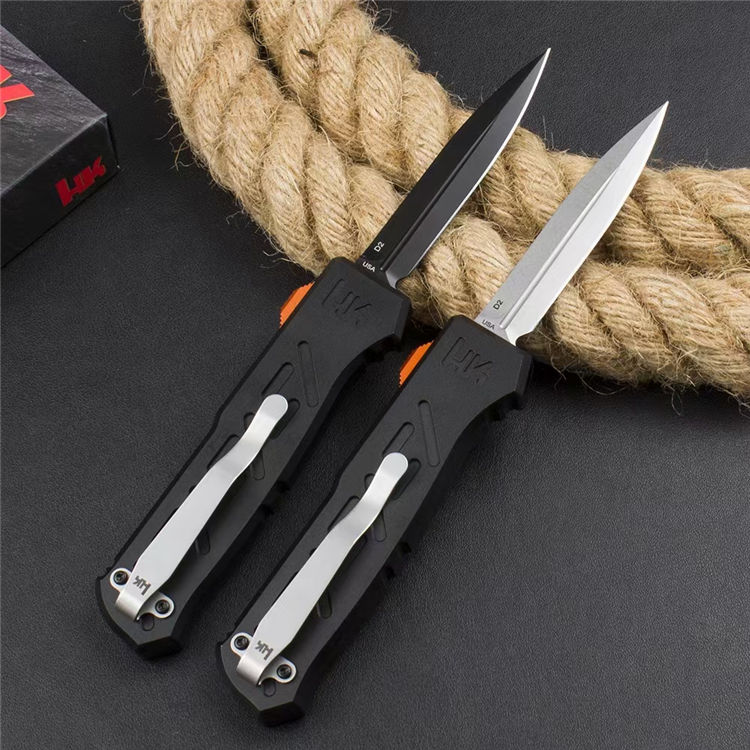 蝴蝶与HK合作款14850直出跳刀 全长:207mm 刃长:80mm 柄长:121mm 刃宽:1.6cm 刃厚:3mm 刃材:D2钢 表面:镀钛或石洗 柄材:6061 T6铝合金+阳极氧化 硬度:59-60 净重:102g 重量:122g(含包装) 附件:原装彩盒 HK绒布袋