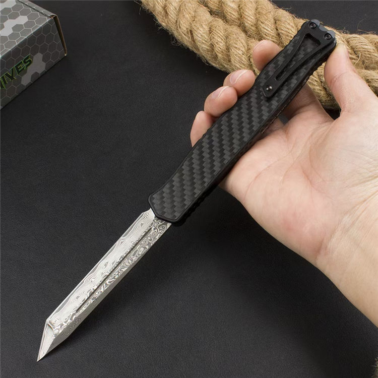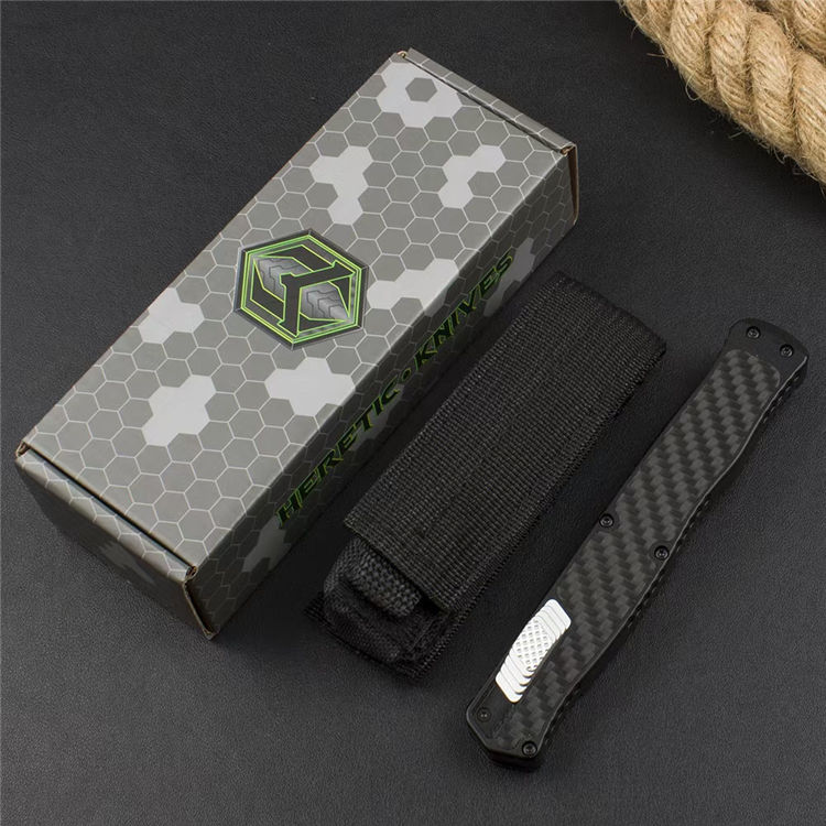 异教徒牧师2直出跳刀 全长:250mm 刃长:100mm 柄长:146mm 刃宽:1.75cm 刃厚:3mm 刃材:大马士革钢 柄材:6061 T6铝合金+碳纤维贴片 背夹:氮化硅精密陶瓷珠背夹 硬度:60HRC 净重:125g 重量:175g(含包装) 附件:原装彩盒 尼龙套 这款 Heretic Cleric II OTF整刀用,CNC,电脑锣,线切割制作而成,手工,精密度非常高,很值得收藏的一把刀