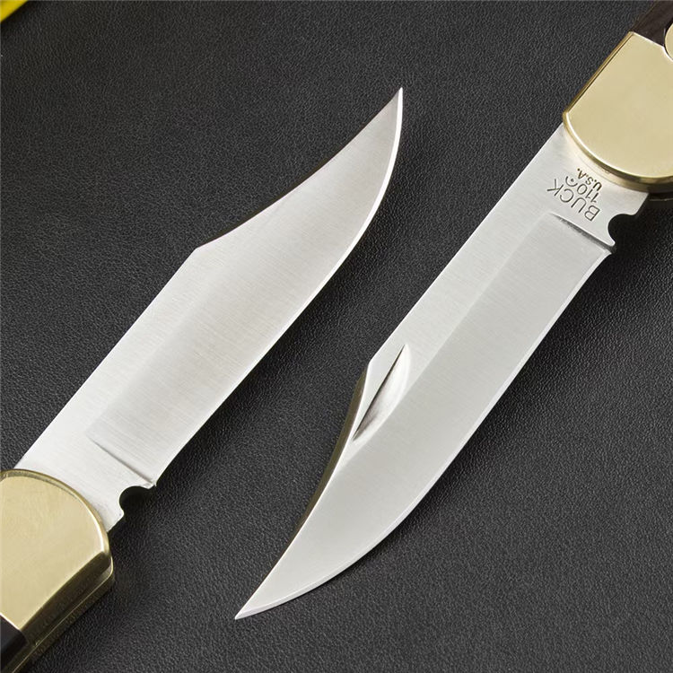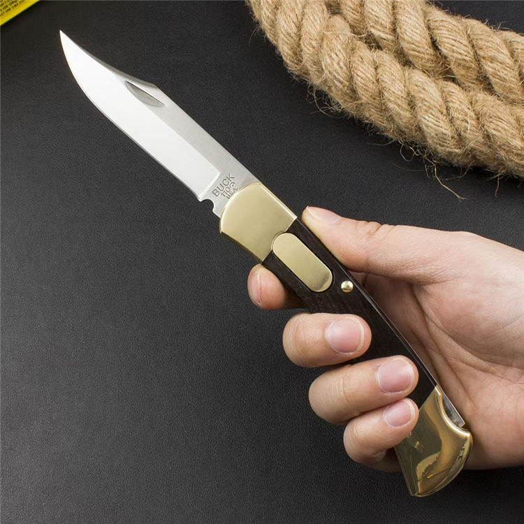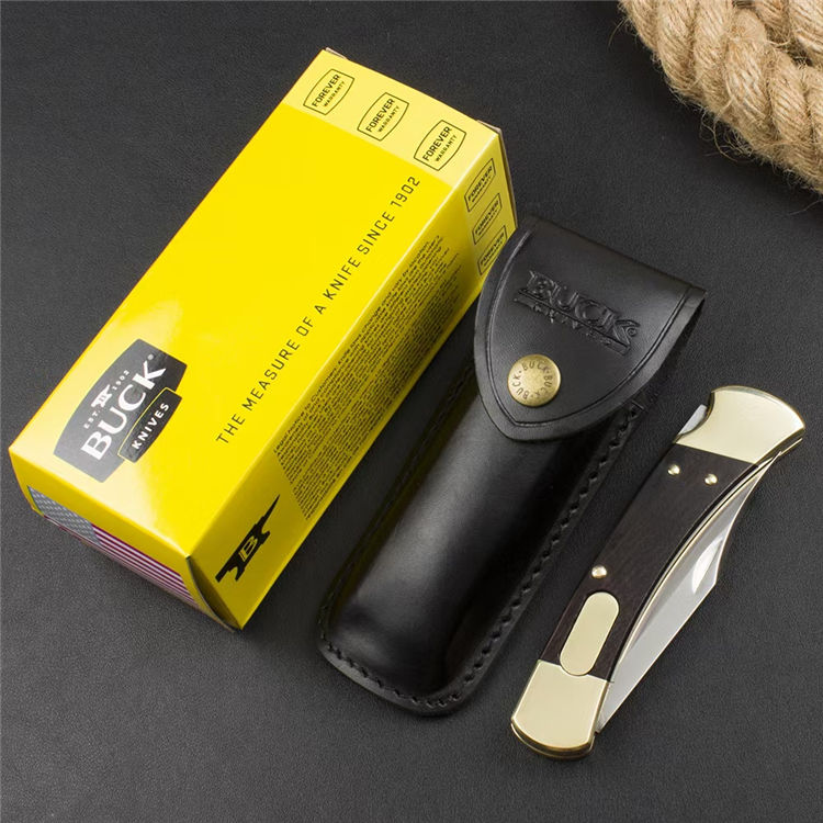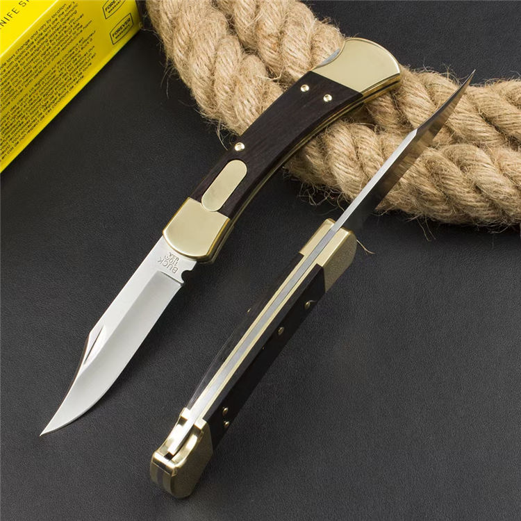 经典版Buck巴克110侧开跳刀 全长:22cm 刃长:9.5cm 刃材:440C 刃厚:0.3cm 硬度:59-60 手柄:一体黄铜+黑檀实木(铜铆钉凸出,有效防滑) 重量:190克 毛重:152克 包装:皮套