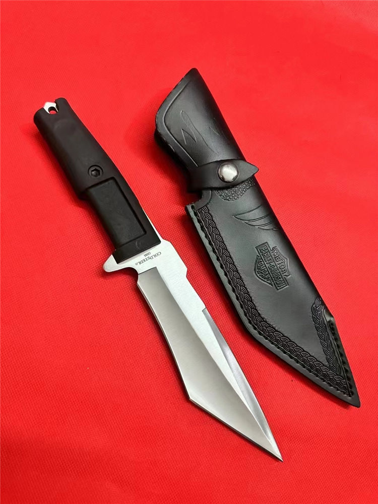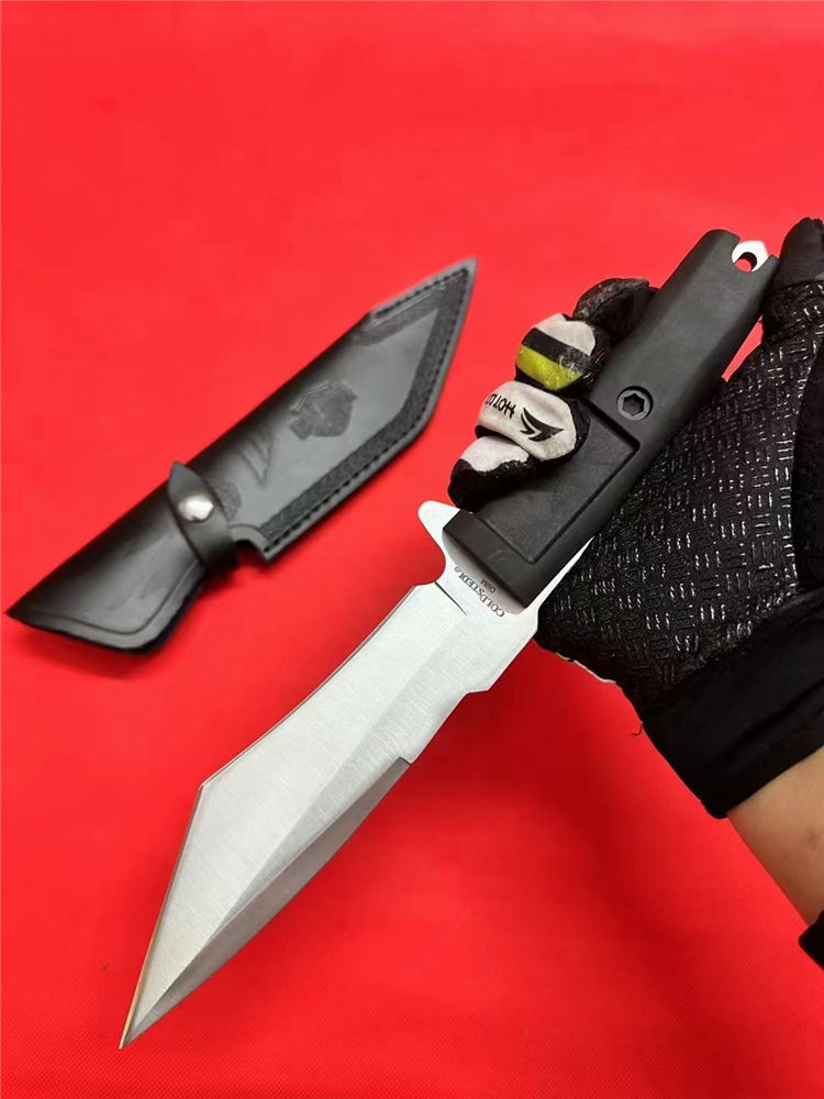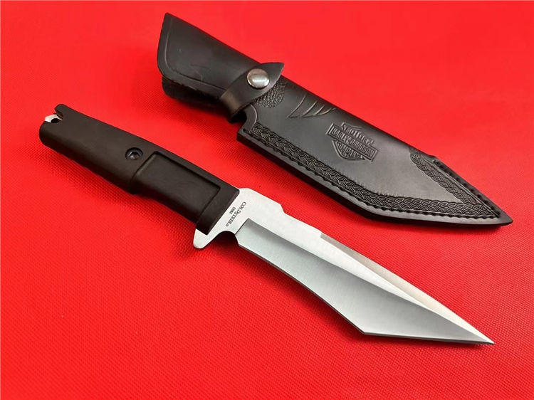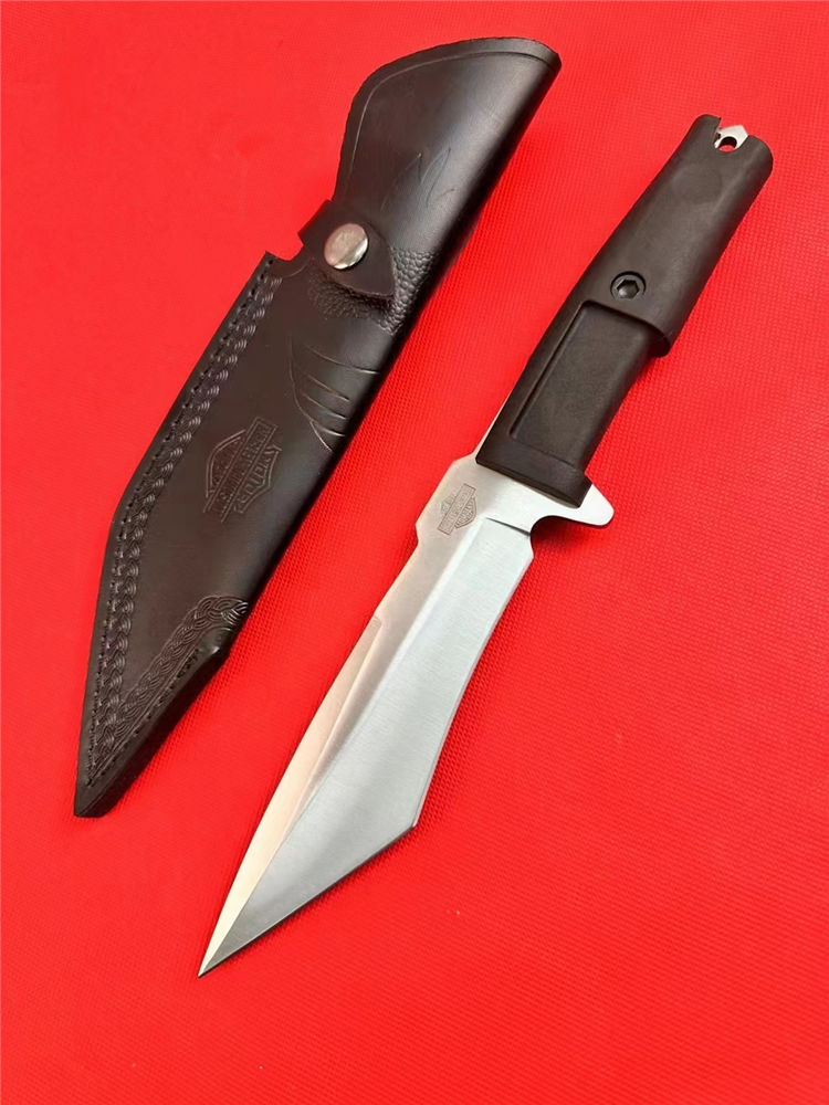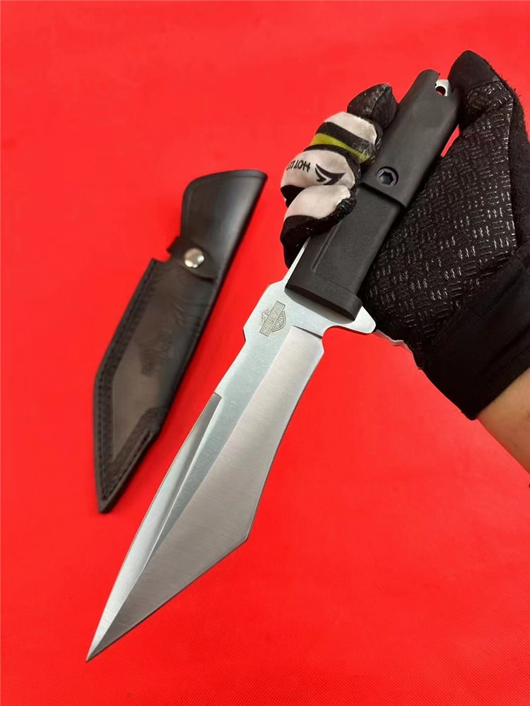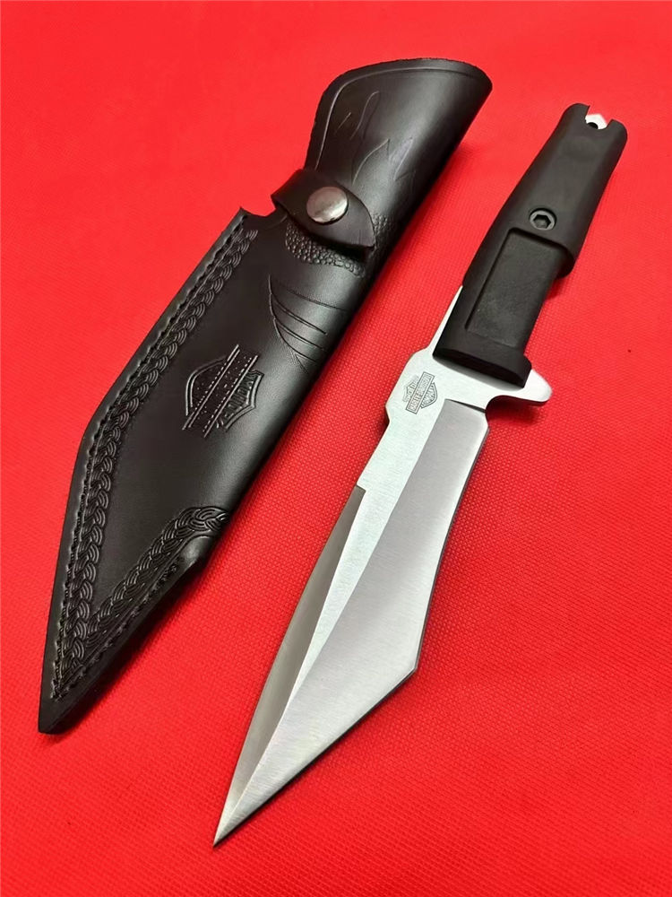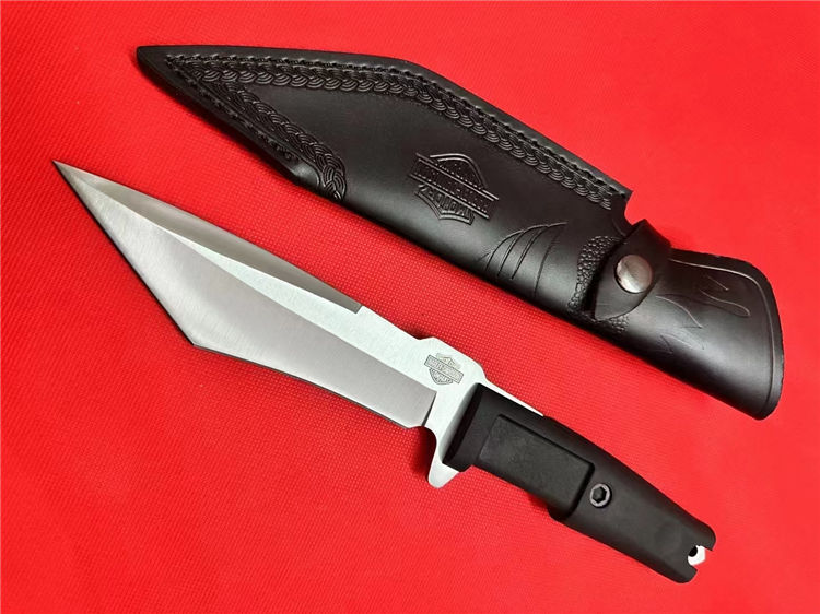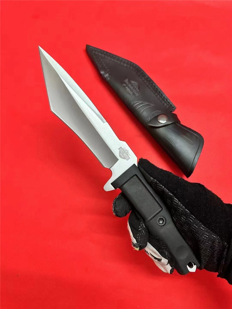 突围者直刀 总长:298MM 刃长:155MM 刃厚:4MM 柄长:127MM 刃材:D2 硬度:60HRC,(真空冷热处理) 柄材:K10 开刃:水冷二次开刃 皮套:牛皮皮套