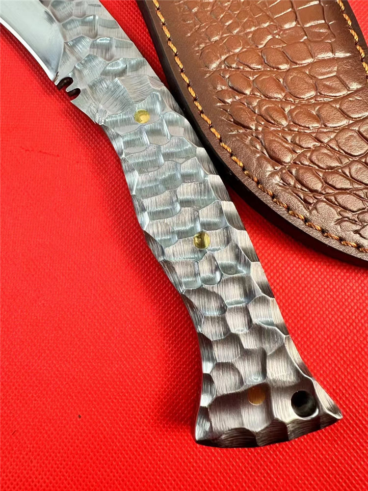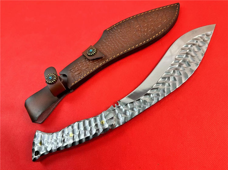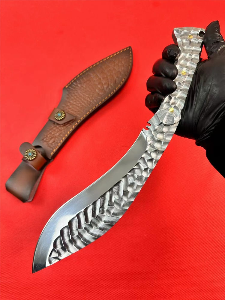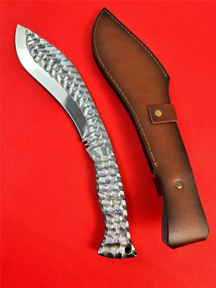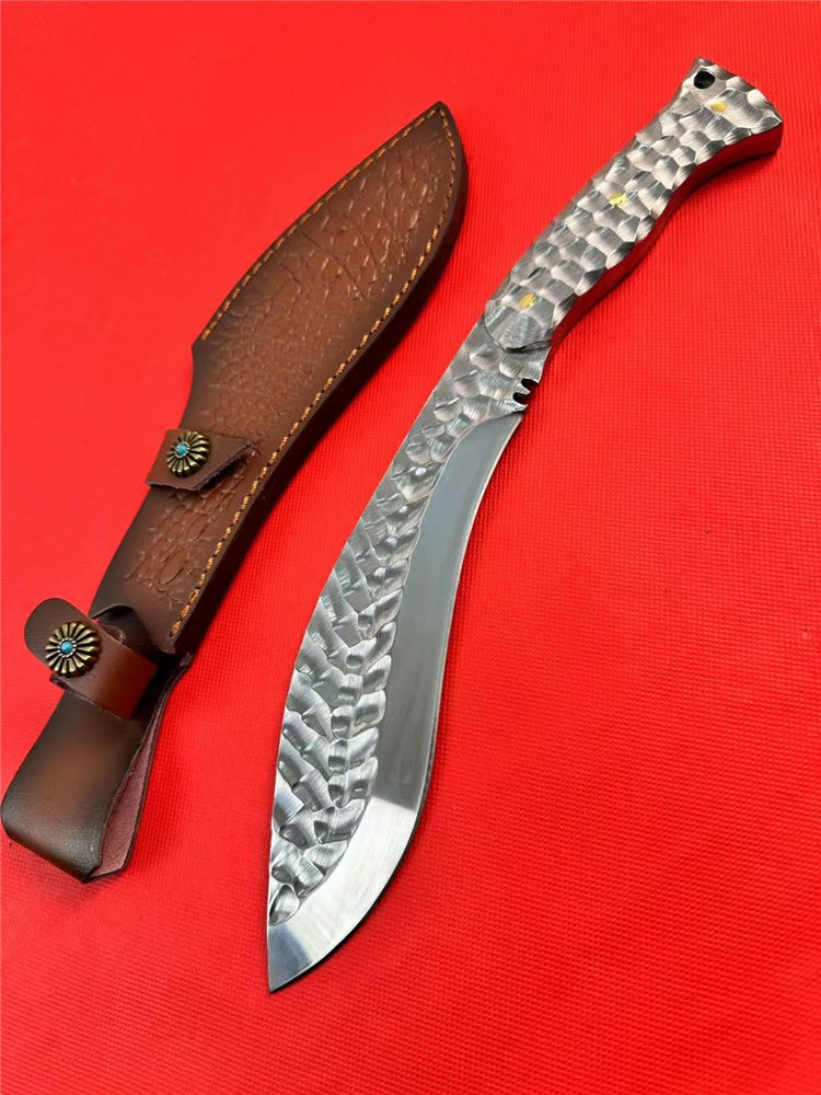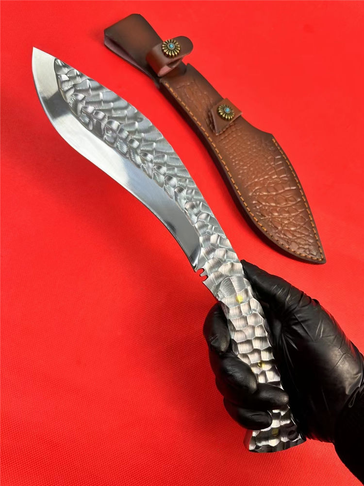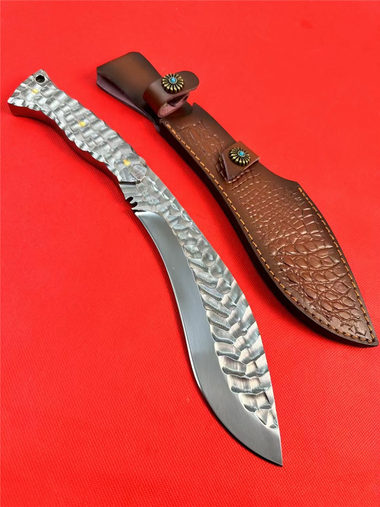 冰魄寒月狗腿弯刀 总长:34.5cm 刃长:20cm 手柄:12.5cm 刃宽:5cm 厚度:5MM 钢材:M32高速钢 硬度:60-61HRC 开刃方式:二次开刃 热处理:真空热处理 柄材:全钢 重量:530g