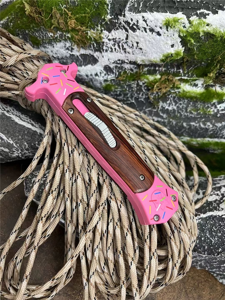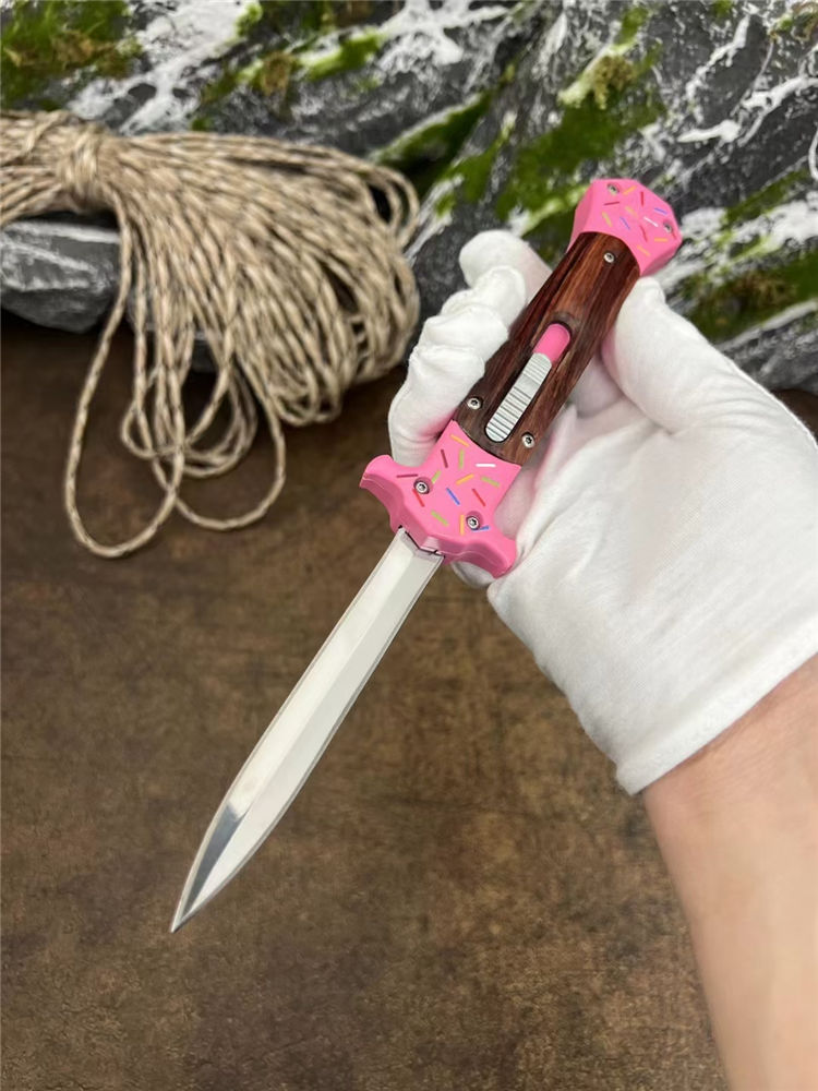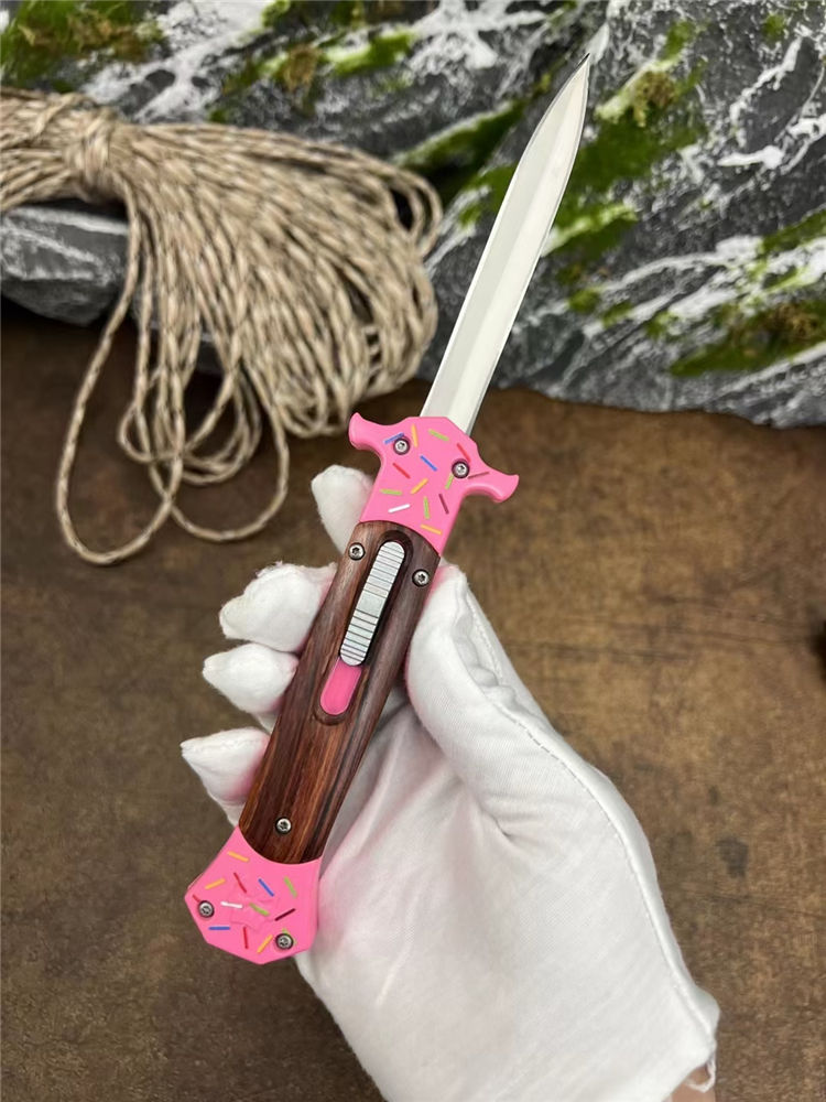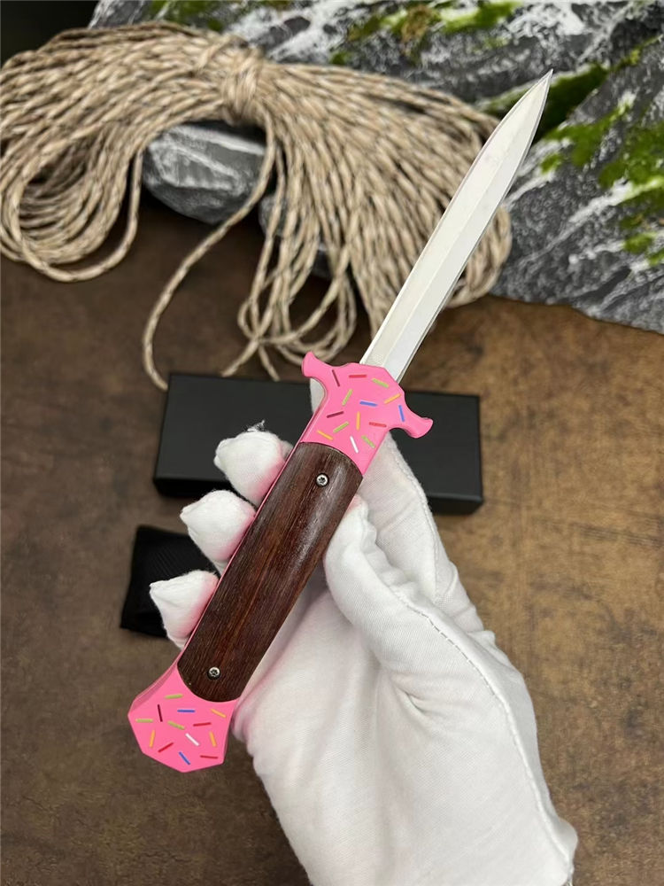 甜甜圈AKC直出跳刀 全长:22.5cm 刃长:9.5cm 刃厚:2.7mm 刃材:440C 表面:镜光 裸重:280克 款式:酸枝木➕甜甜圈配色 柄材:锌合金柄酸枝木贴片 附近:包装及尼龙布套