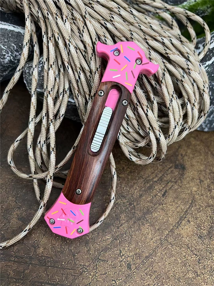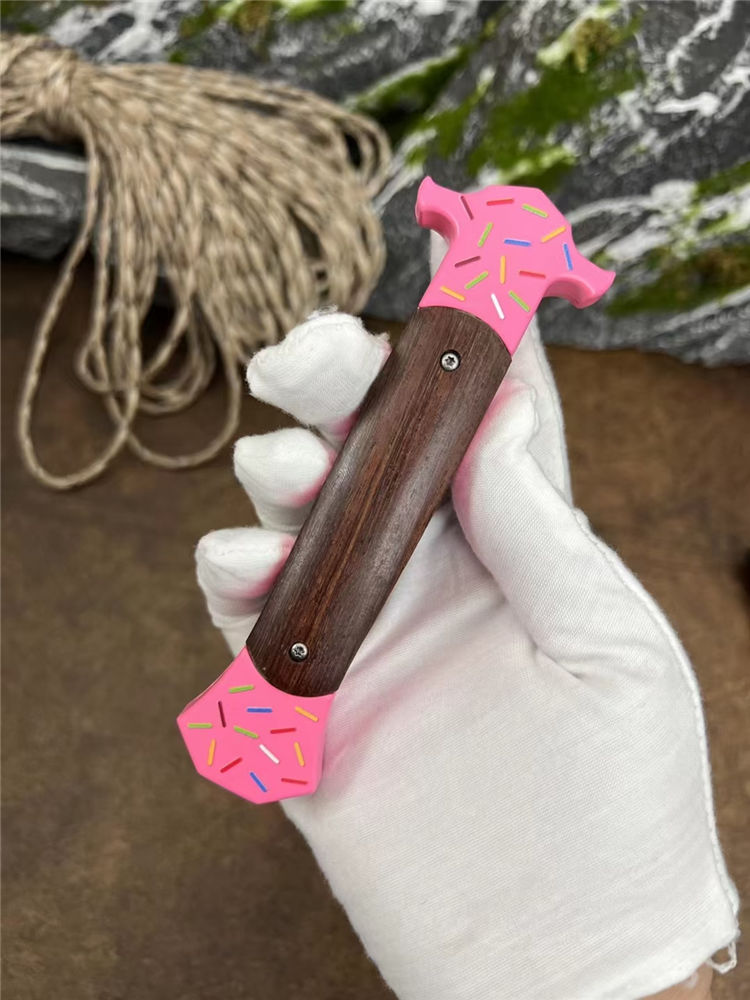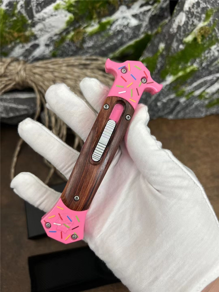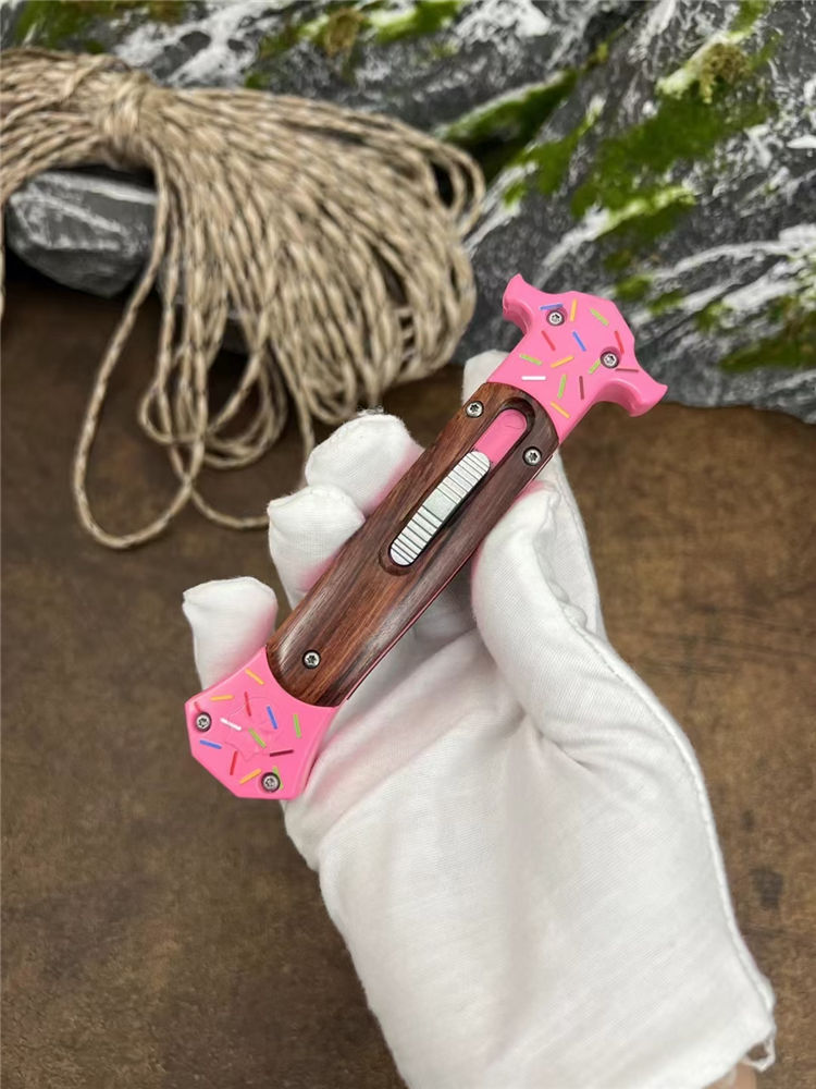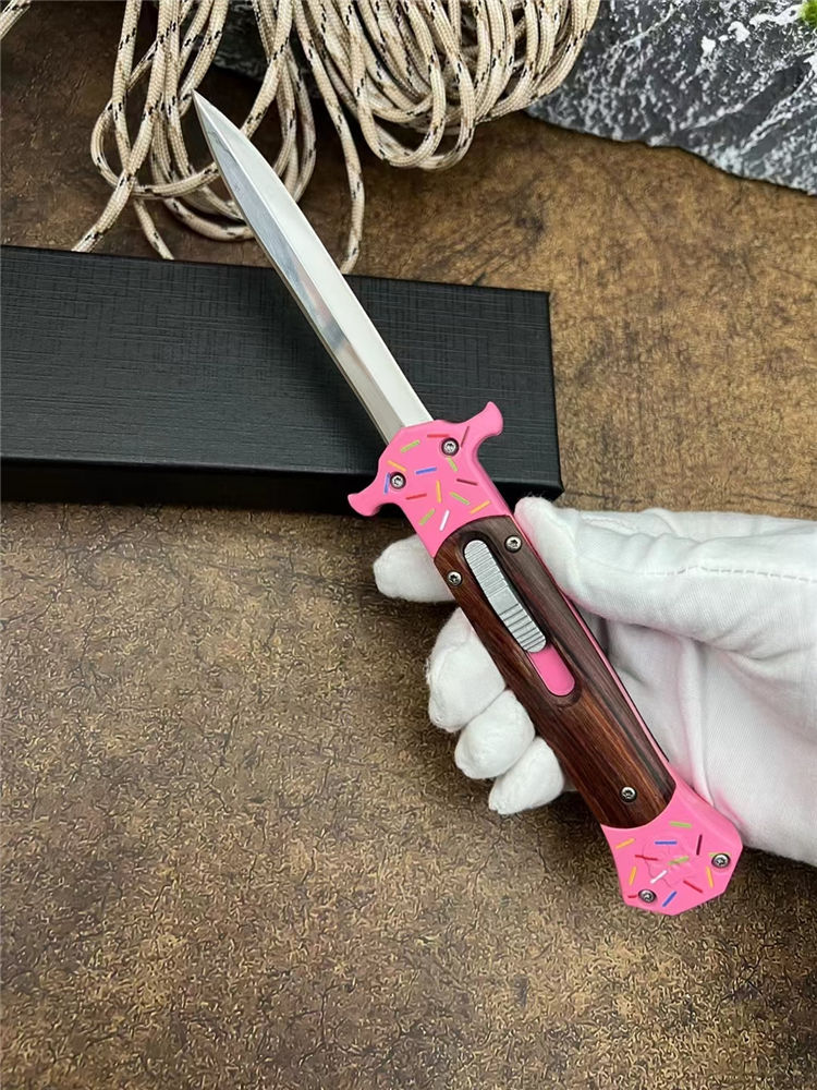 甜甜圈AKC直出跳刀 全长:22.5cm 刃长:9.5cm 刃厚:2.7mm 刃材:440C 表面:镜光 裸重:280克 款式:酸枝木➕甜甜圈配色 柄材:锌合金柄酸枝木贴片 附近:包装及尼龙布套