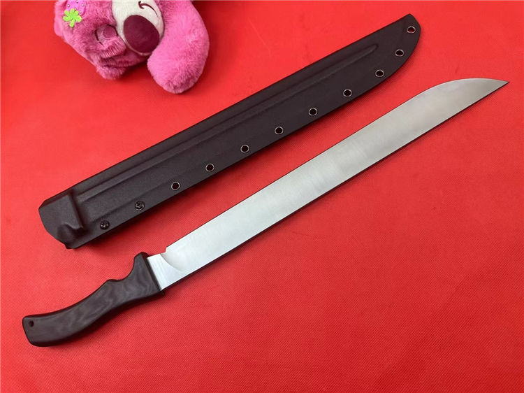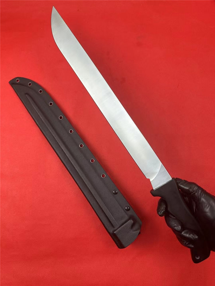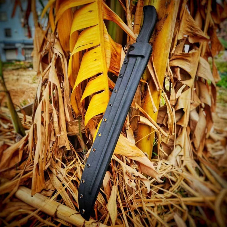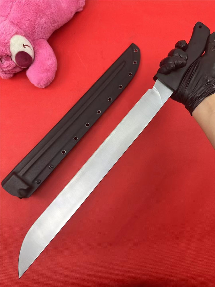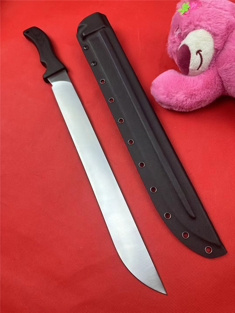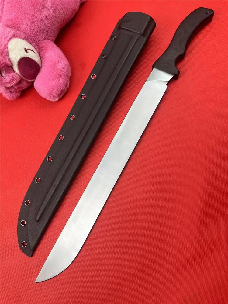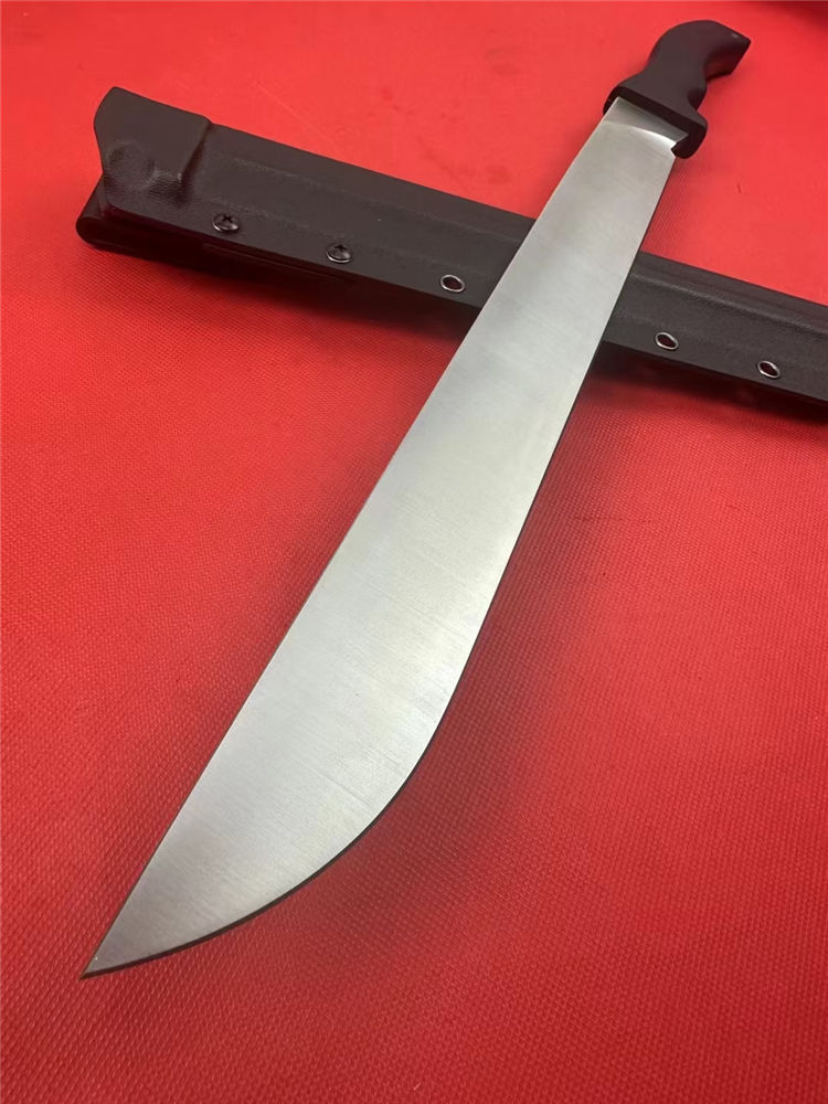 美国疯狗MAD DOG疯狗终极版直刀 总长:52.5CM 刃长:39CM 刃厚:5.8MM 刃宽:3.9CM 重量:550g 钢材:进口A8钢 热处理:专业真空热处理 硬度:60-61HRC 表面:缎面砂光 开刃方式:水冷多次开刃 柄材:黑色G10复合材质全包手柄 刀套:进口K鞘+活动夹子 包装:出口黄色简包装